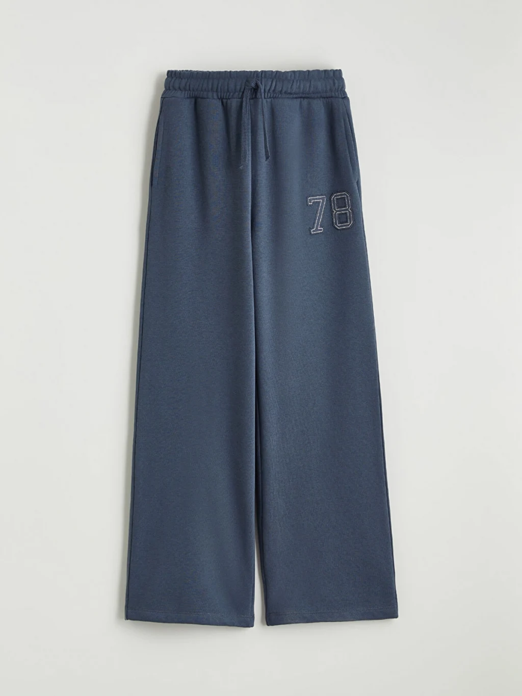Geniş paçalı kız çocuk eşofman altı, beli lastikli ve ayarlanabilir iplidir. Yan cepli modelin paçasında rakam detayı bulunur.