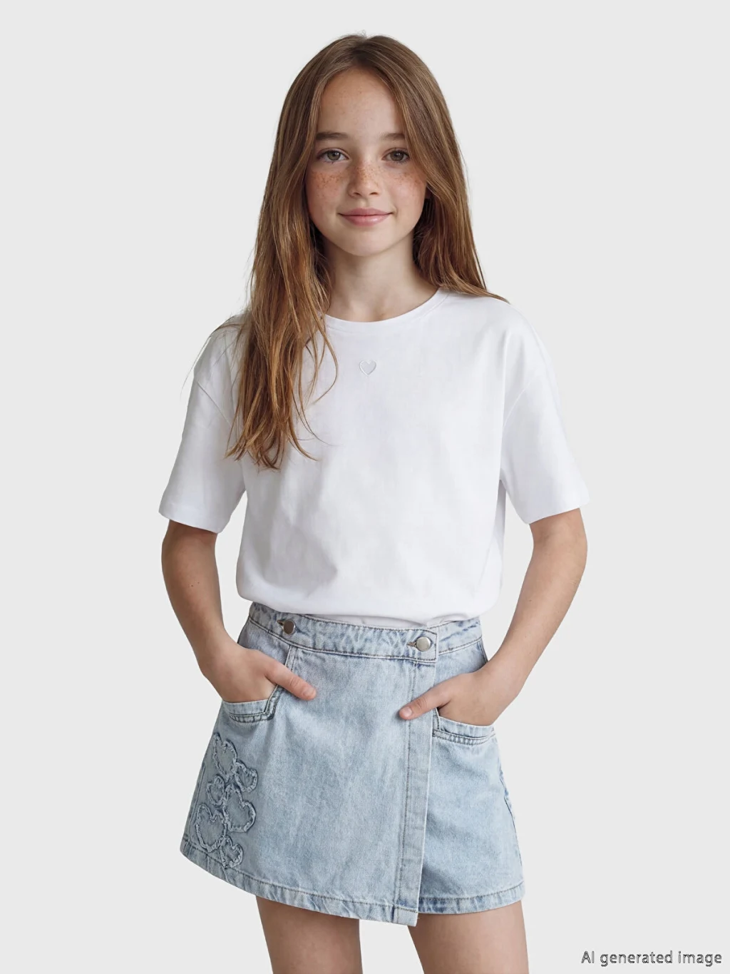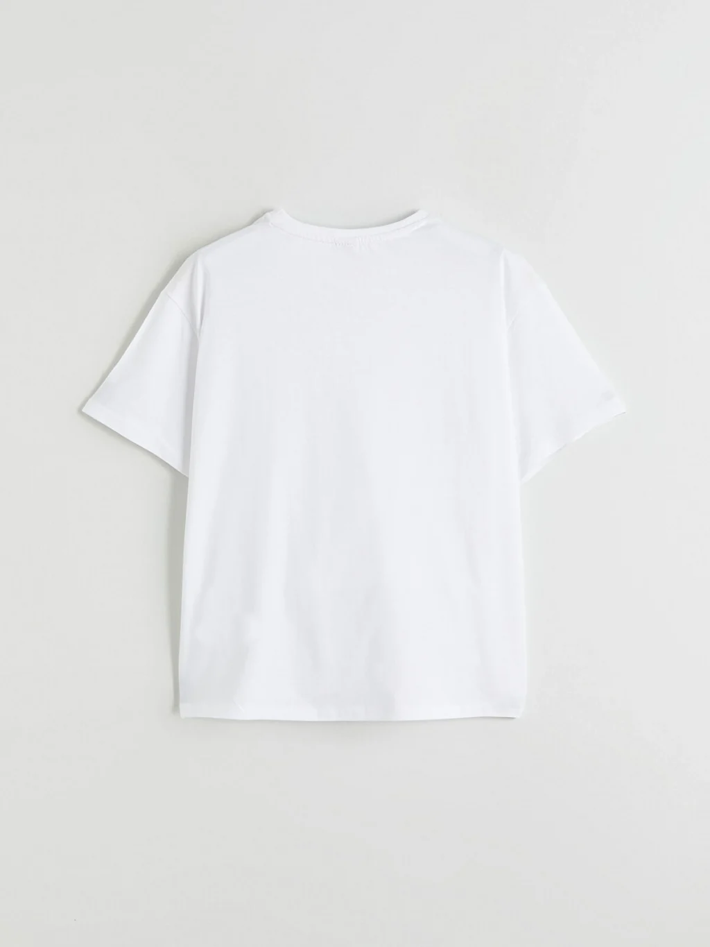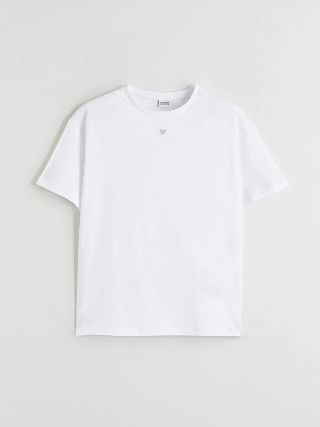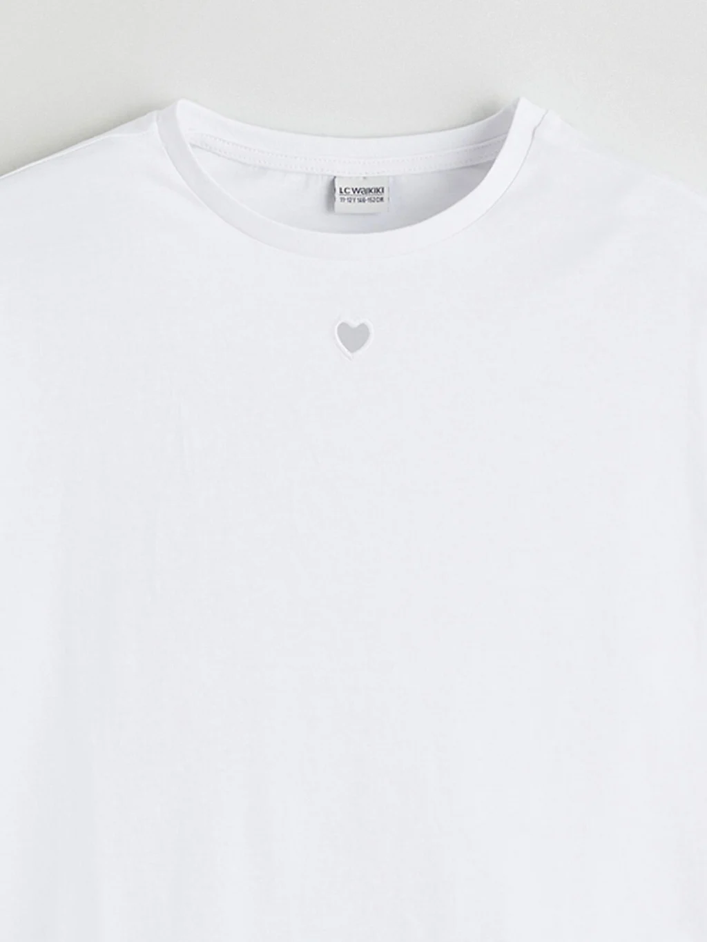 Bisiklet yaka ve kısa kollu kız çocuk tişört, %100 pamuk penye kumaştan üretilmiştir. Bol kalıplıdır ve yaka altında kalp baskısı bulunur.