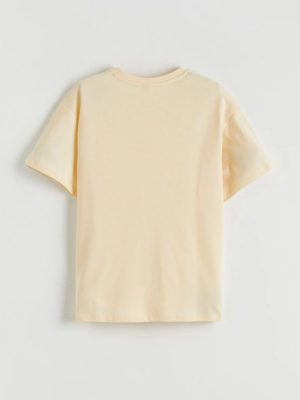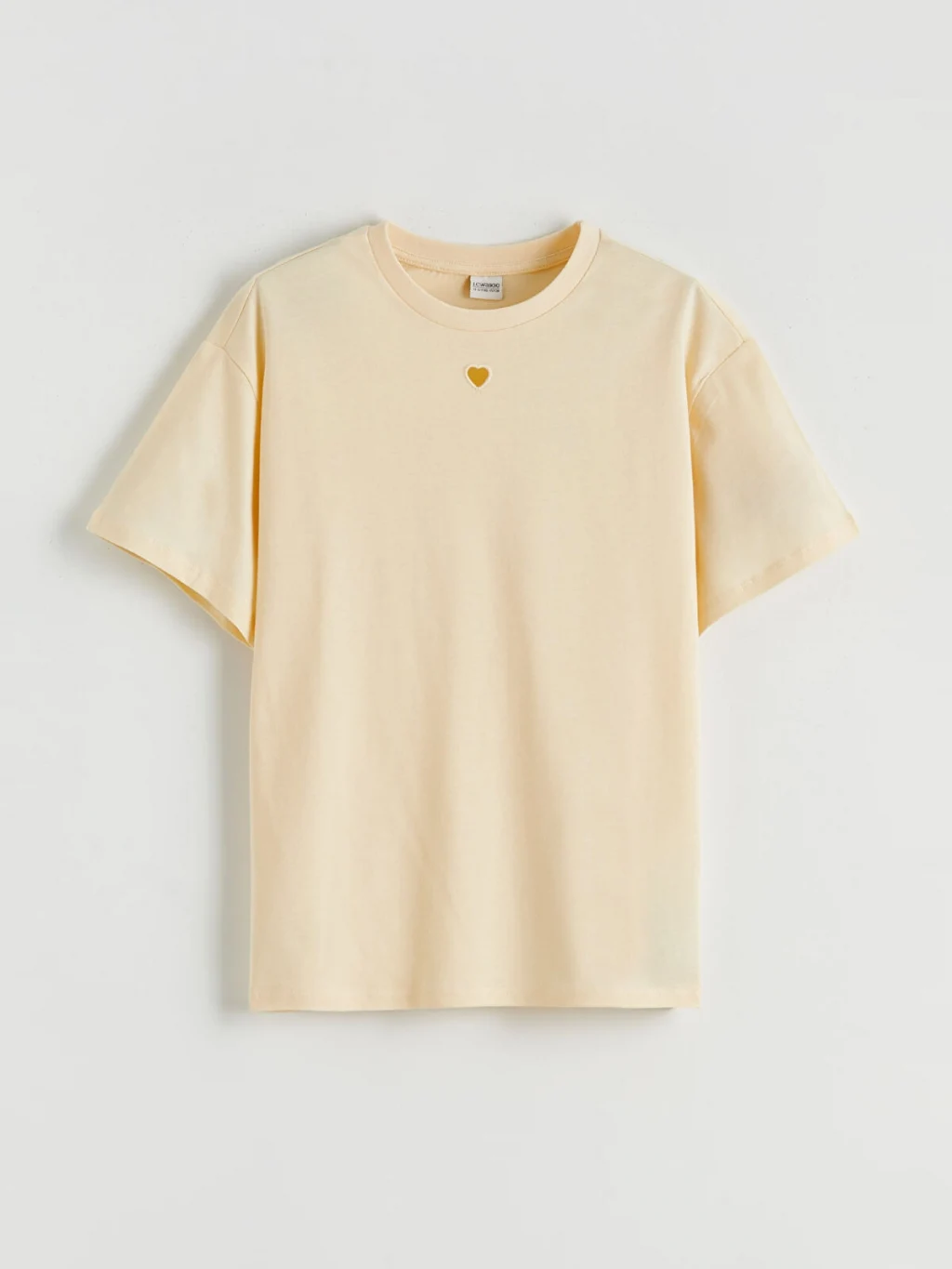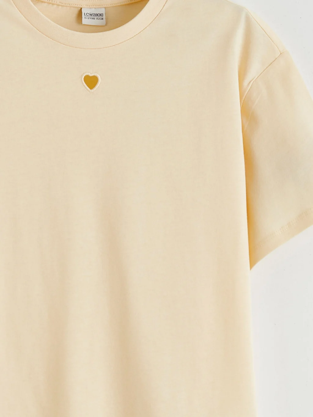 Bisiklet yaka, kısa kollu kız çocuk tişört, %100 pamuk penye kumaştan üretilmiştir. Bol kalıplıdır ve yaka altında kalp şeklinde kesik detayı bulunur.
