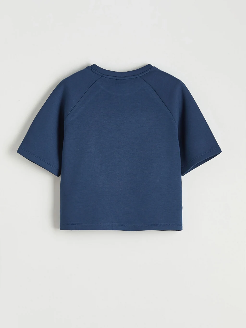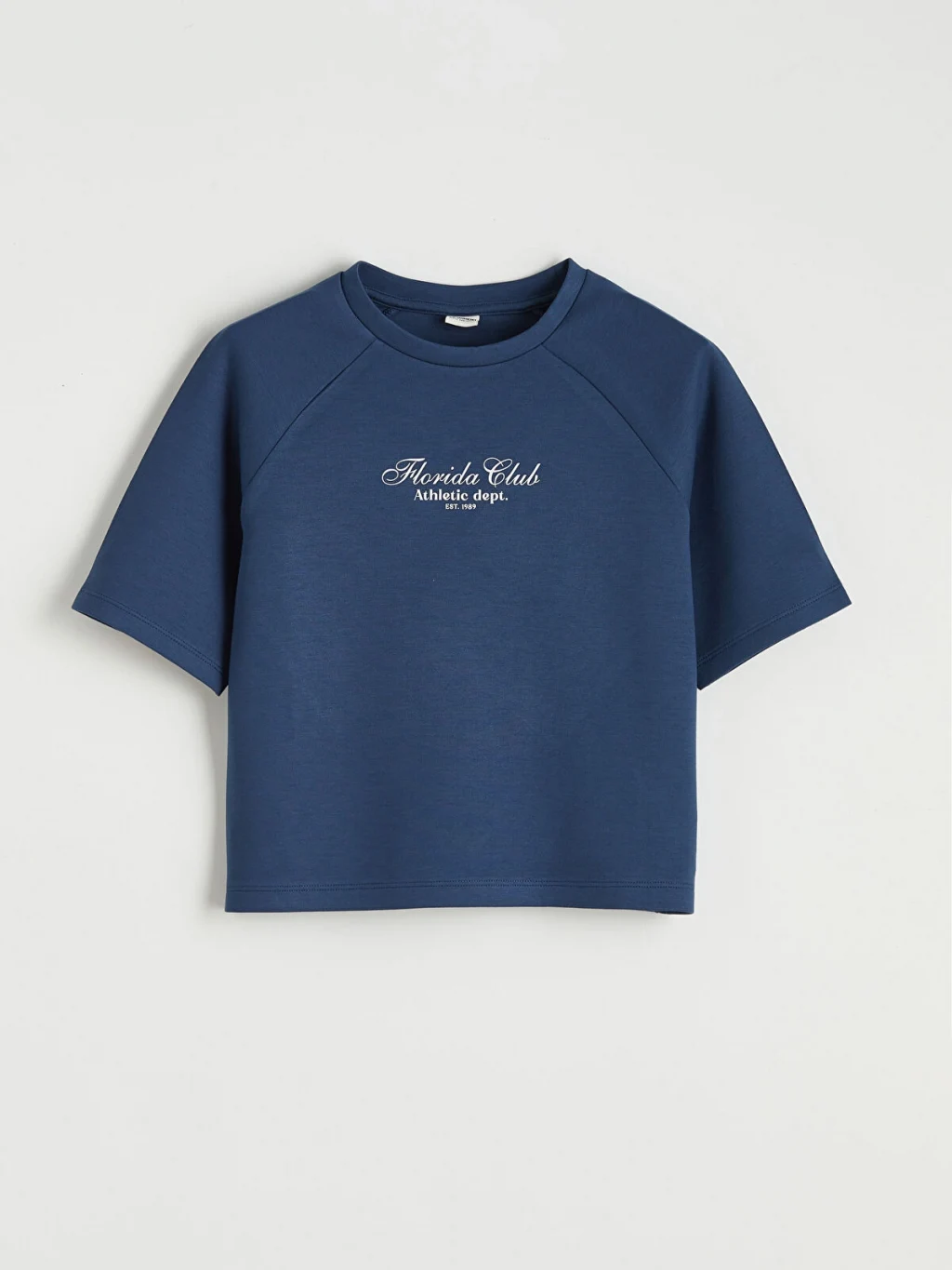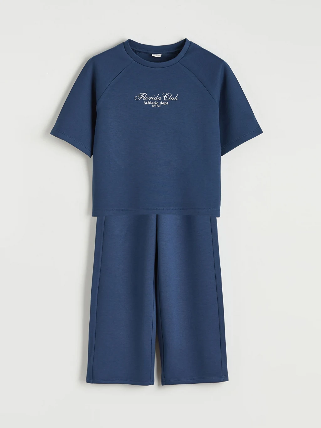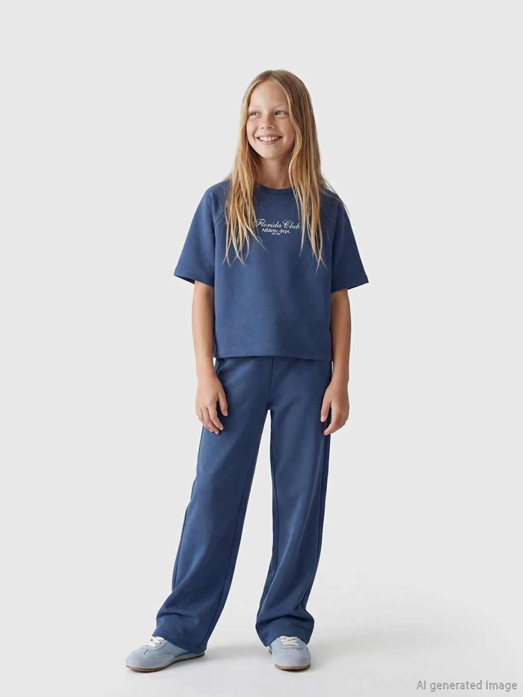 Kız çocuk takım, bisiklet yaka, kısa ve reglan kollu, önü baskılı tişört ve geniş paça eşofman altından oluşur.