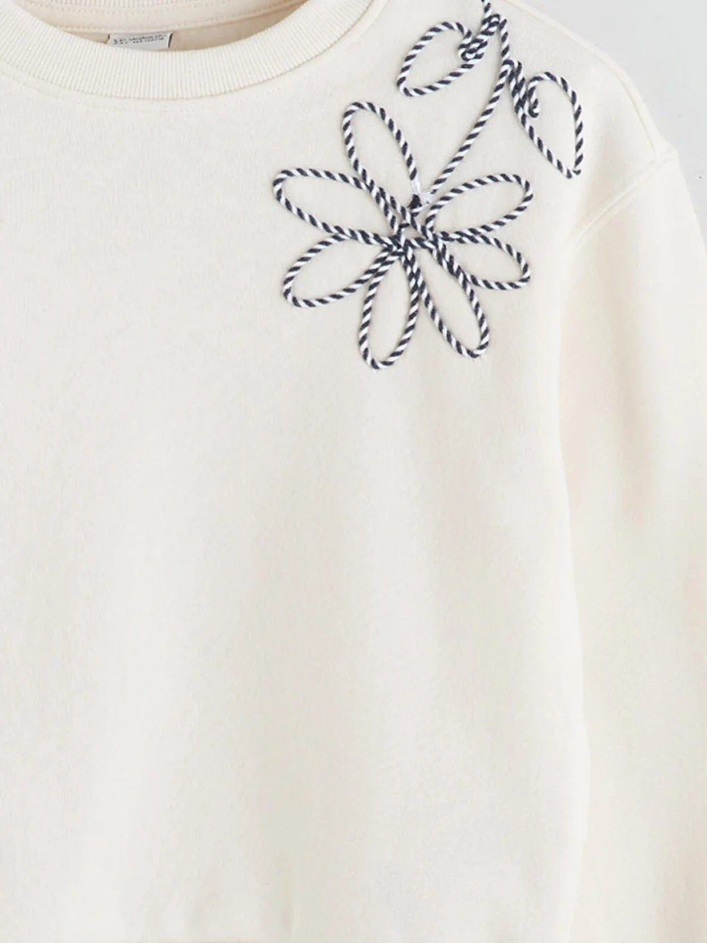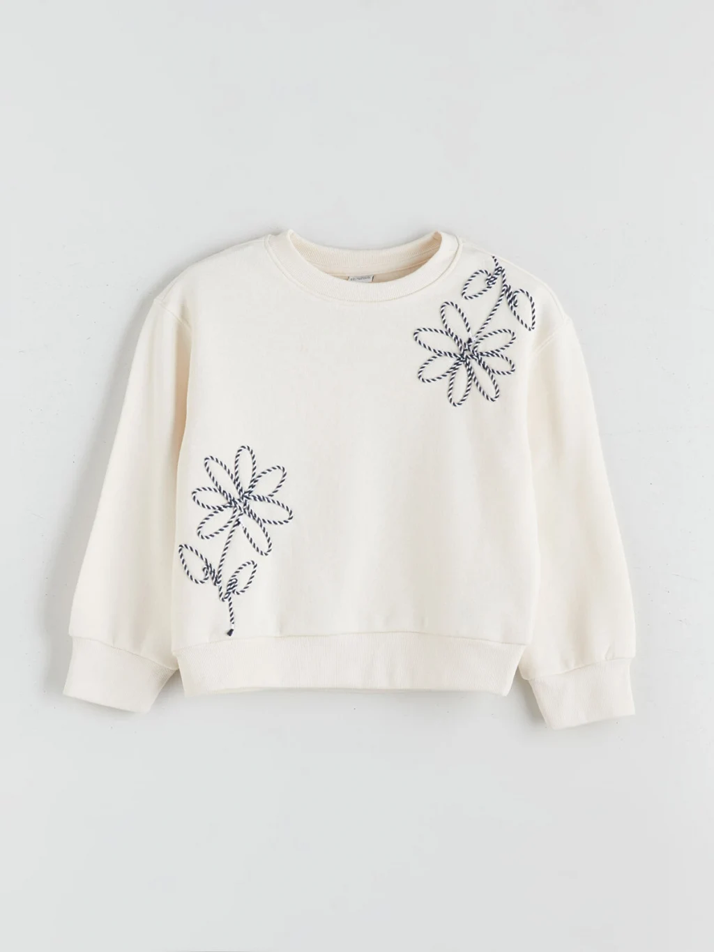 Bisiklet yaka ve uzun kollu kız çocuk sweatshirt, kalın 3 iplik şardonlu kumaştan üretilmiştir. Önü çiçek nakışlıdır.