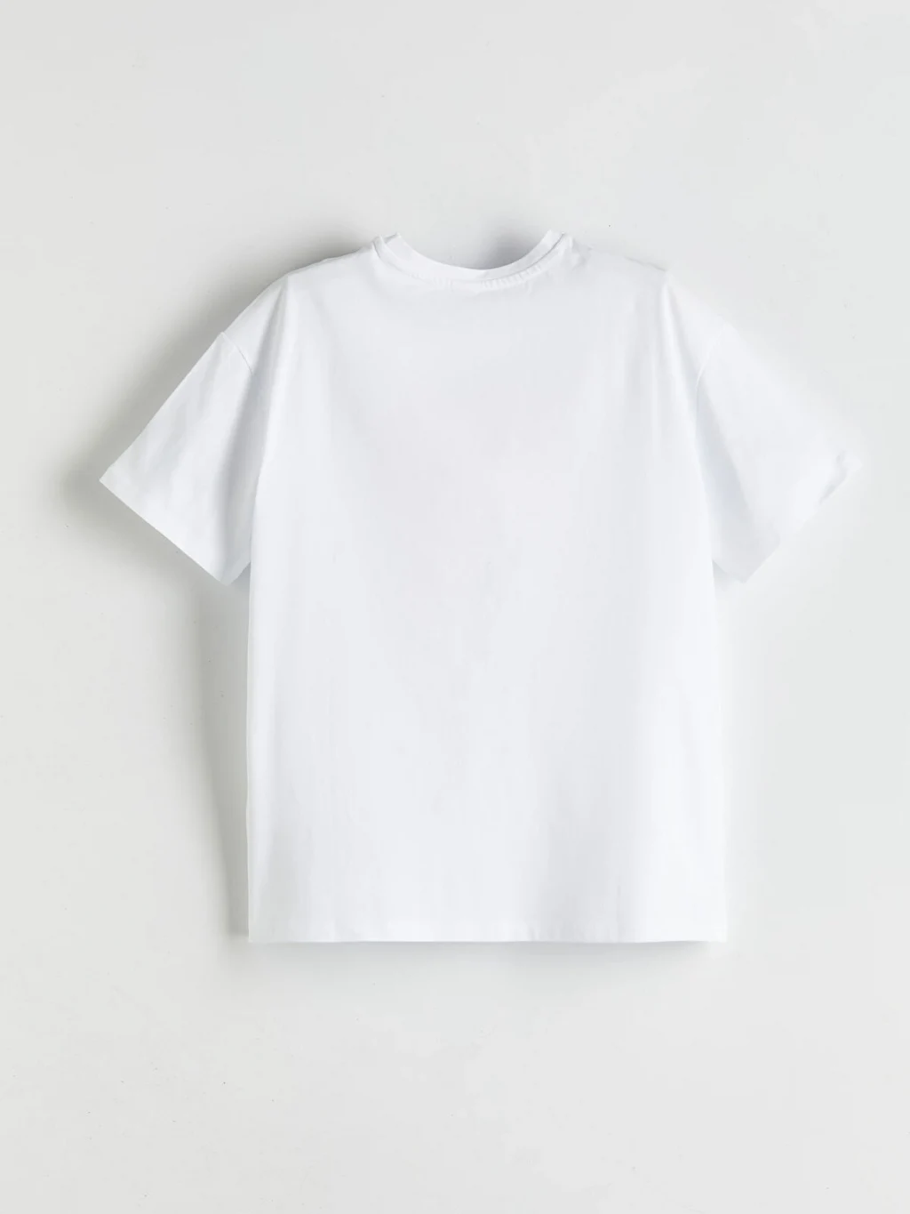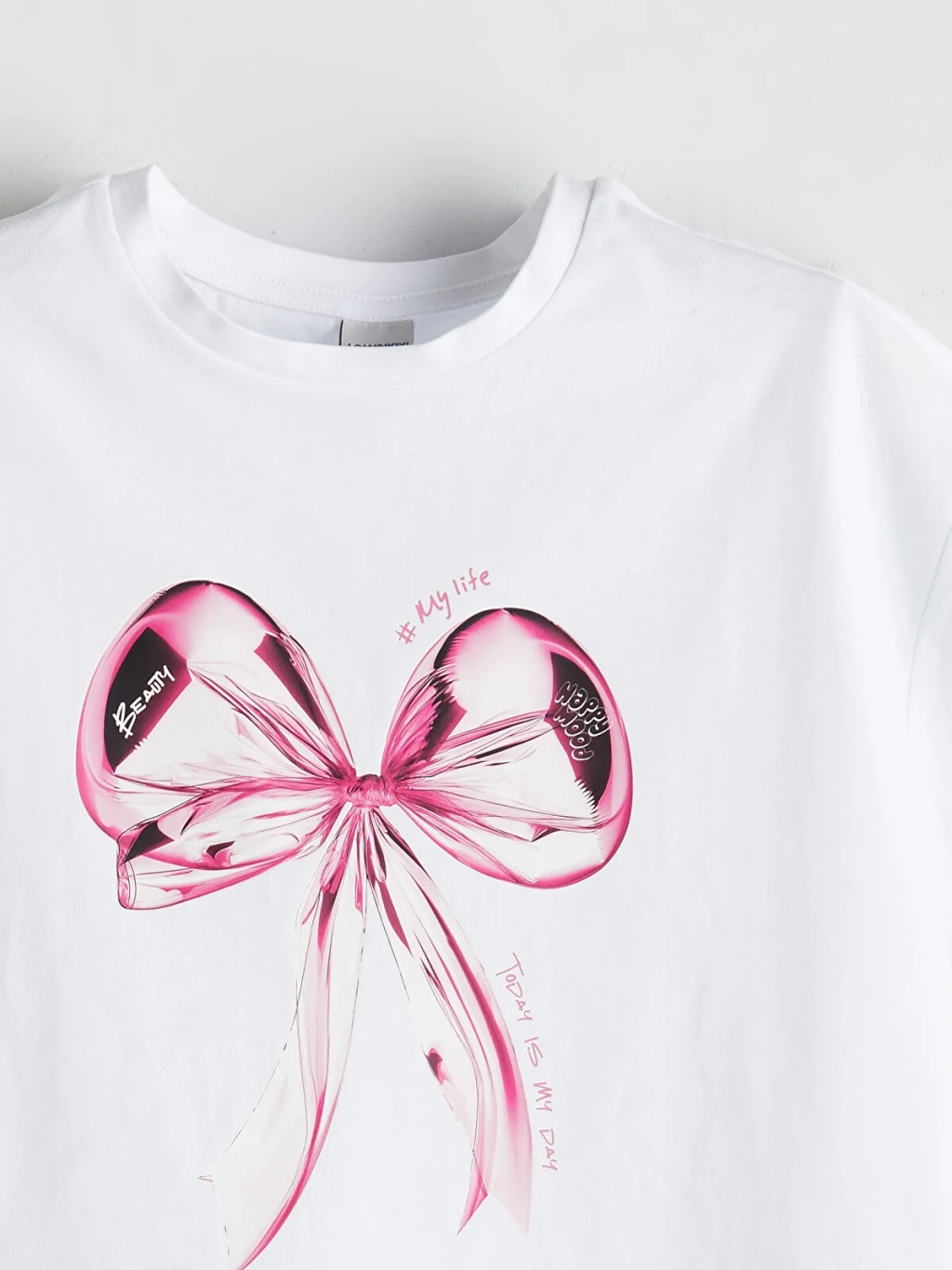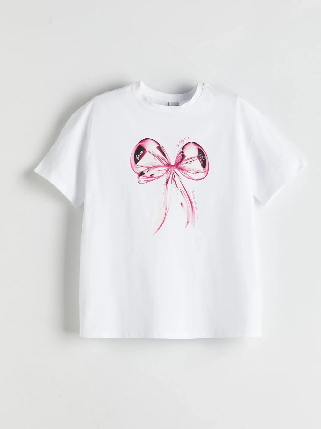 Kız çocuk tişört, %100 pamuklu penye kumaştan üretilmiştir. Bisiklet yaka, kısa kollu ve bol kalıplı ürünün önü fiyonk baskılıdır.