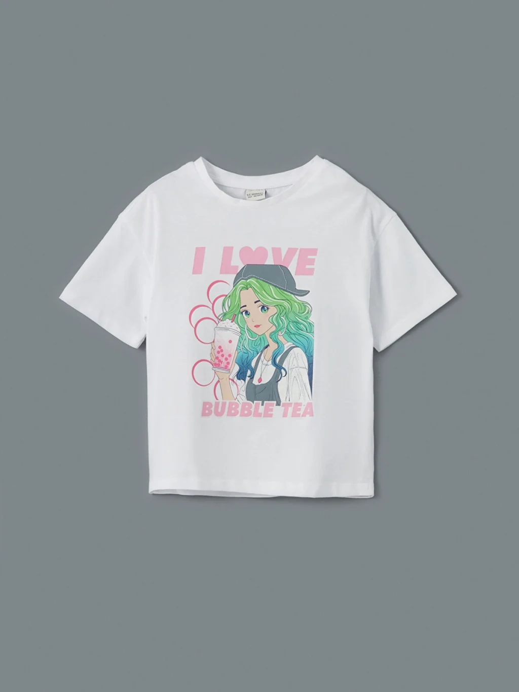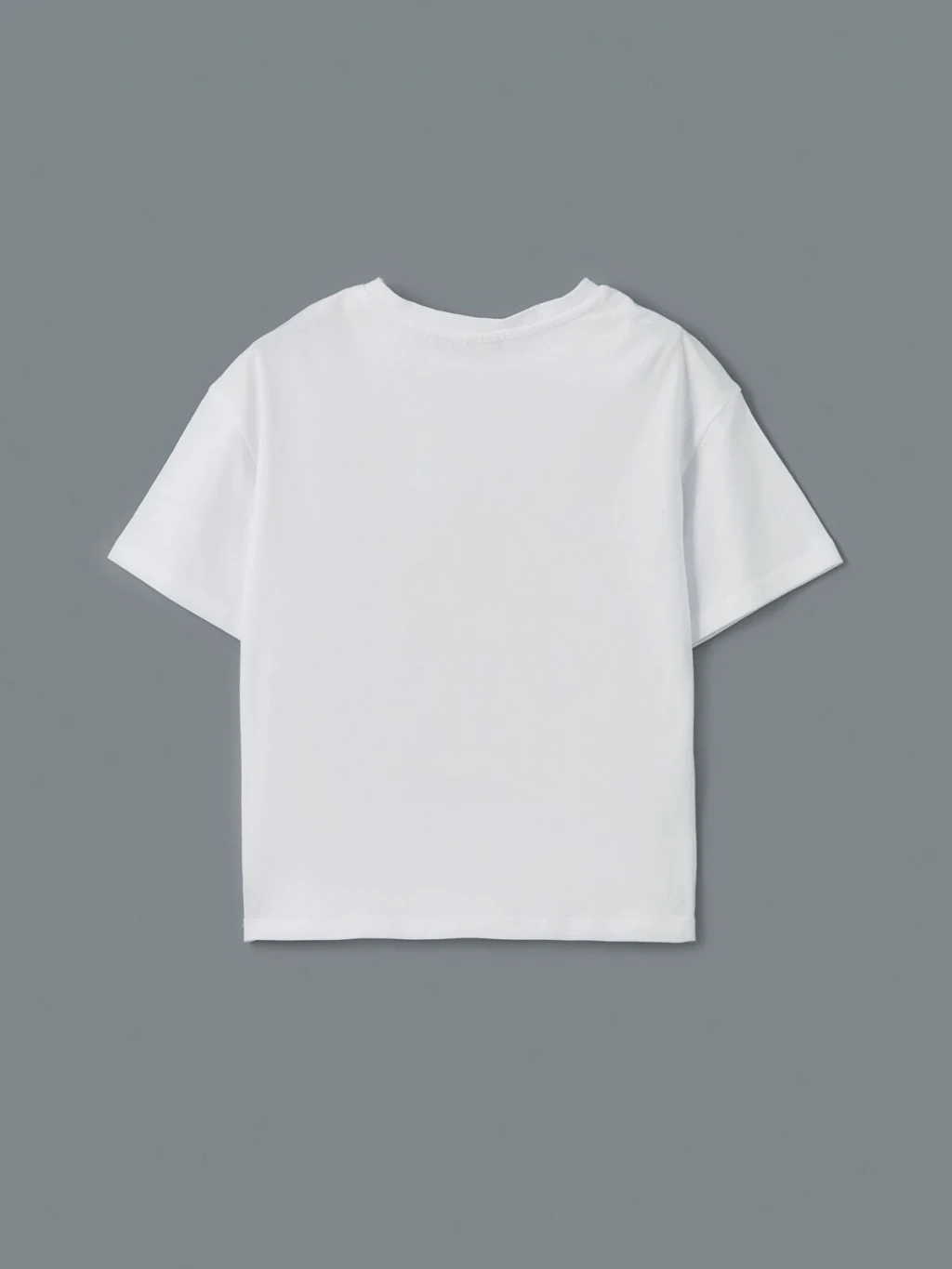 %100 pamuklu penye kumaştan üretilen kız çocuk tişört, bisiklet yaka ve kısa kolludur. Bol kalıplı modelin ön yüzü baskılıdır.