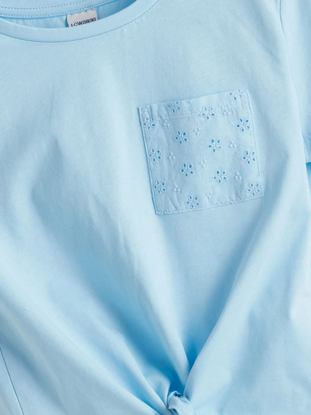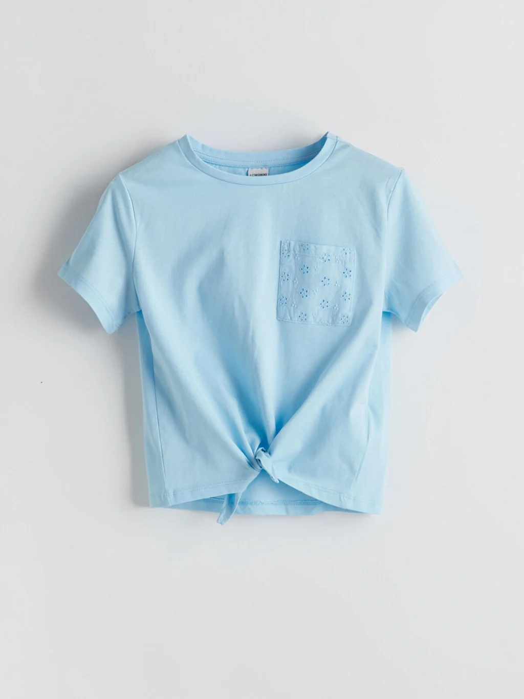 Bisiklet yaka ve kısa kollu kız çocuk tişört, %100 pamuklu penye kumaştan üretilmiştir. Göğsünde brode detaylı tek cep ve etek ucunda bağlama detayı bulunur.