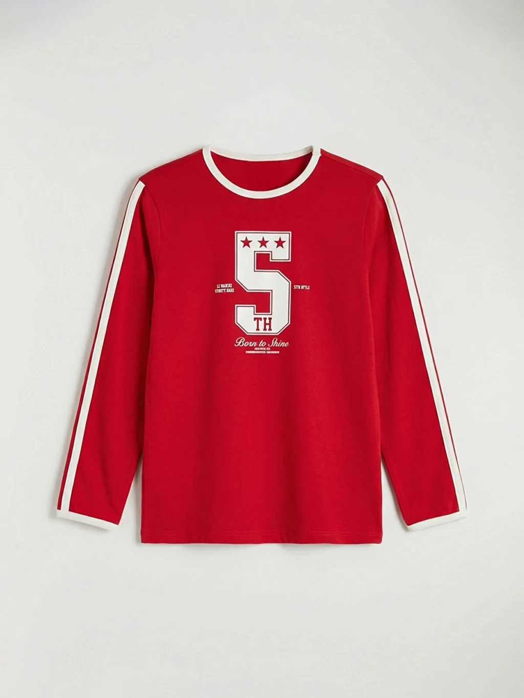 Bisiklet yaka ve uzun kollu kız çocuk tişört, dar kalıplı ve kaşkorse kumaştan üretilmiştir. Önü baskılıdır ve kollarında şerit detayı bulunur.