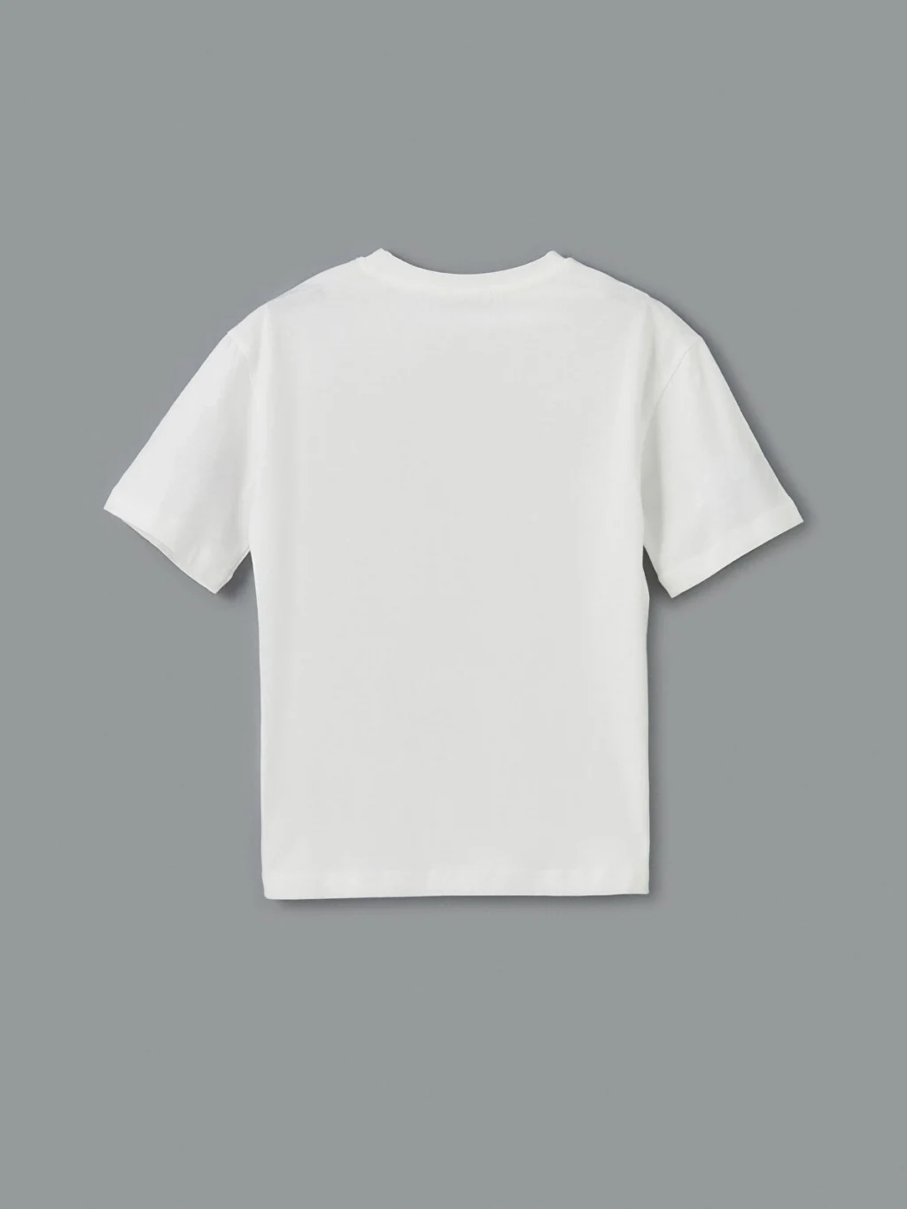 Bisiklet yaka, kısa kollu ve önü baskılı kız çocuk tişört, %100 pamuklu penye kumaştan üretilmiştir ve bol kalıplıdır.
