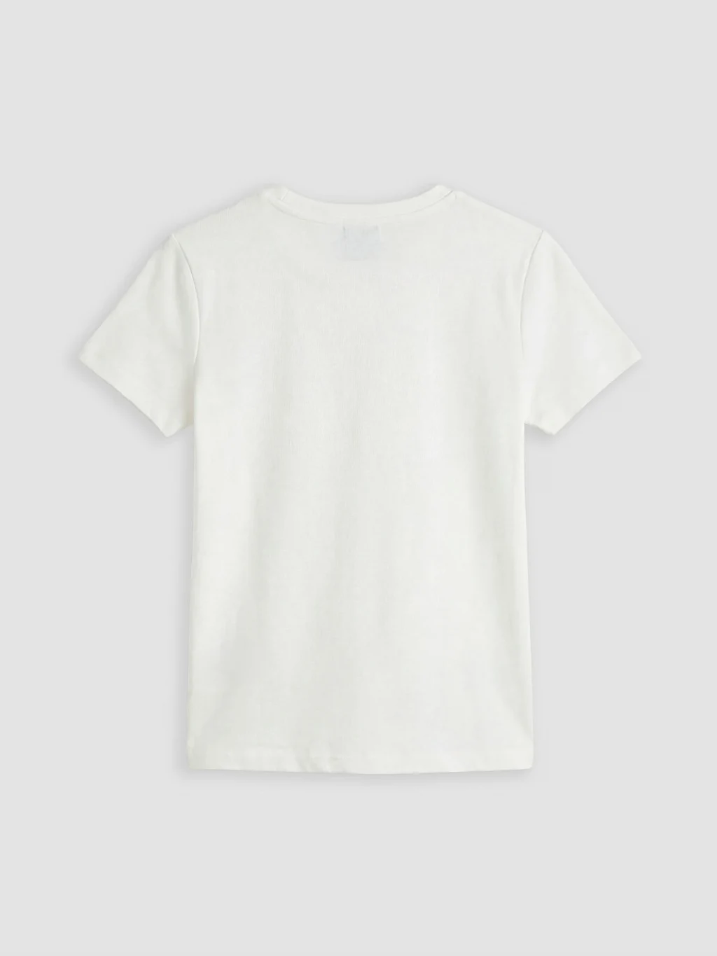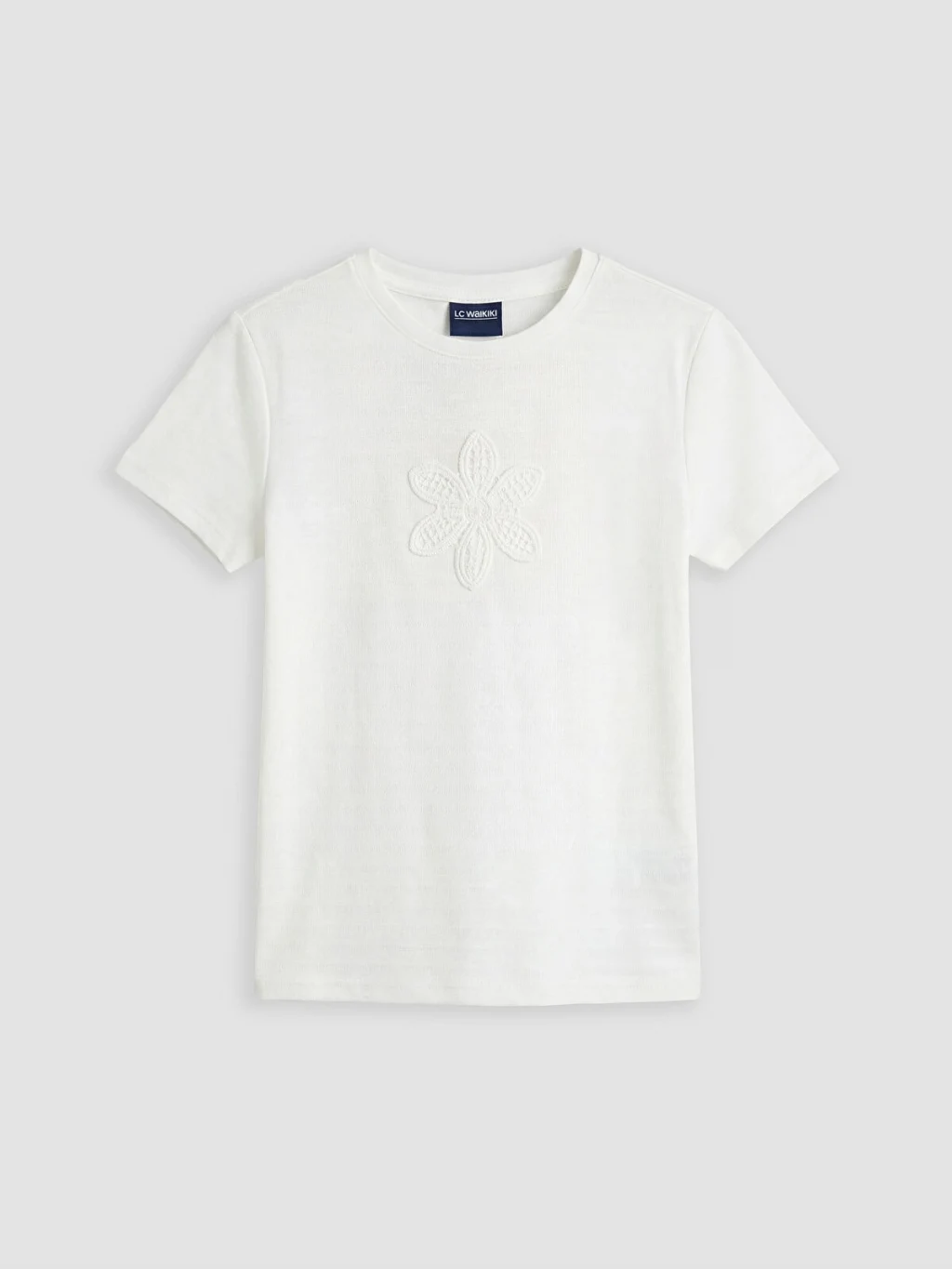 Bisiklet yaka ve kısa kollu kız çocuk tişört, kaşkorse kumaştan üretilmiştir ve ön yüzünde nakışlı desen bulunur.
