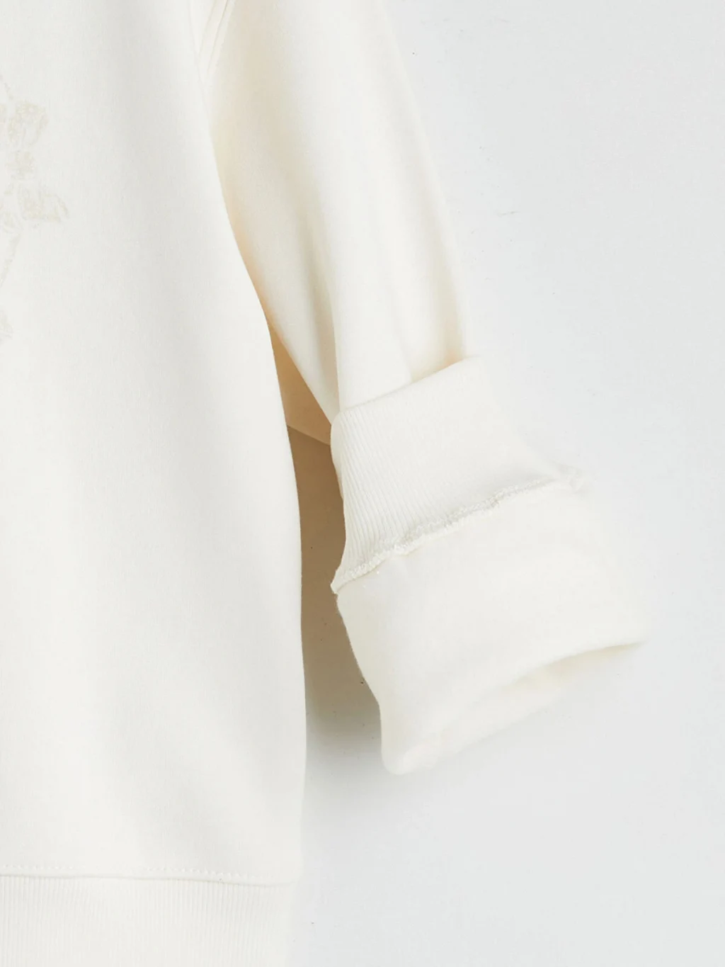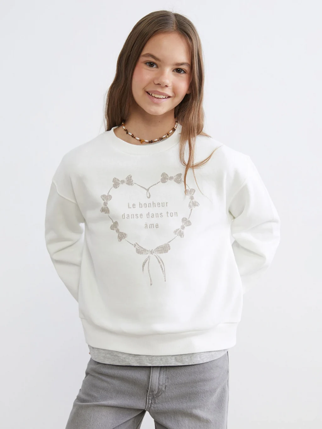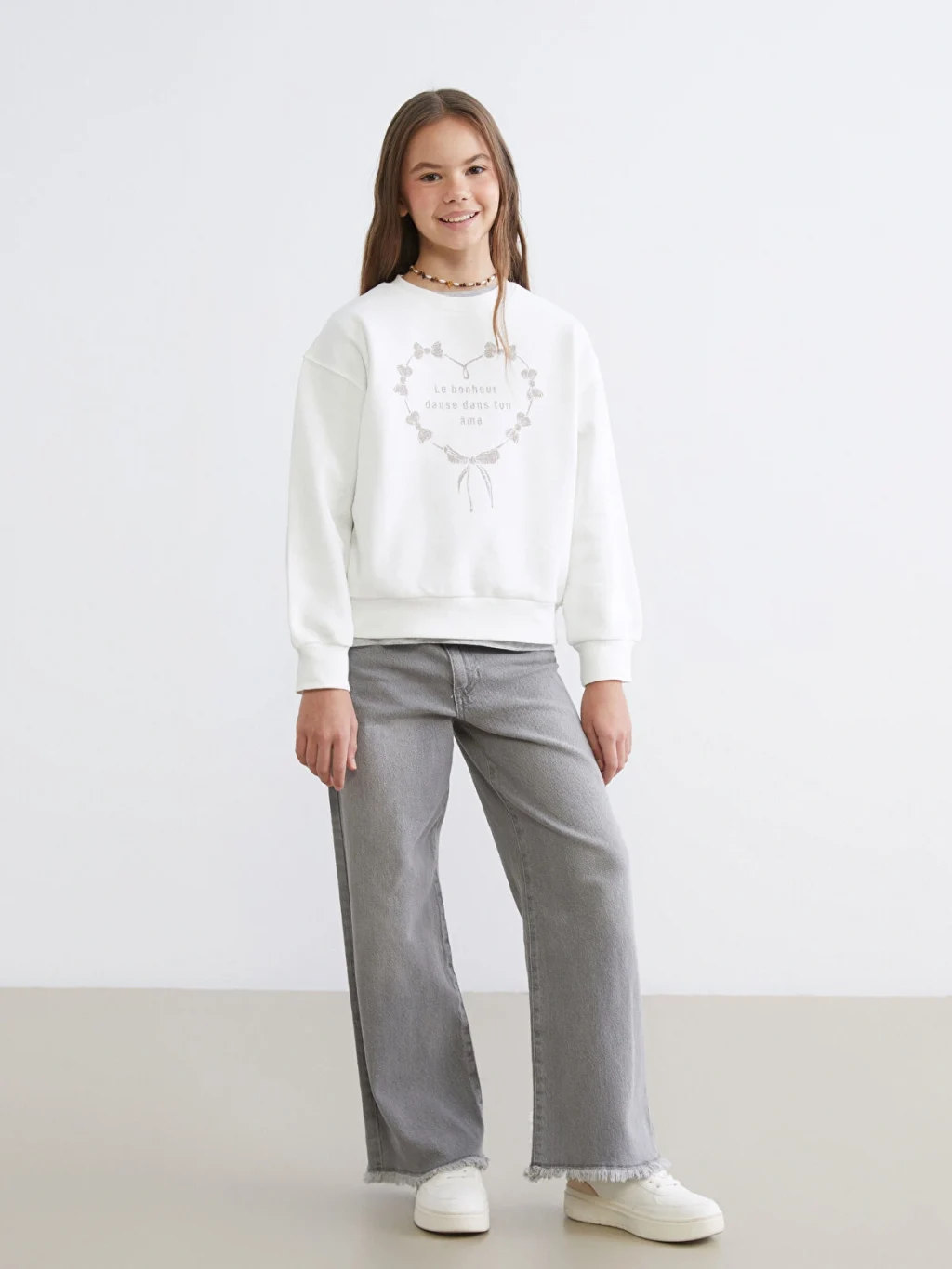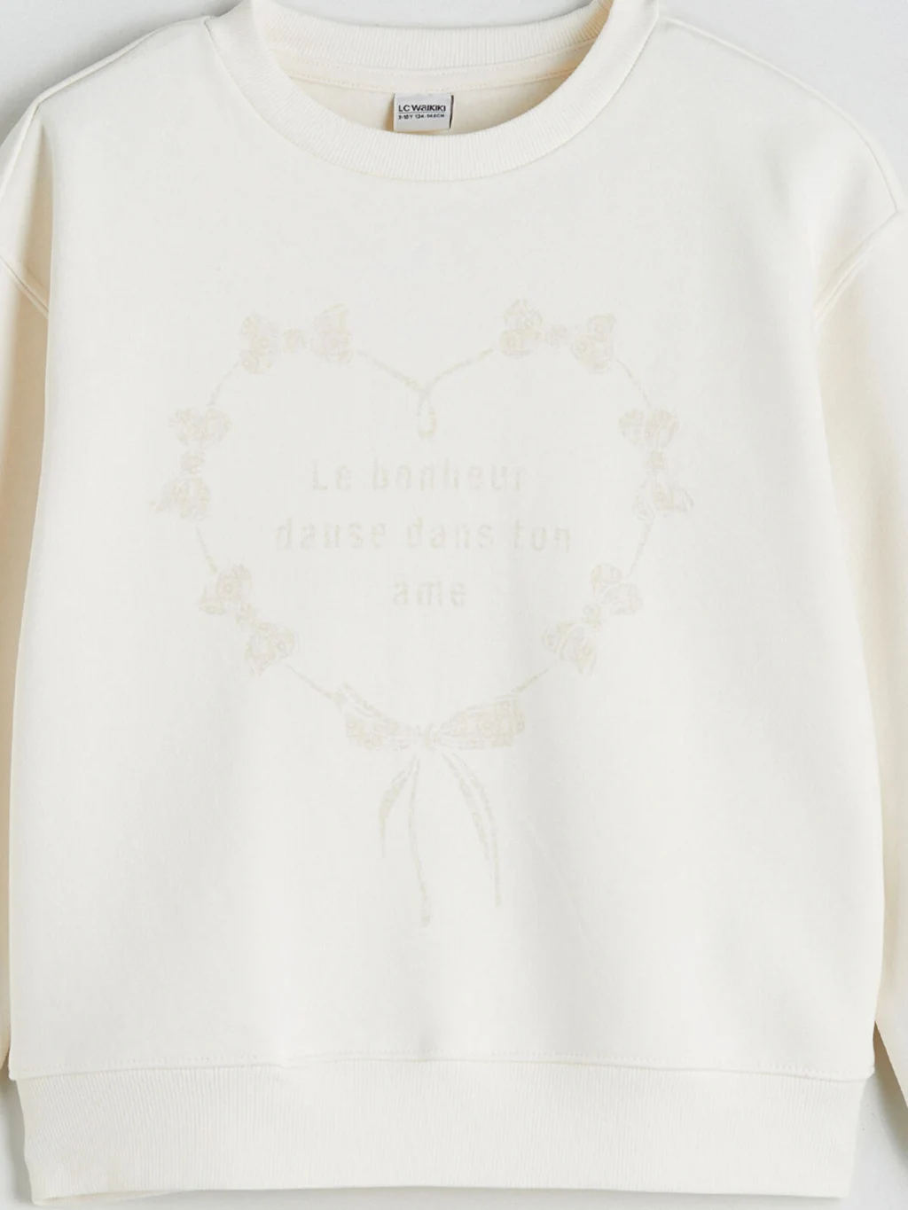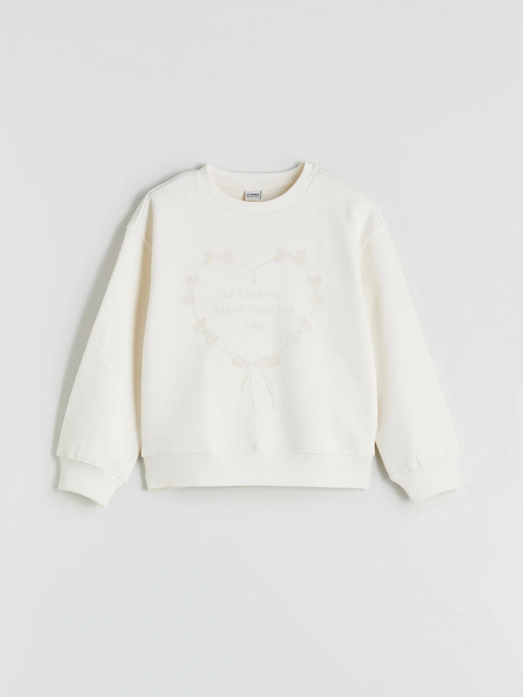 Kalın üç iplik şardonlu kumaştan üretilen kız çocuk sweatshirt, bisiklet yaka ve uzun kolludur. Önü kalp desenli ve yazılıdır.