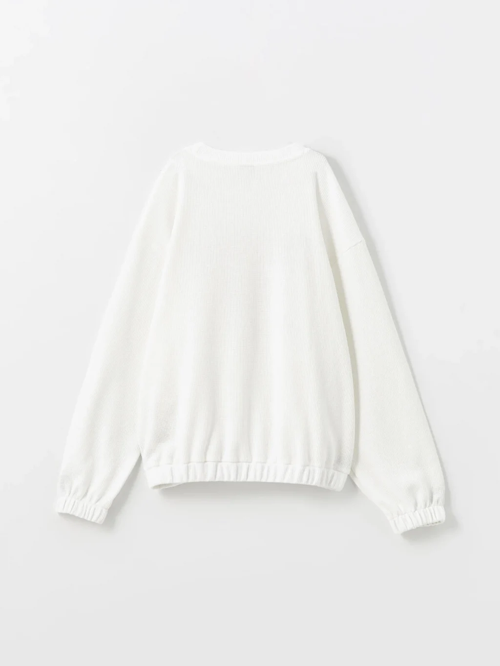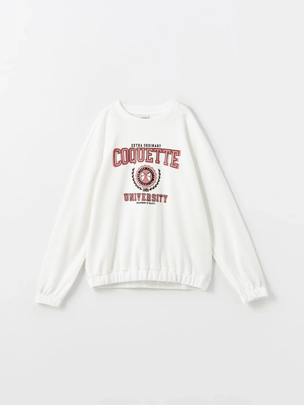 Orta kalınlıkta waffle kumaştan üretilen kız çocuk sweatshirt, bisiklet yakalı ve uzun kolludur. Önü baskılı modelin kol uçları ve etek ucu lastiklidir.