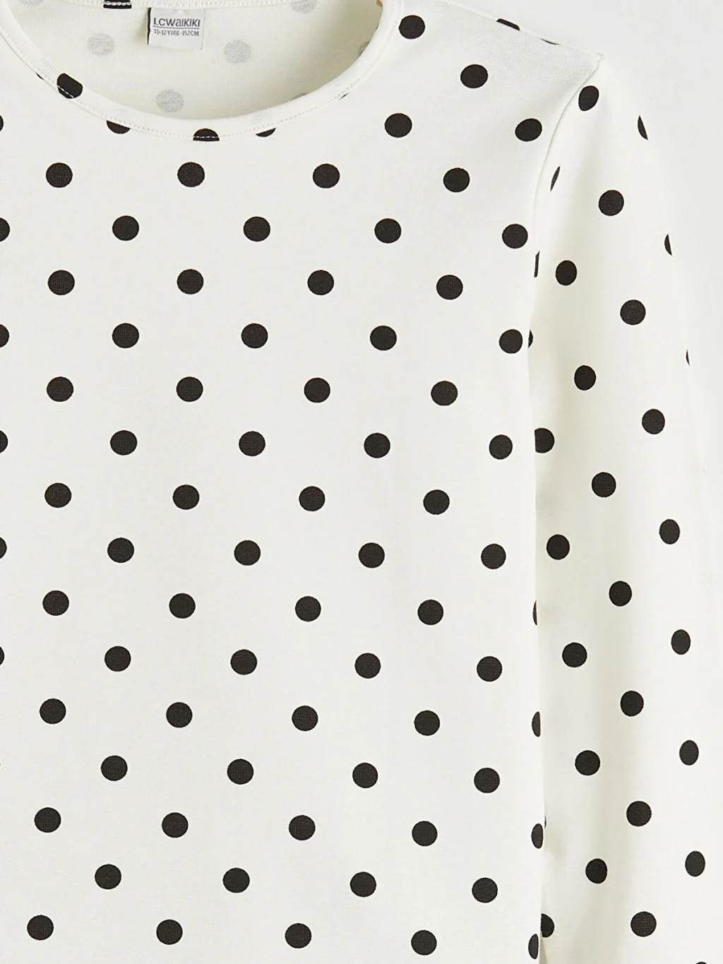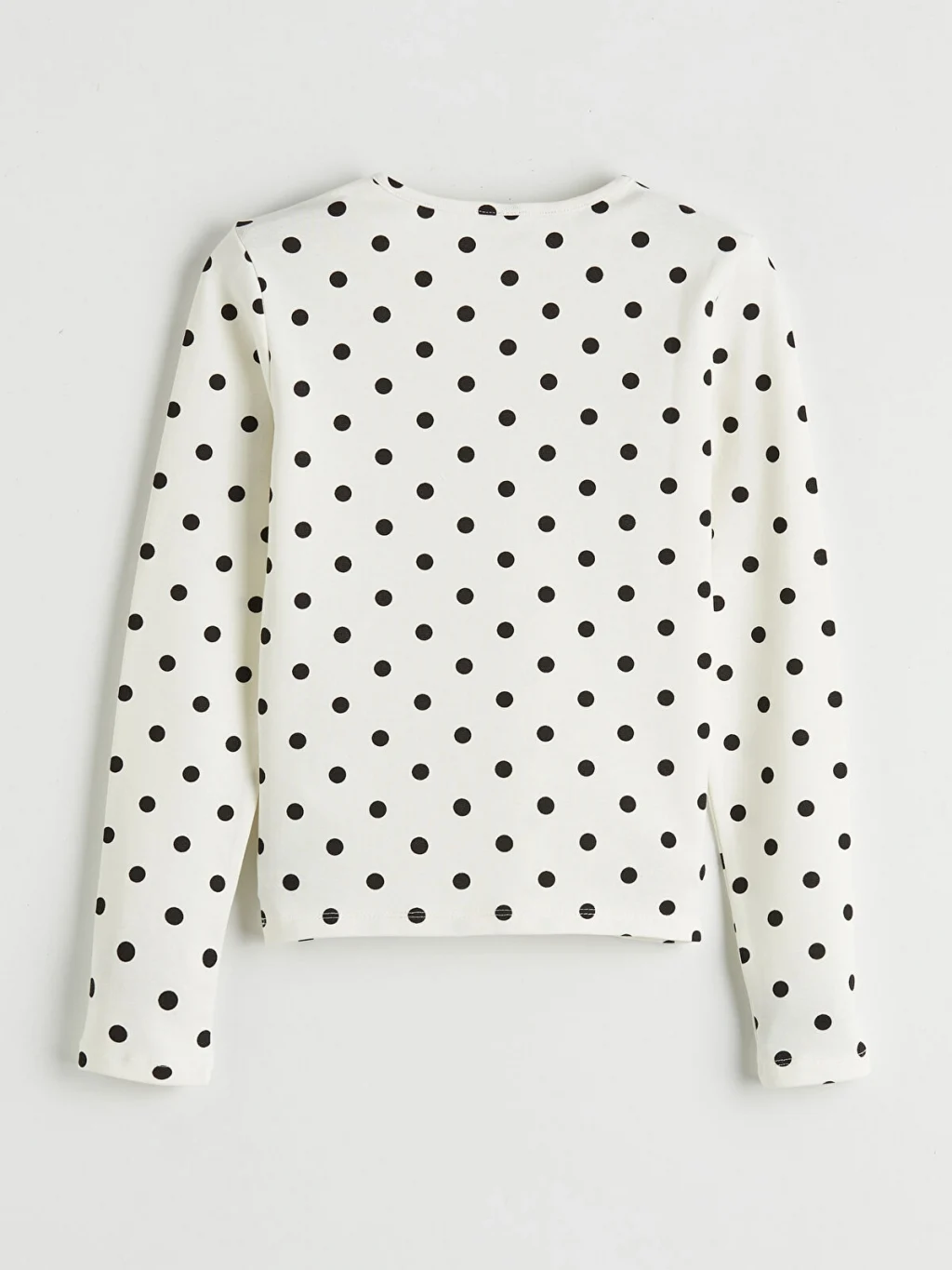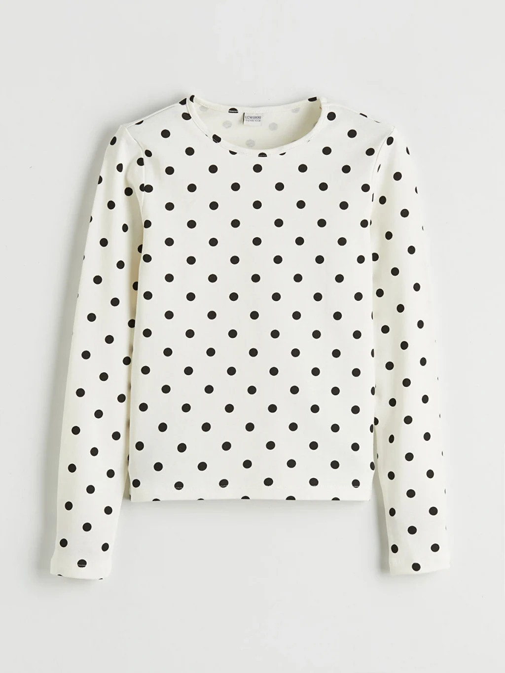 Dar kalıplı, bisiklet yaka ve uzun kollu kız çocuk tişört, puantiye desenli ribana kumaştan üretilmiştir.