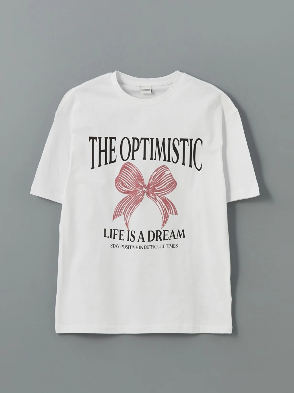 Bisiklet yaka, kısa kollu kız çocuk tişört, %100 pamuklu penye kumaştan üretilmiştir. Bol kalıplı tişörtün önünde fiyonk ve yazı baskısı bulunur.