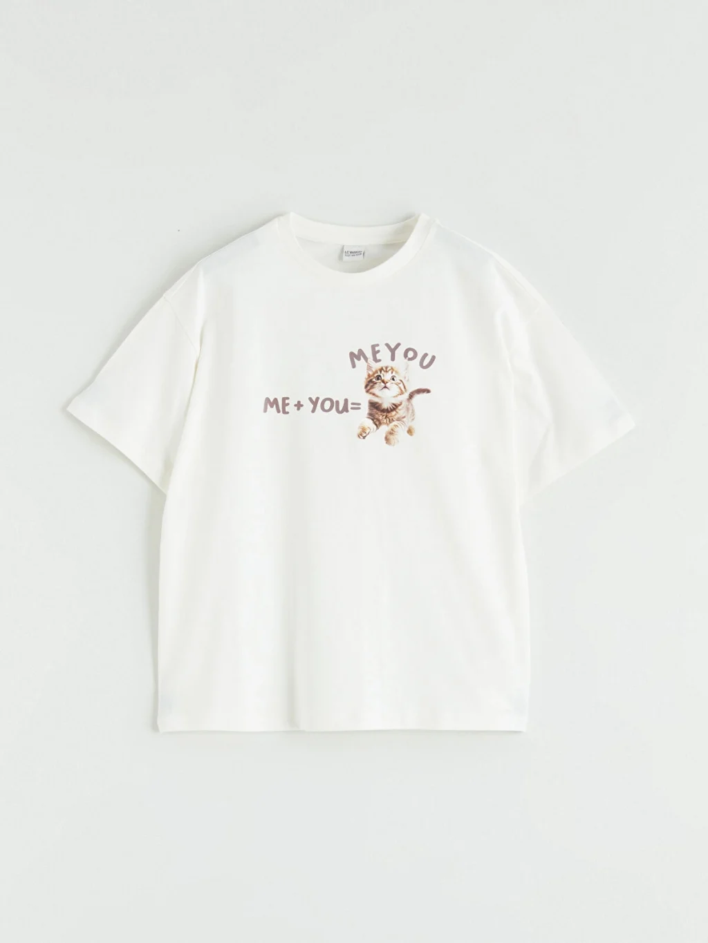 Bisiklet yaka, kısa kollu kız çocuk tişört, %100 pamuk penye kumaştan üretilmiştir. Ön yüzü kedi baskılı ve yazılıdır, bol kalıplıdır.
