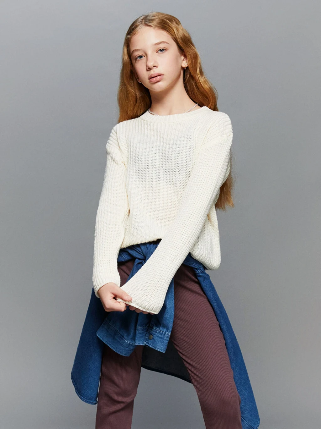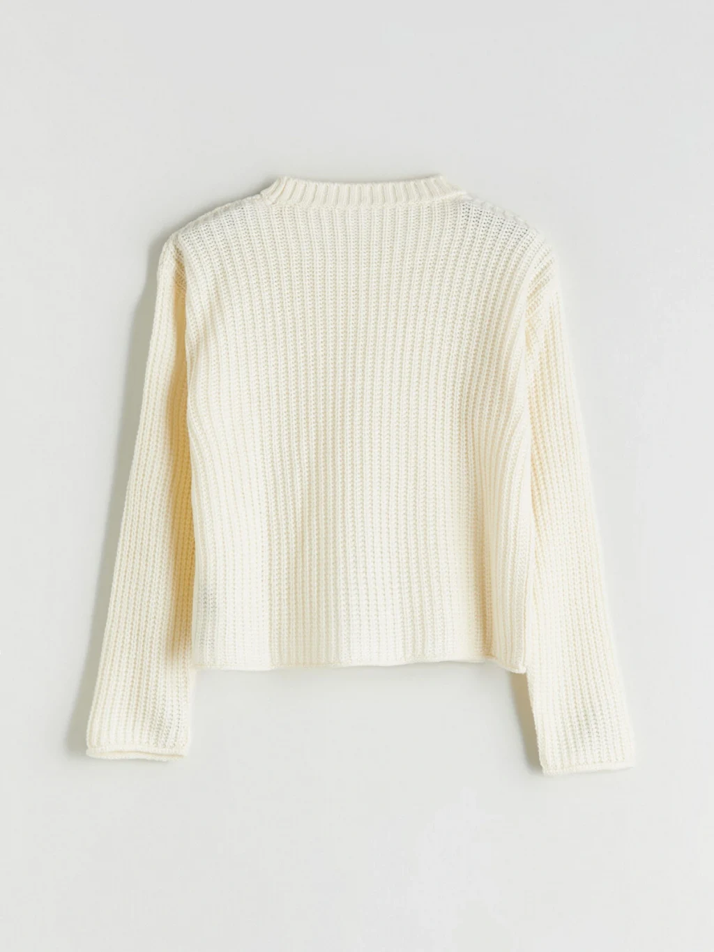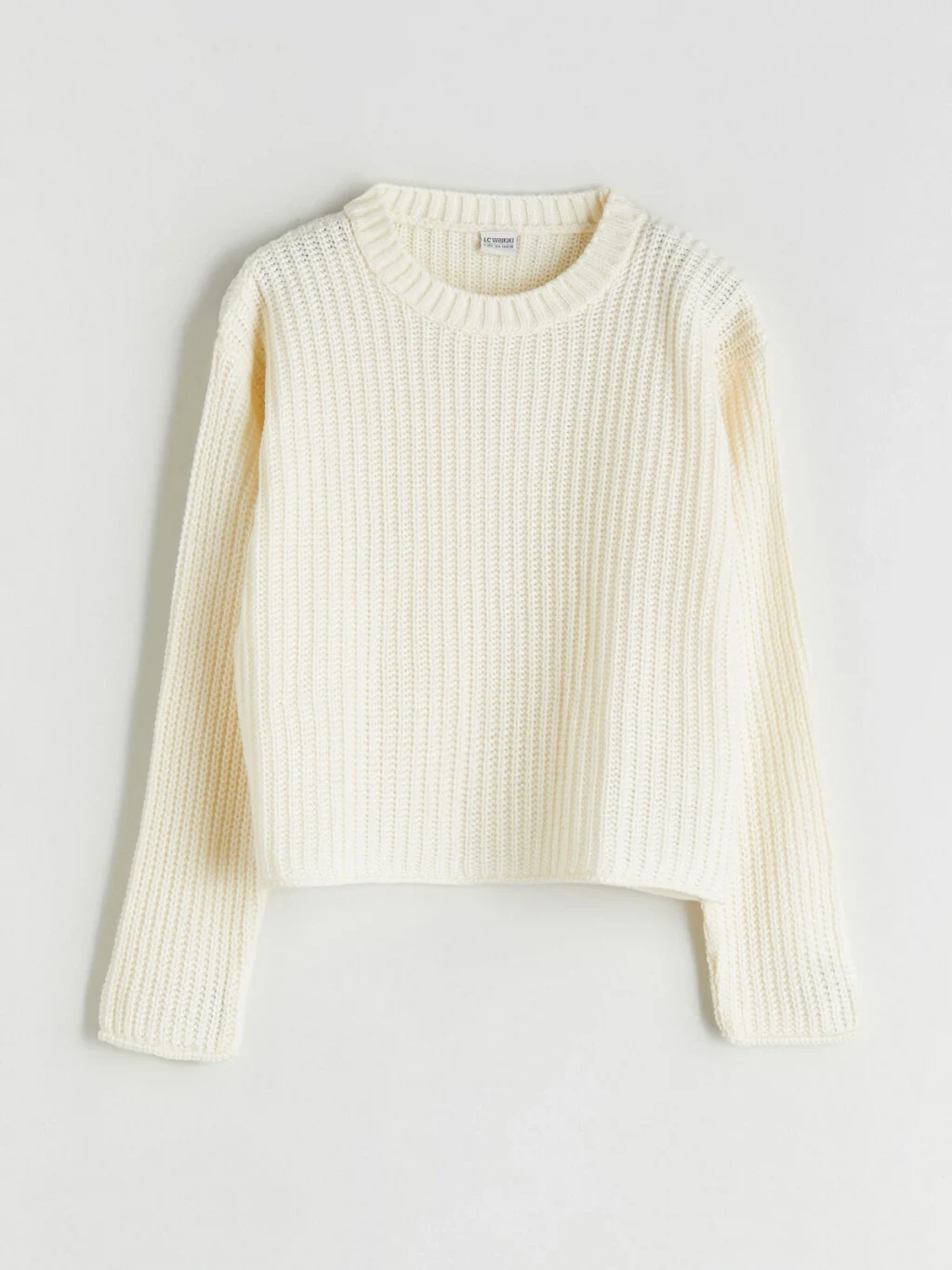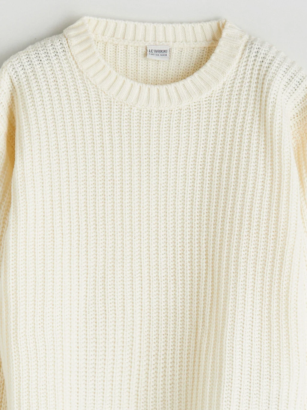 Bisiklet yaka ve uzun kollu kız çocuk kazak, fitilli dokuya sahip kalın triko kumaştan üretilmiştir.