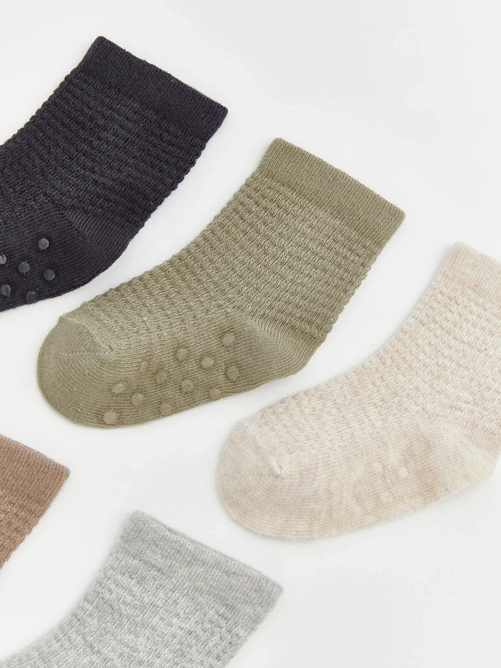 Beş çiftten oluşan erkek bebek soket çorap seti, kaydırmaz tabanlı tasarıma sahiptir.