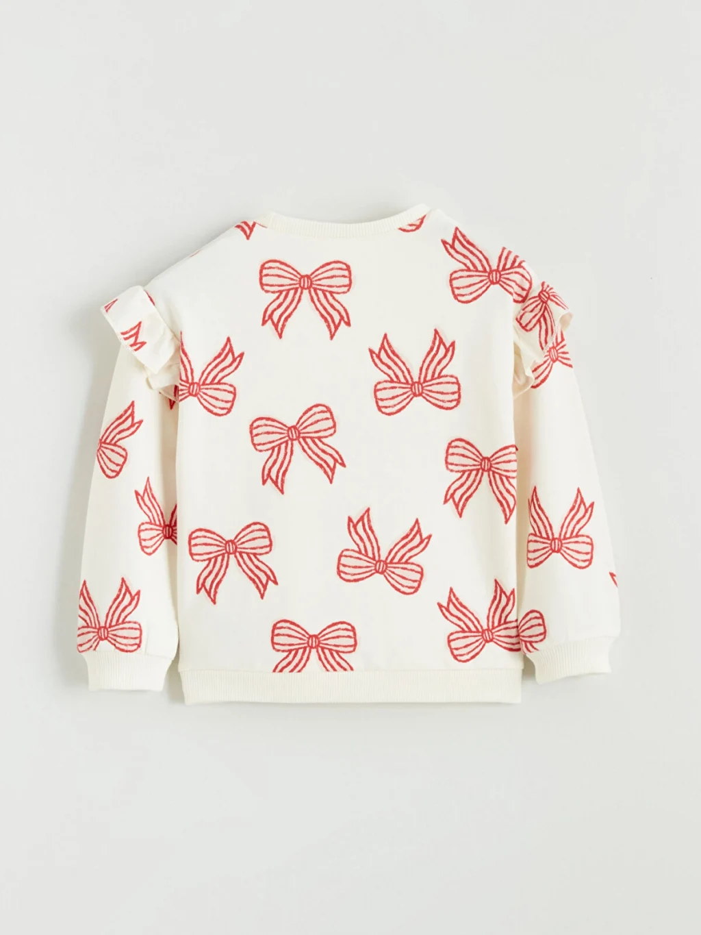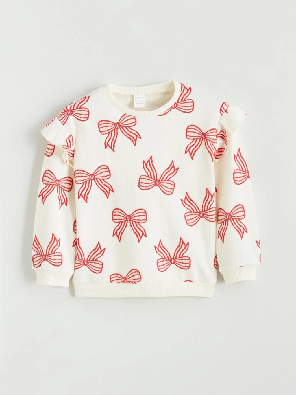 Fiyonk desenli, bisiklet yaka kız bebek sweatshirt, uzun kollu ve omuzları fırfır detaylıdır. Kol ve etek ucu ribanalıdır.