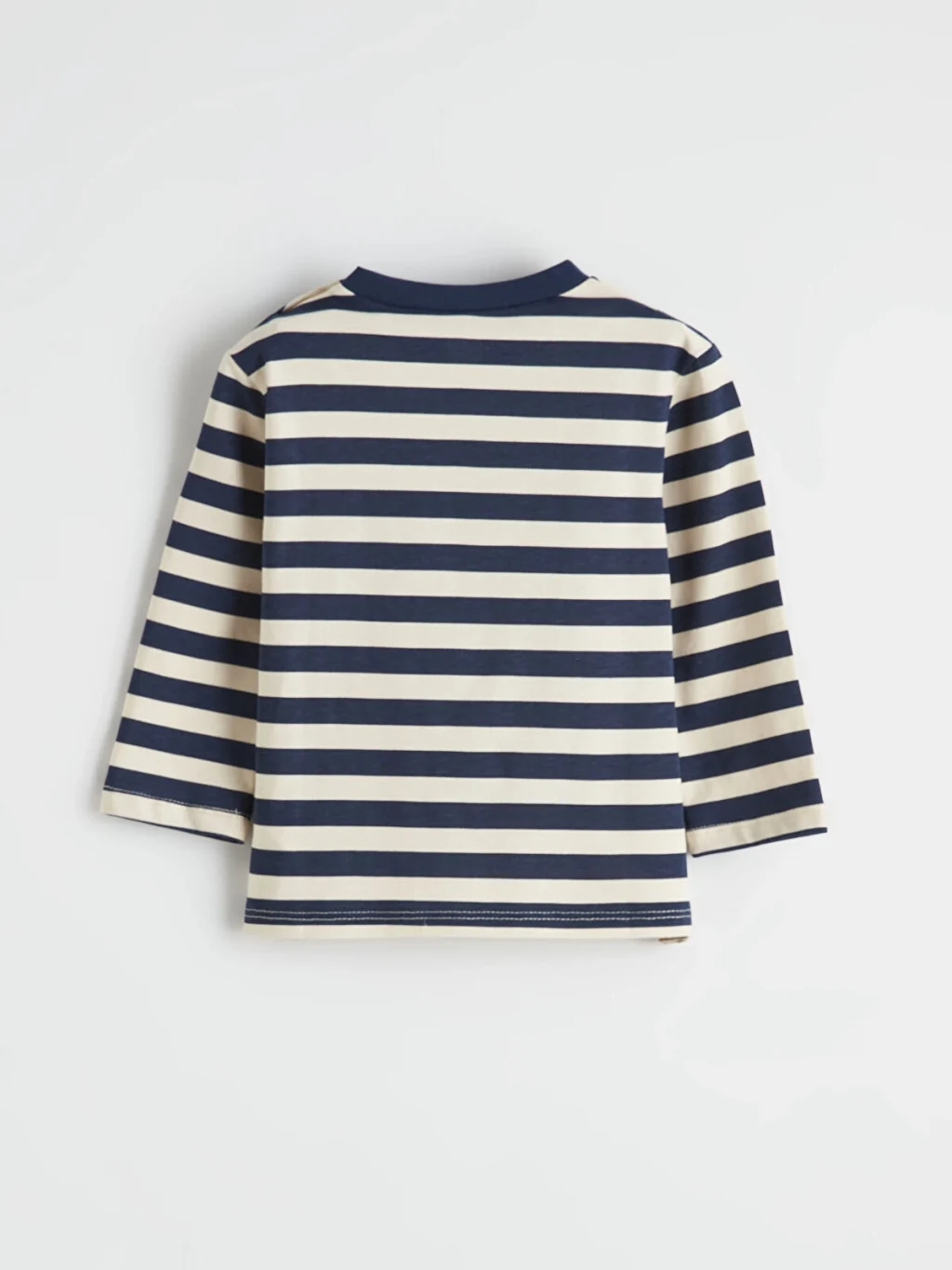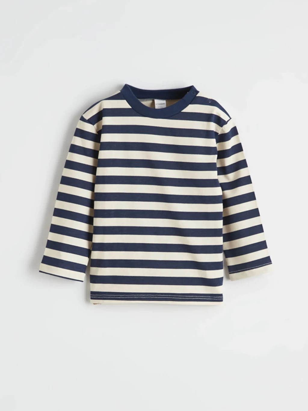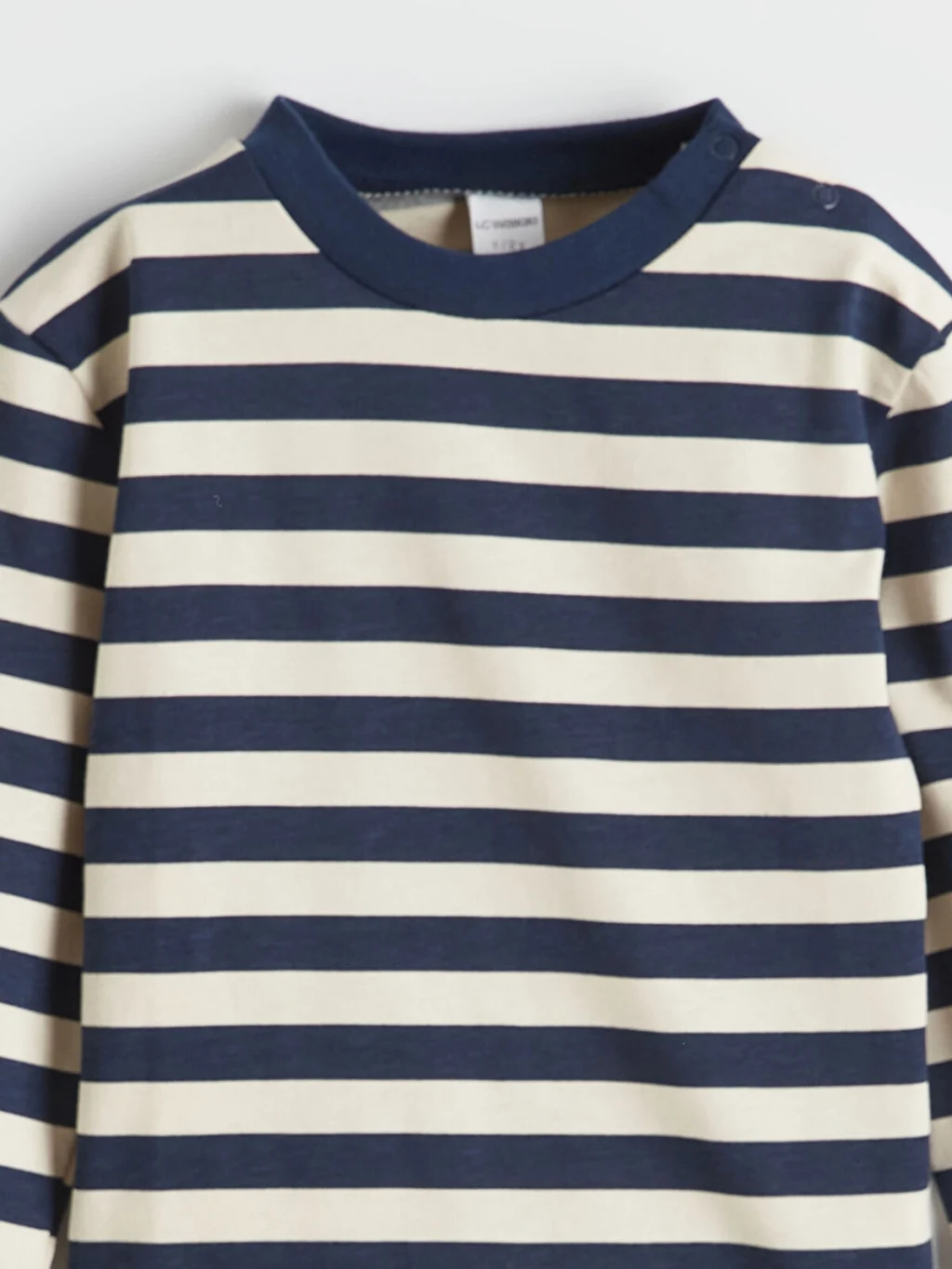 Bisiklet yaka, uzun kollu ve çizgili erkek bebek tişörtü, pamuklu kumaştan üretilmiştir ve omuzdan çıtçıt kapamalıdır.