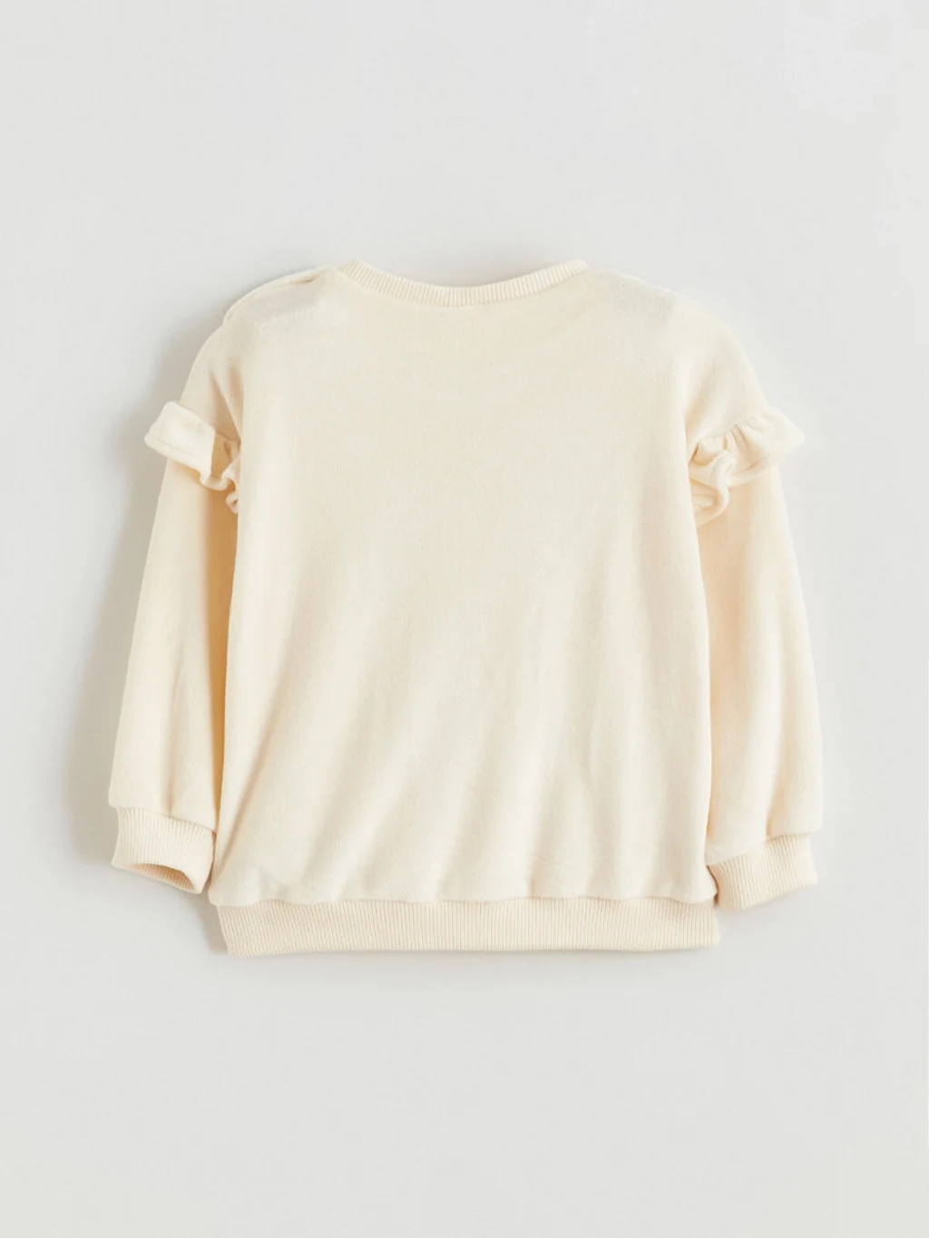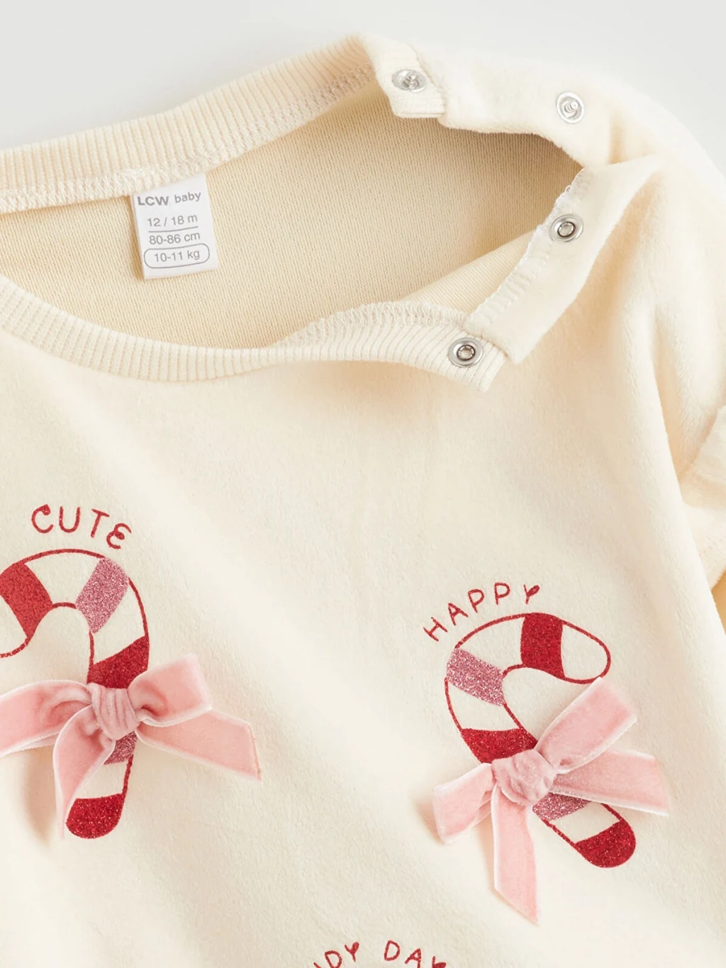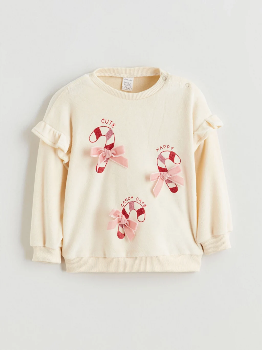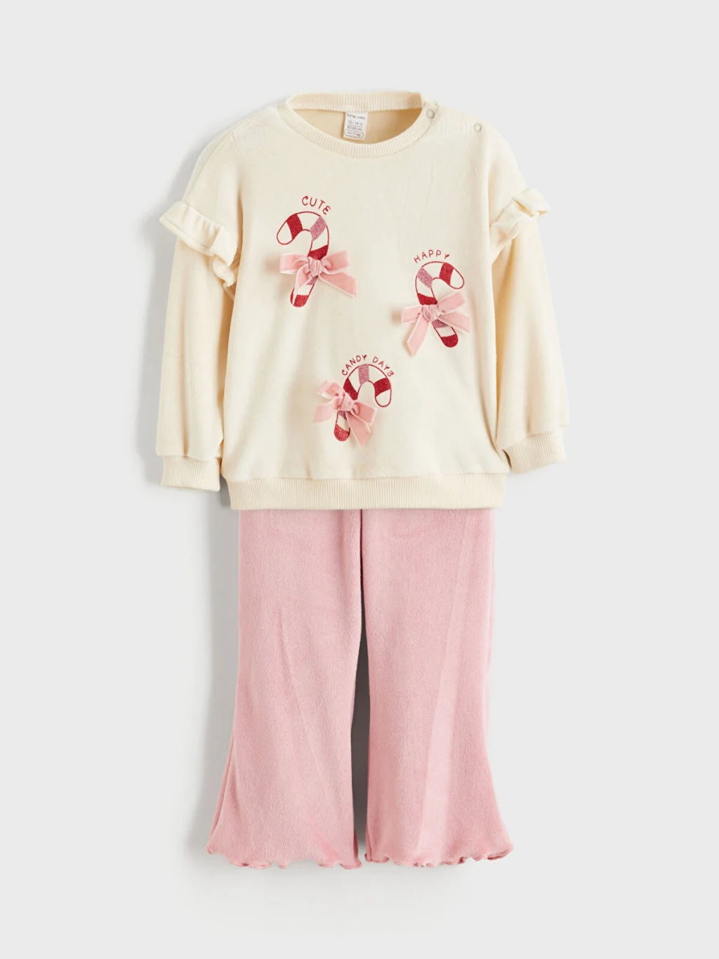 Kız bebek takım; bisiklet yaka, omuzları volanlı, omuzdan çıtçıt kapamalı, önü fiyonk detaylı ve desenli sweatshirt ile marul paça pantolondan oluşur.