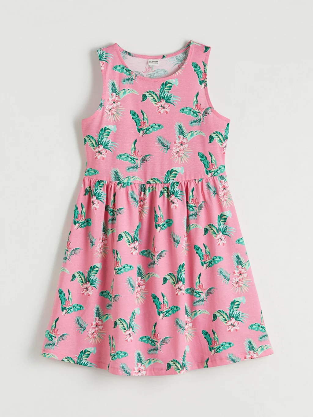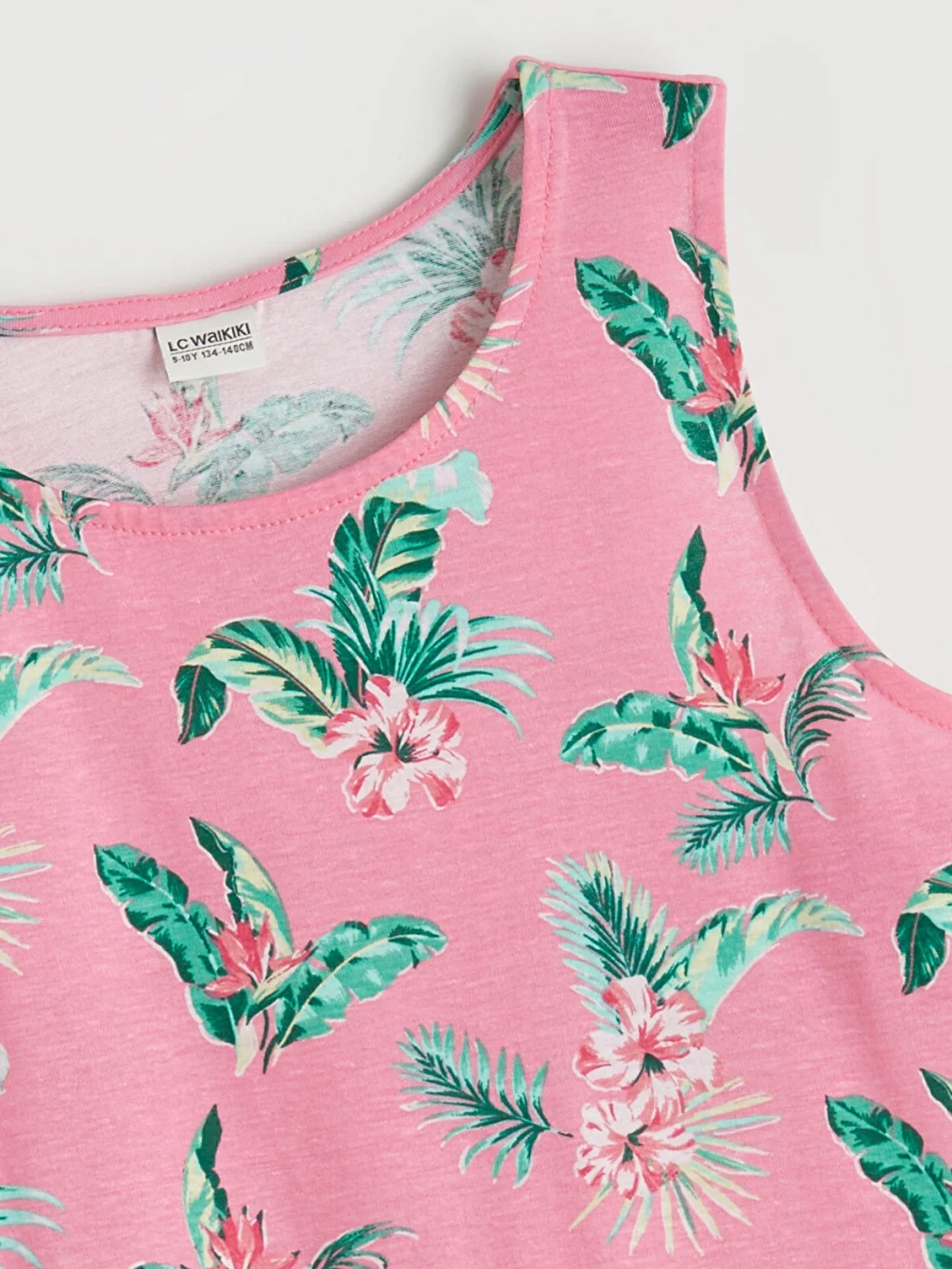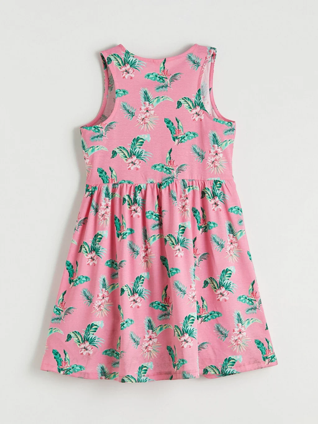 Bisiklet yaka ve kolsuz, desenli kız çocuk elbise, %100 pamuklu penye kumaştan üretilmiştir. Belde büzgü detayı bulunur.