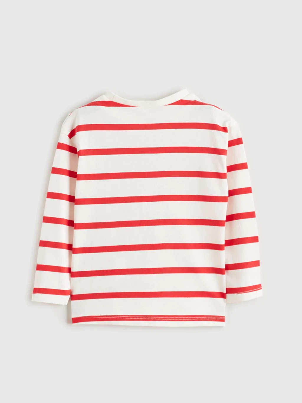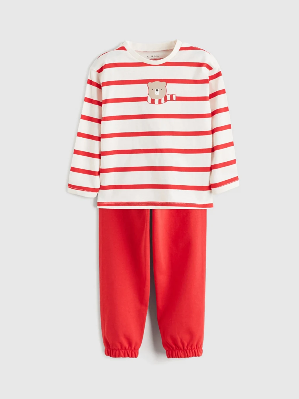 Erkek bebek pijama takımı, bisiklet yaka ve uzun kollu, göğsü aplike detaylı çizgili üst ile paçaları lastikli düz alttan oluşur.