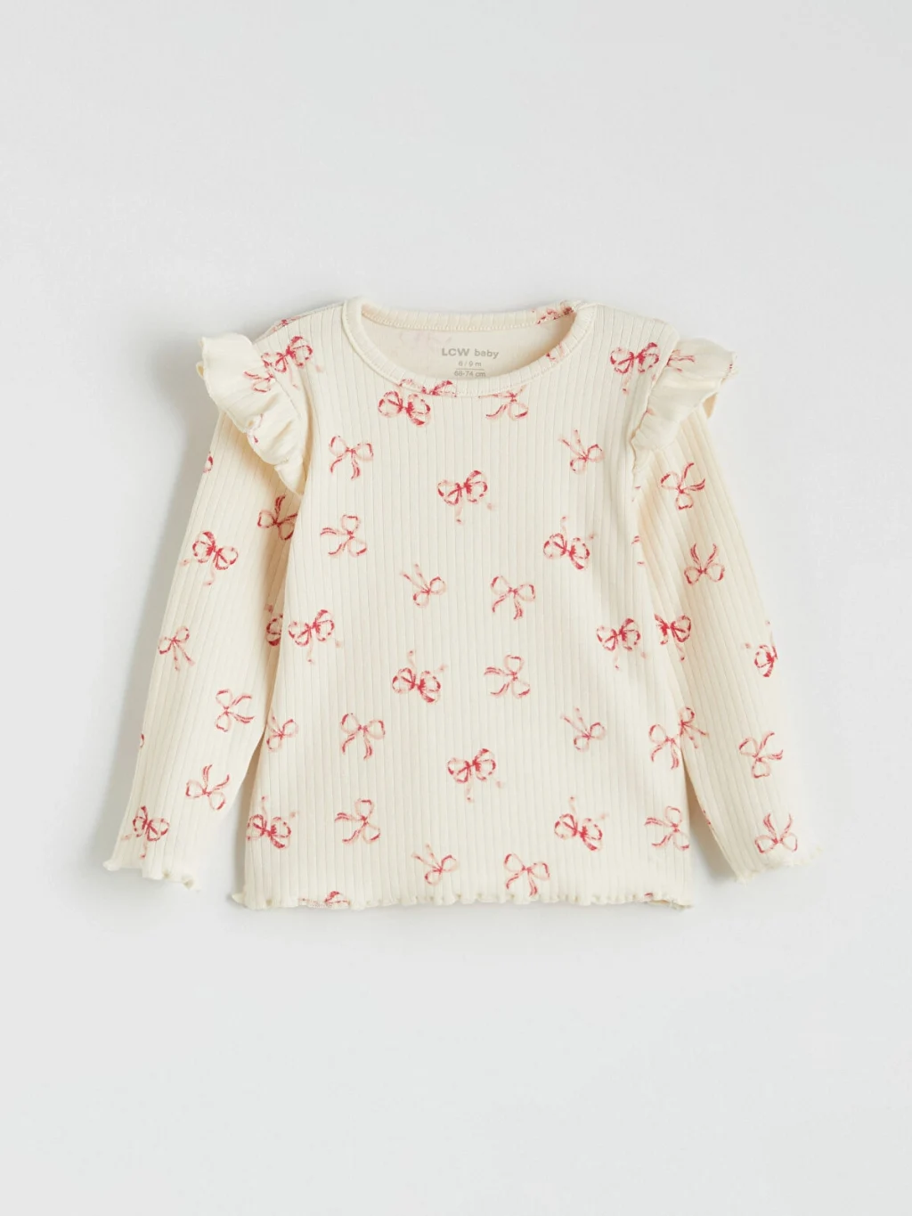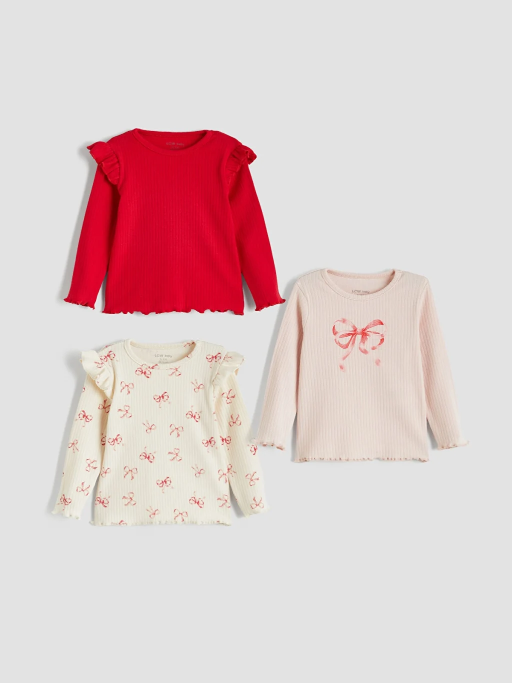 Bisiklet yaka ve uzun kollu kız bebek bluz paketi, yüksek pamuk içerikli kumaştan üretilmiştir. Paket, baskılı ve fırfır detaylı modeller içerir.