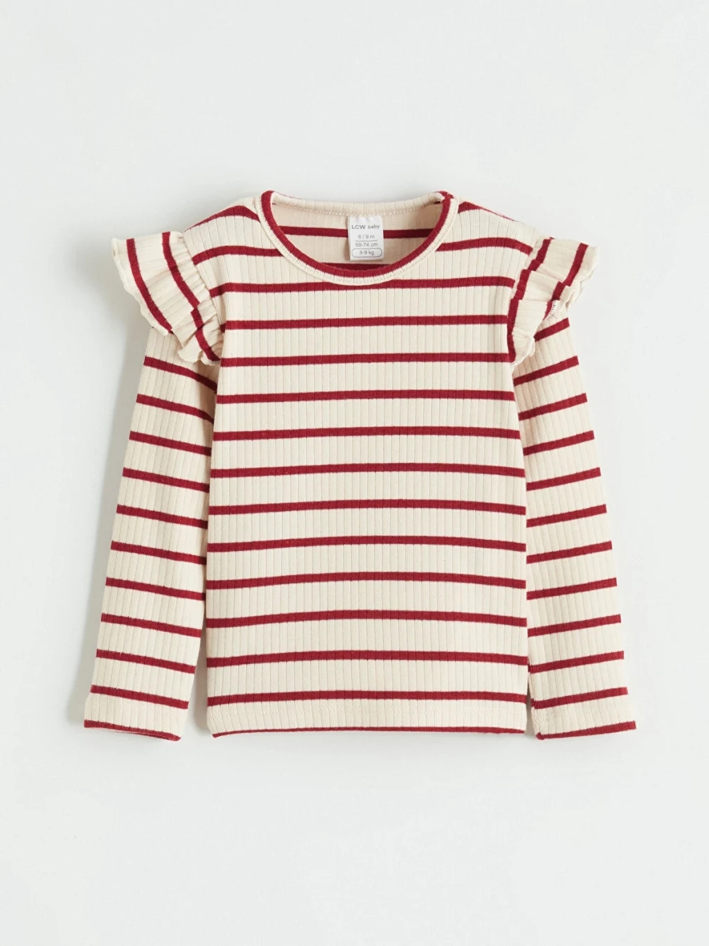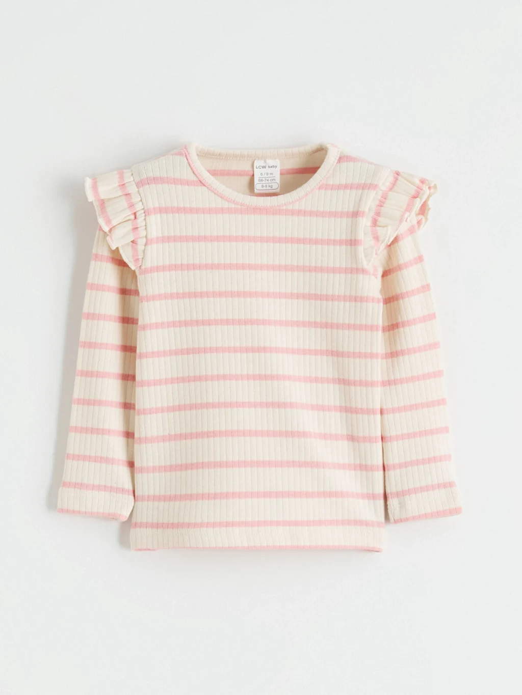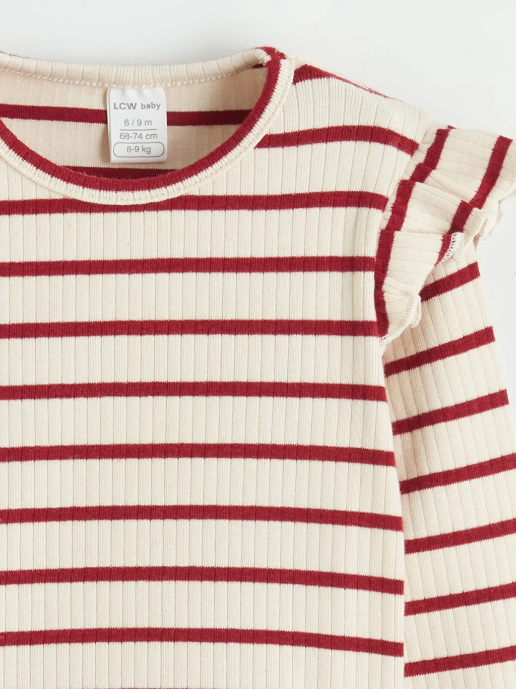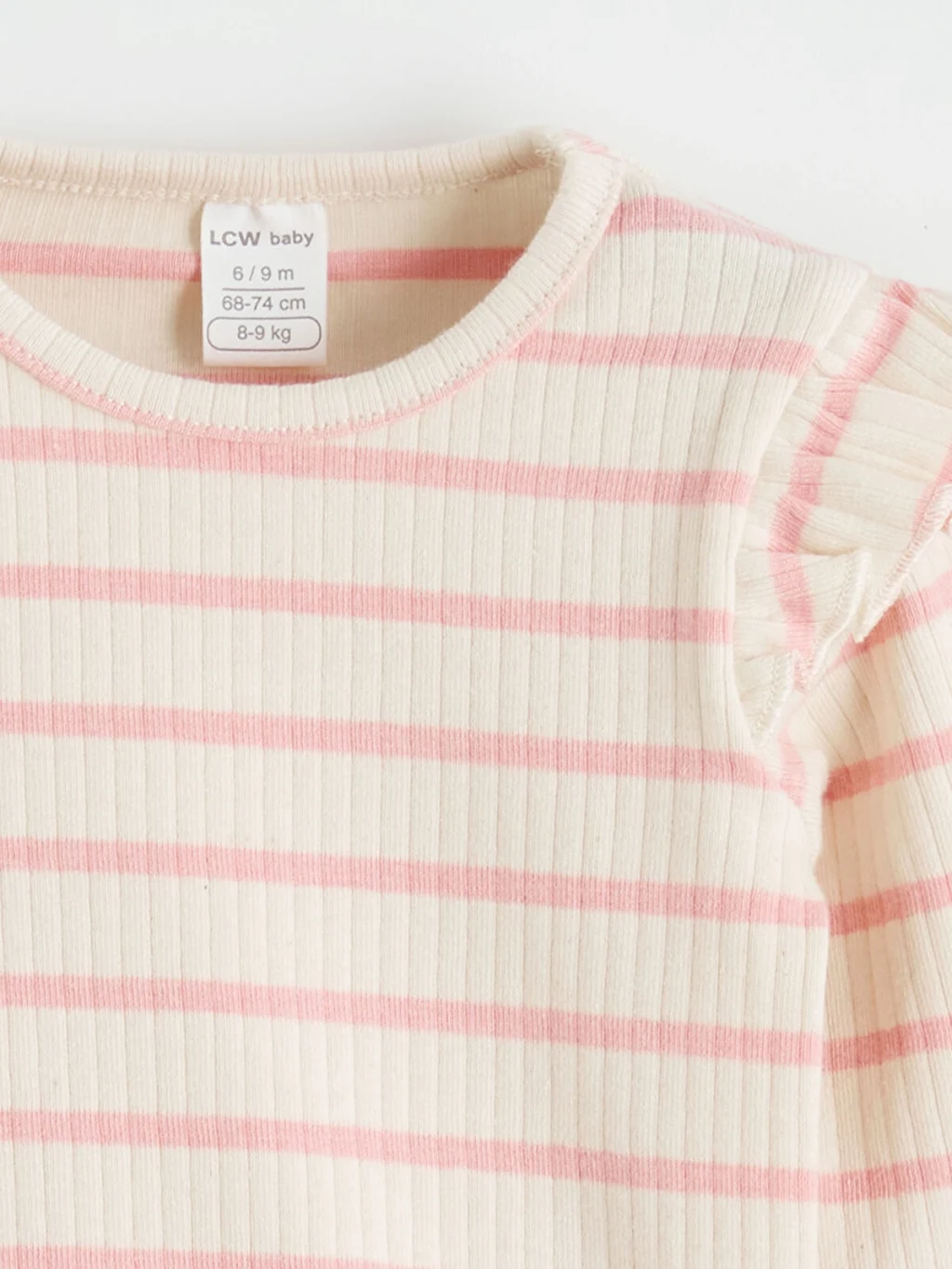 Yüksek pamuk içerikli kaşkorse kumaştan üretilen kız bebek tişört, bisiklet yaka ve uzun kolludur. Çizgili deseni ve omuzlarındaki fırfır detayı bulunur.