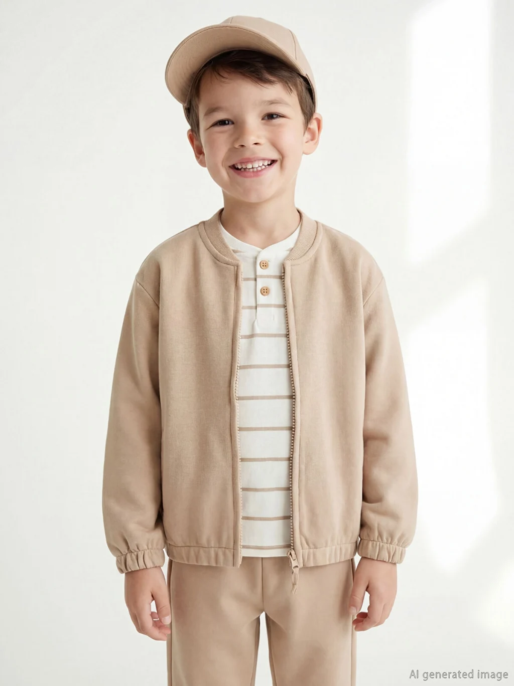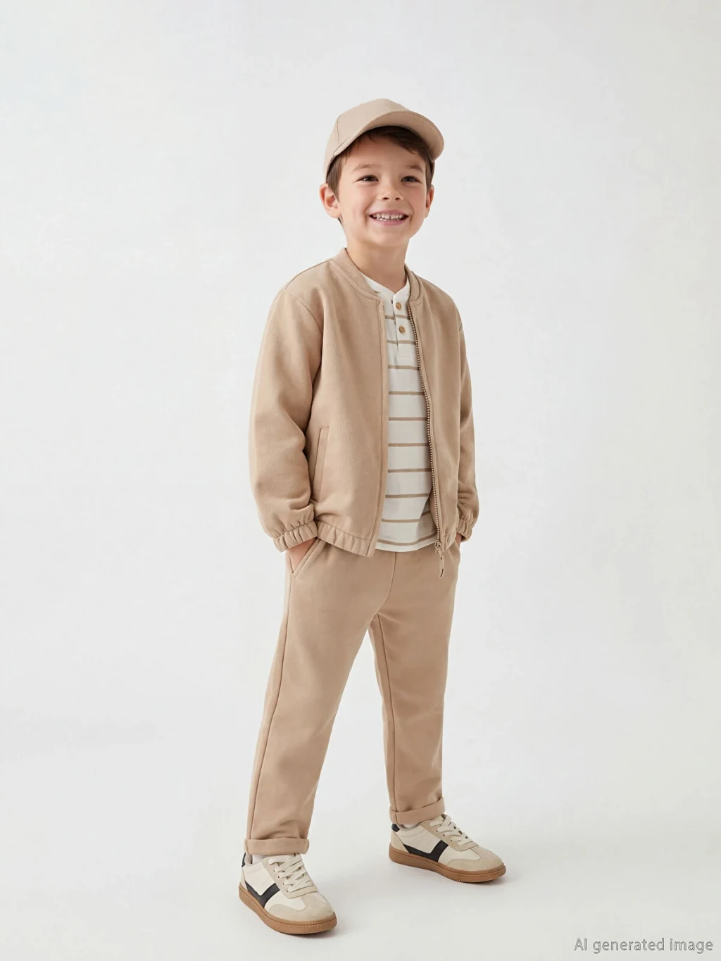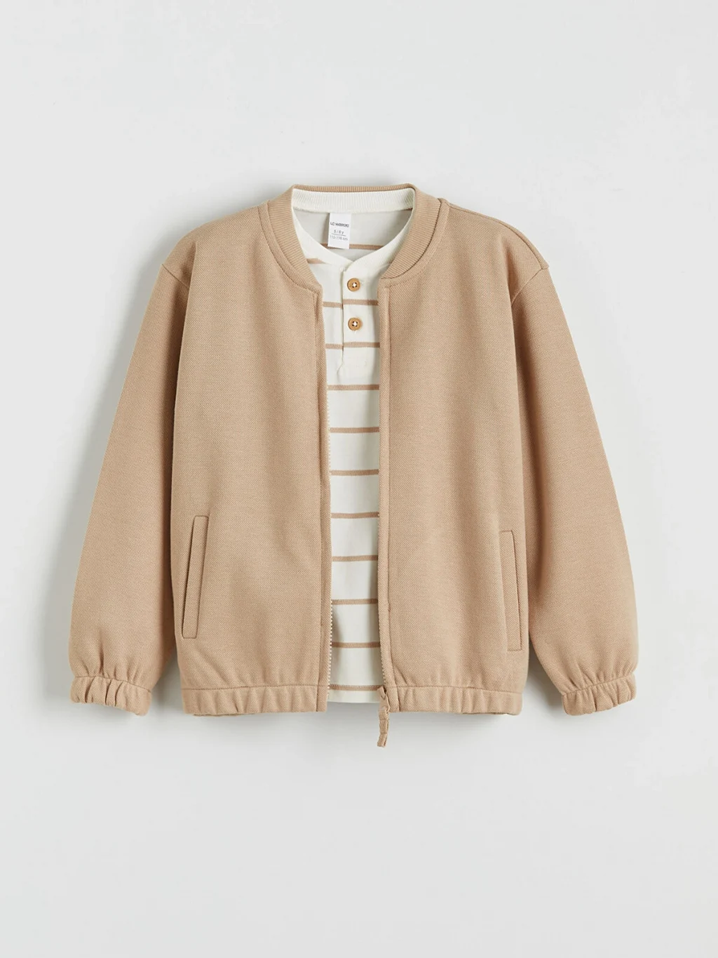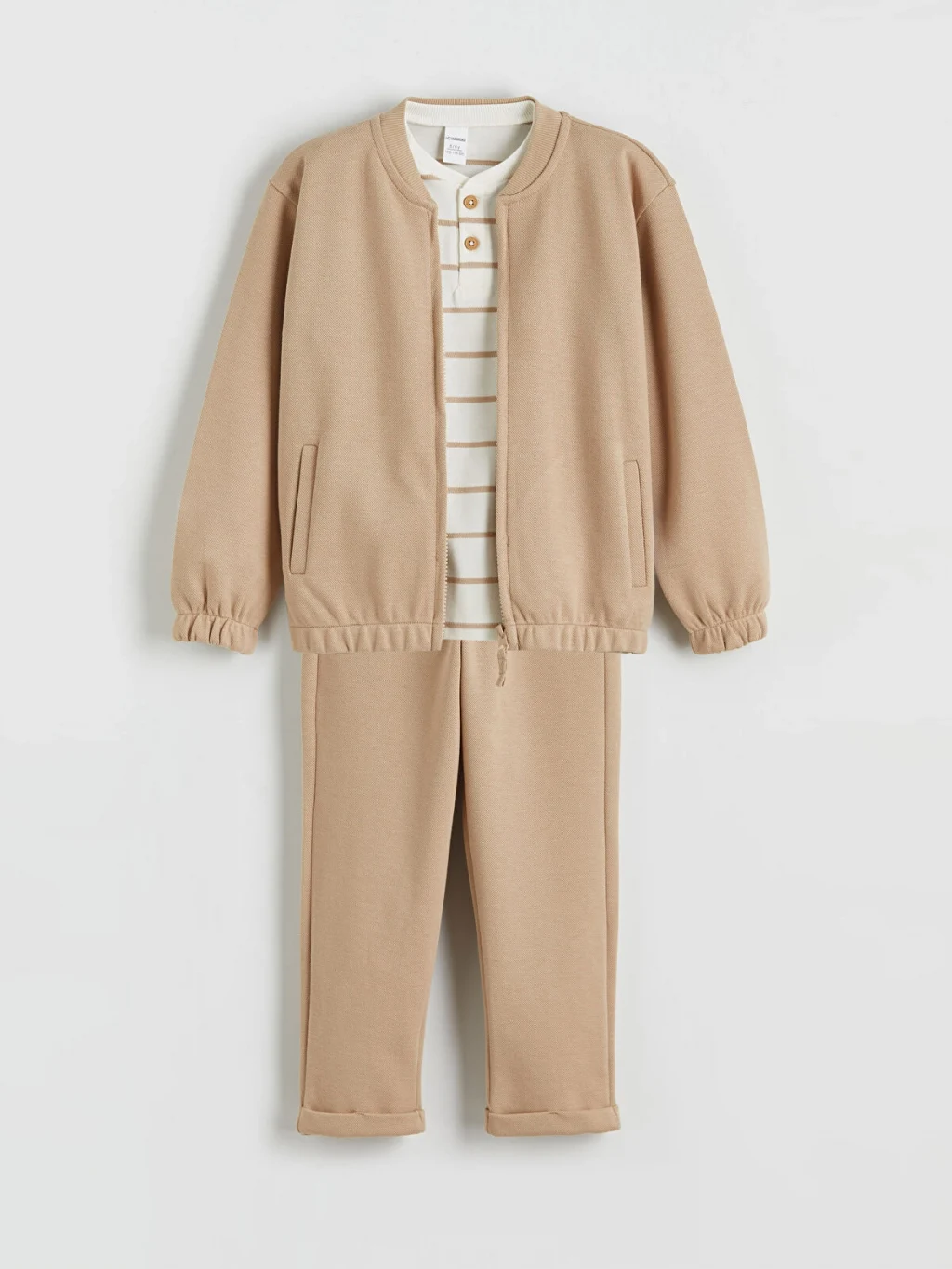 Erkek çocuk 3'lü takım; fermuar kapamalı, bisiklet yakalı kolej ceket, yarım pat düğmeli, çizgili tişört ve beli lastikli eşofman alttan oluşur.