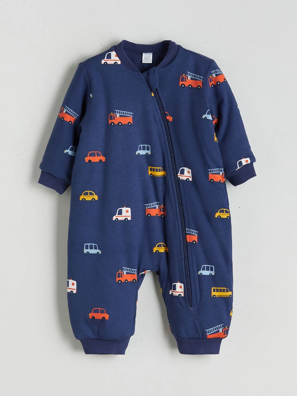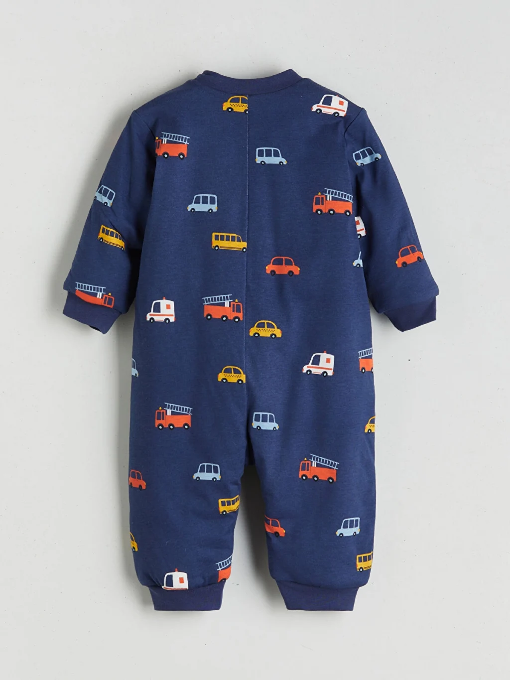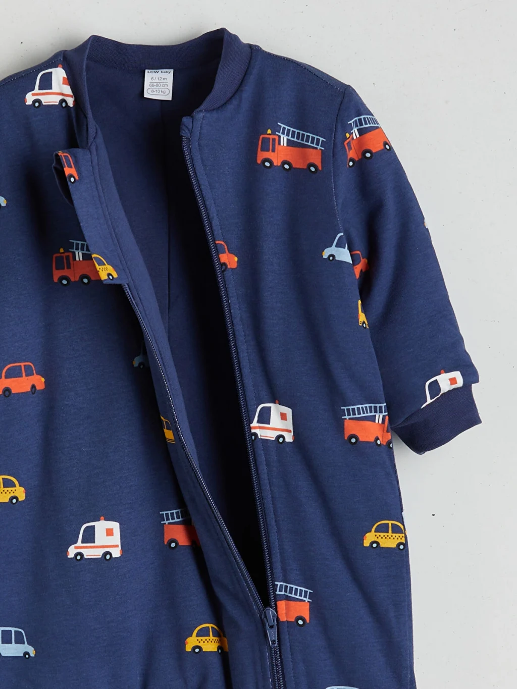 Bisiklet yaka, uzun kollu ve araç desenli erkek bebek uyku tulumu, penye kumaşa sahiptir. Asimetrik fermuar kapamalıdır, kol ve paça uçları ribanalıdır.