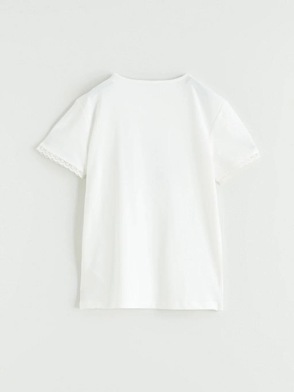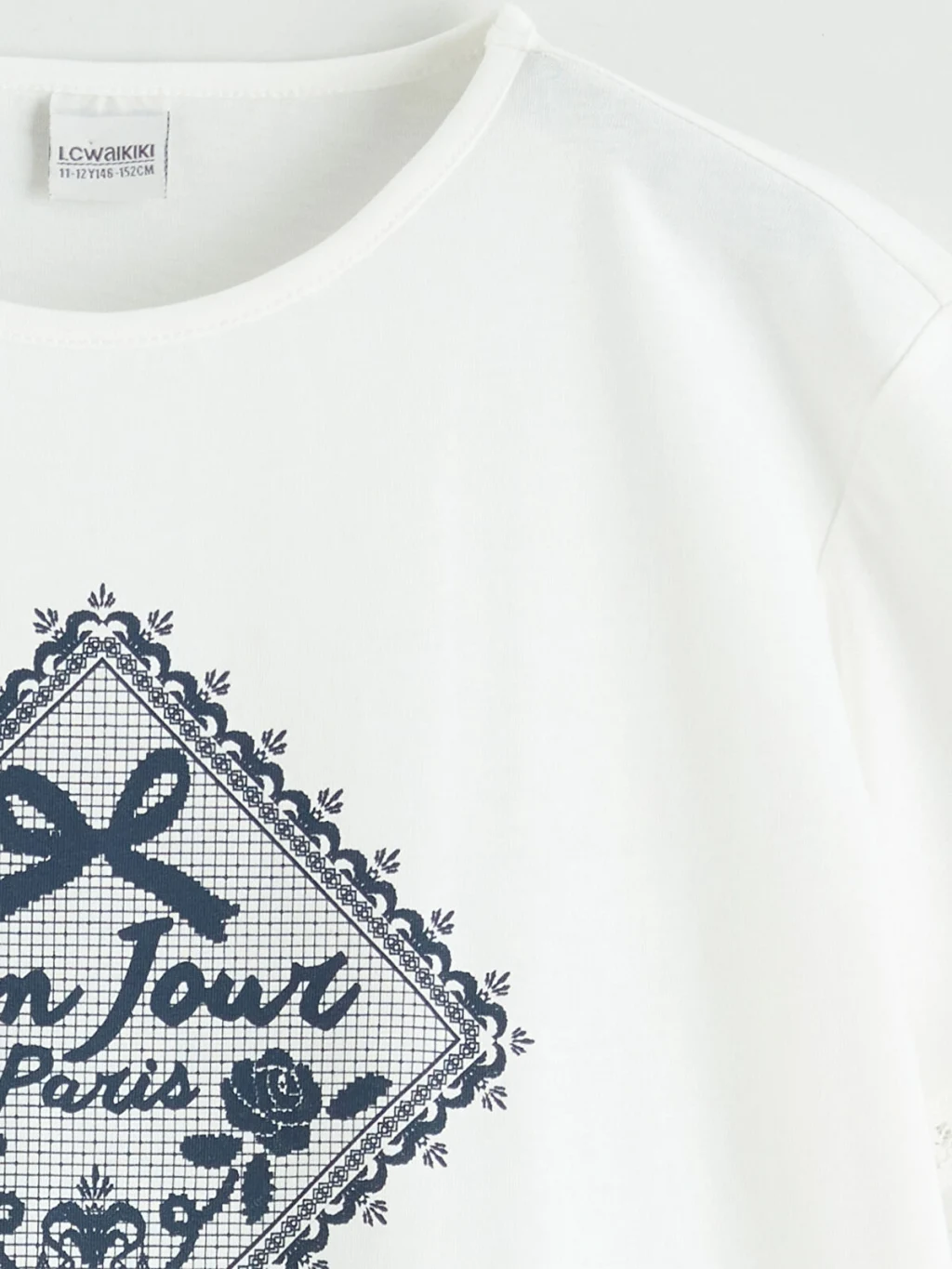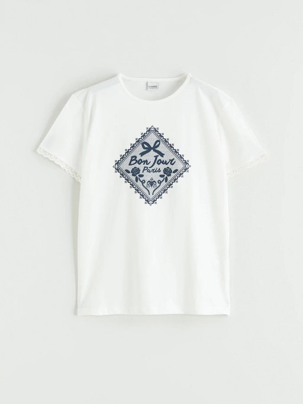 Kız çocuk tişört, bisiklet yakalı ve kısa kolludur. Önü baskılı ürünün kol uçları dantel detaylıdır. %100 pamuklu penye kumaştan üretilmiştir.