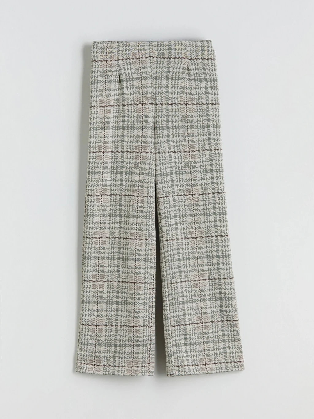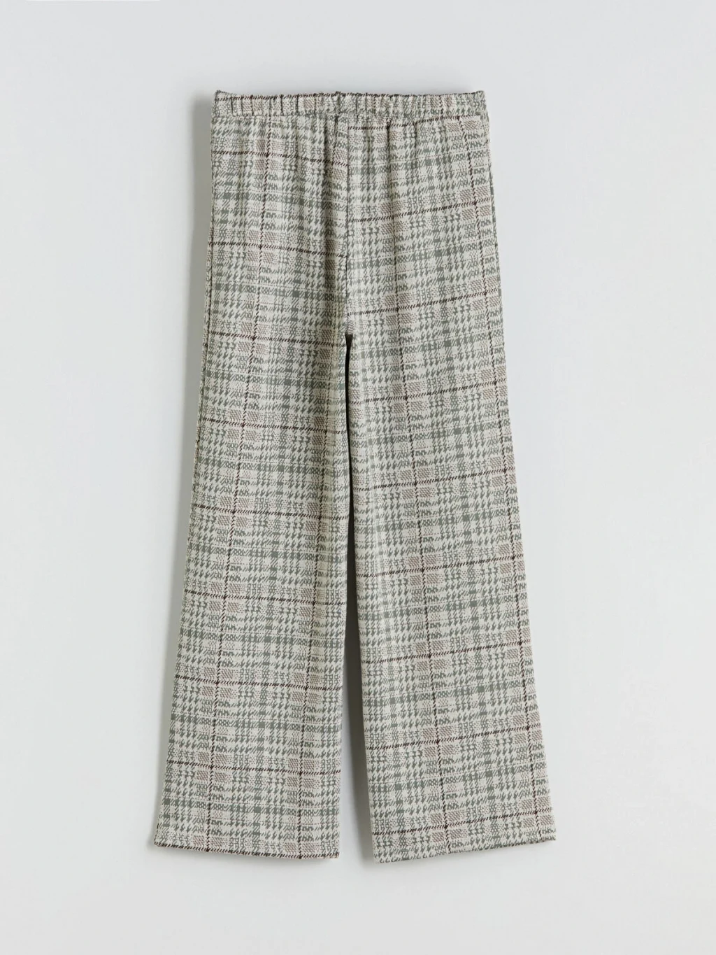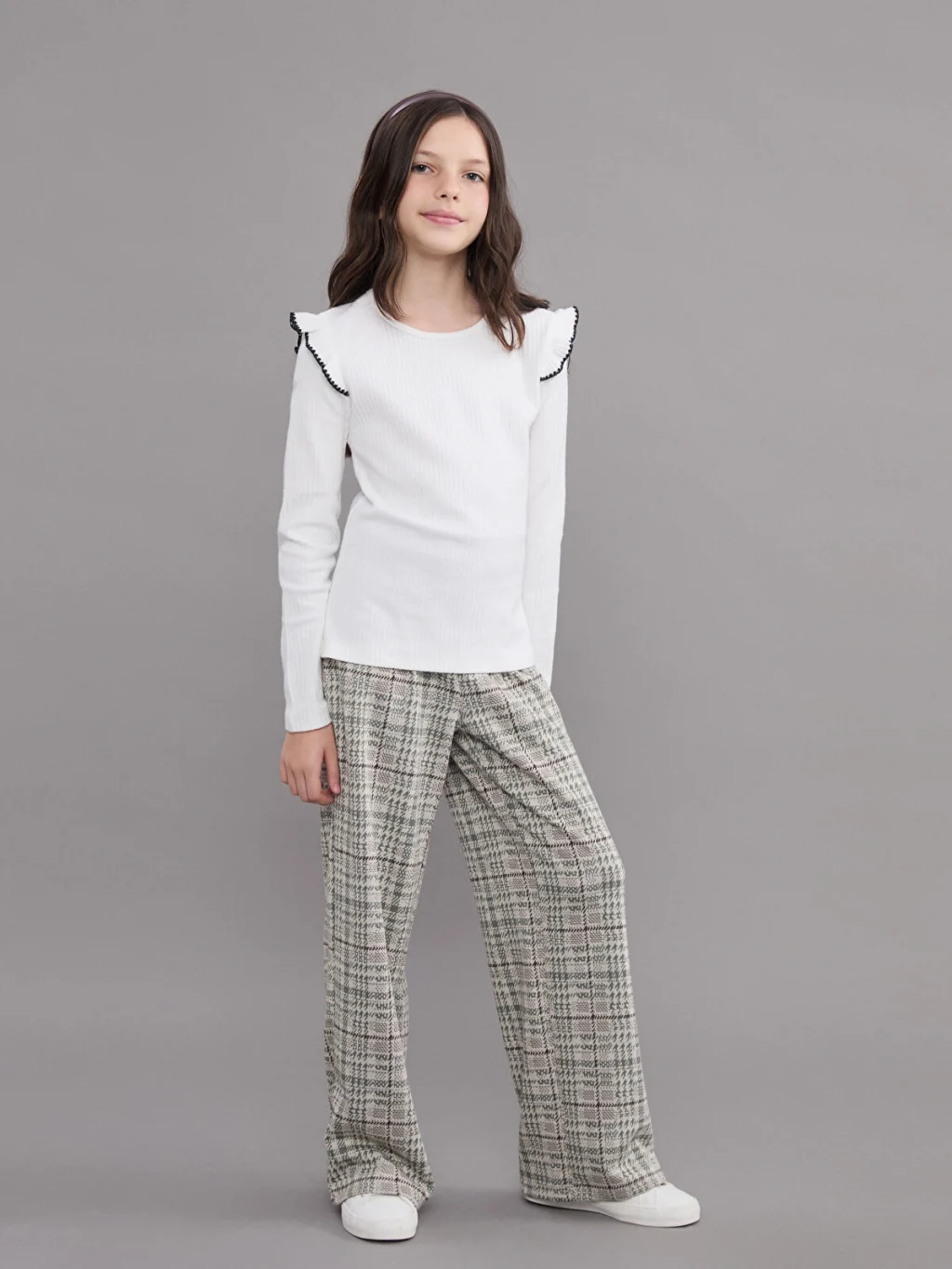 Wideleg kız çocuk pantolon, yüksel bel ve geniş paça kesime sahiptir. Pileli ve beli lastiklidir.
