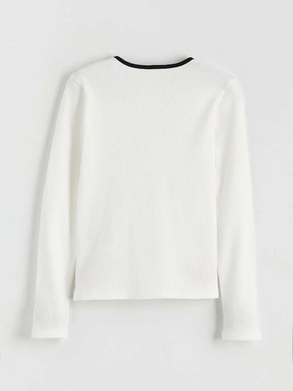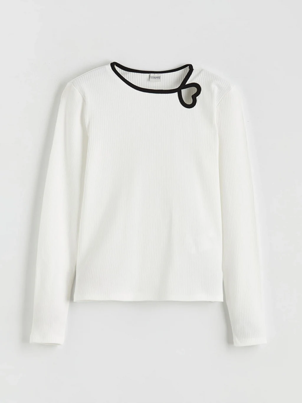Dar kalıplı kız çocuk tişört, yüksek pamuk içerikli kaşkorse kumaştan üretilmiştir. Uzun kollu ve kalp şeklinde kesik detaylı bisiklet yakalıdır.