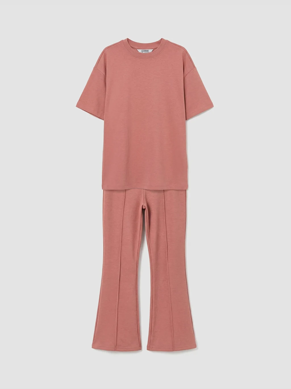 Kız çocuk takım, bisiklet yaka ve kısa kollu tişört ile beli lastikli, İspanyol paça ve önü dikiş detaylı pantolondan oluşur.