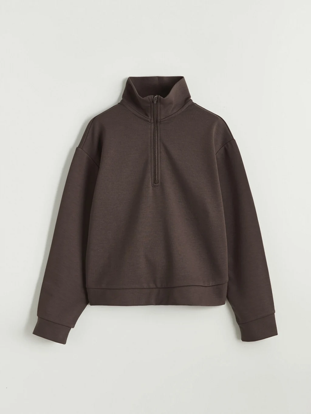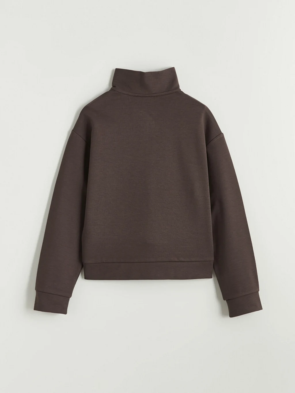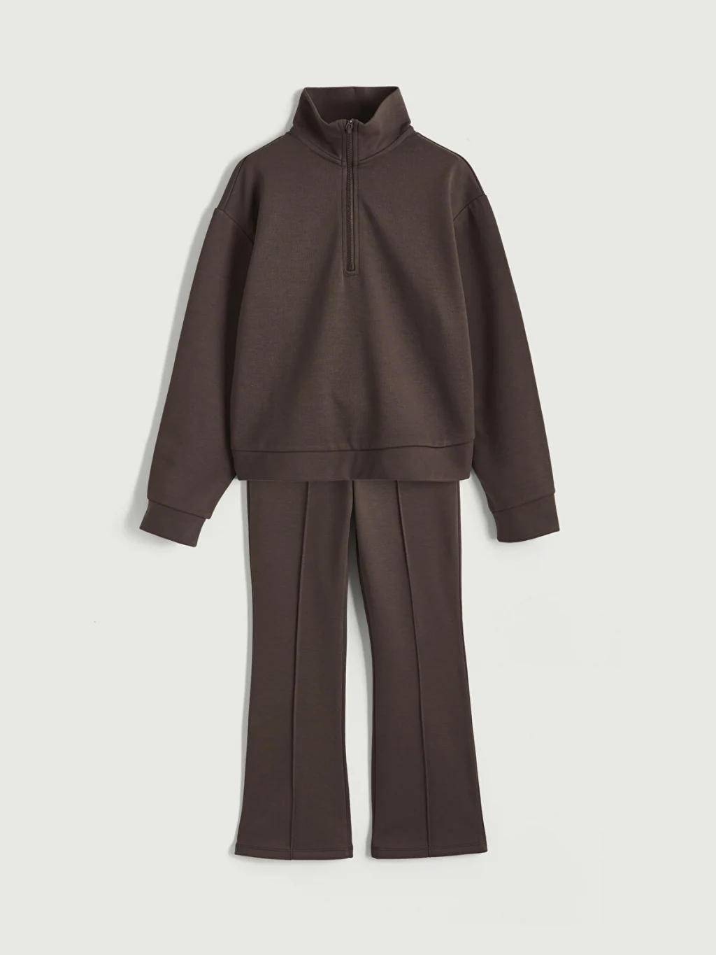 İnterlok kumaşlı kız çocuk takım; uzun kollu, yüksek yakalı, yarım fermuarlı sweatshirt ve önü dikiş detaylı, İspanyol paça pantolondan oluşur.