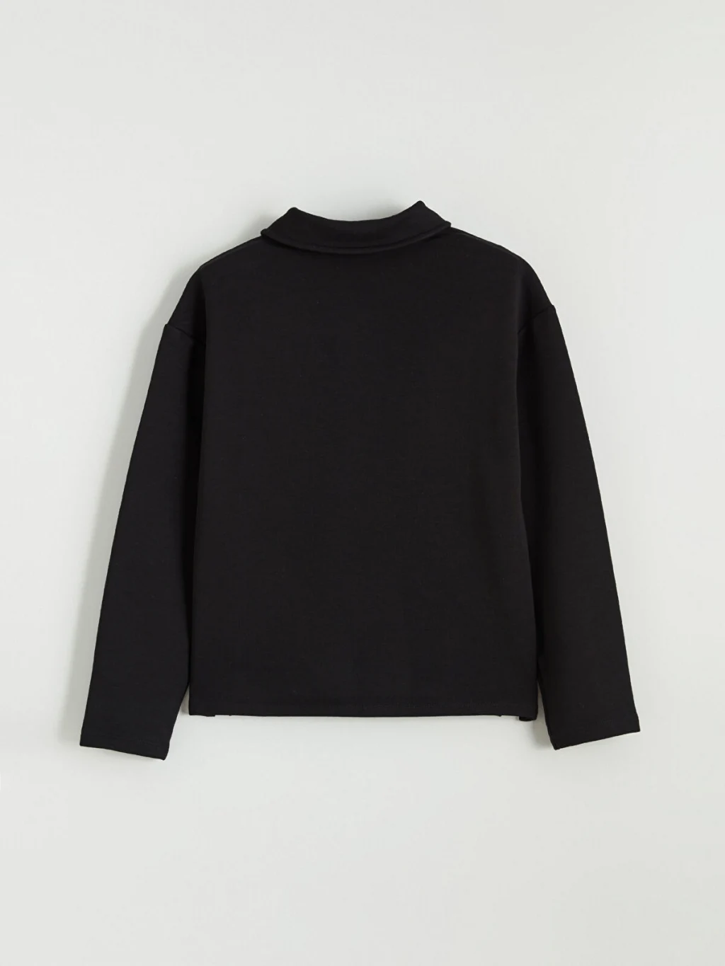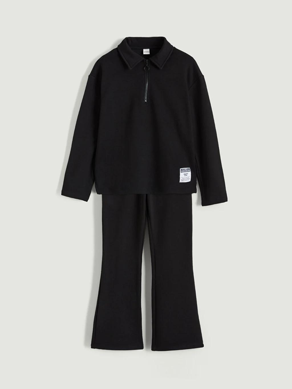 Kız çocuk set, polo yakalı, uzun kollu ve yarım fermuar kapamalı bir sweatshirt ve ispanyol paça bir pantolondan oluşur.