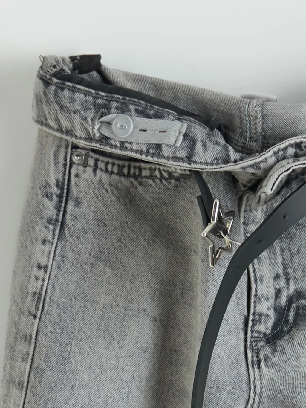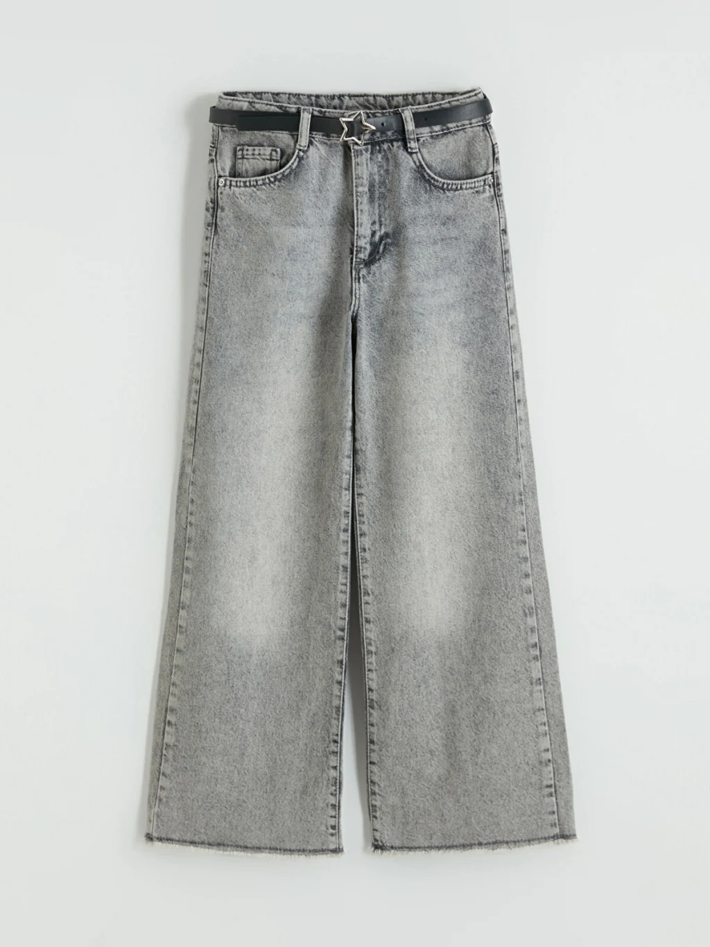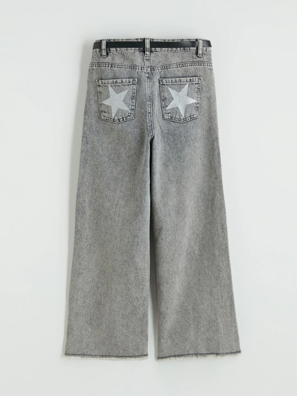 Geniş paça kesimli kız çocuk jean pantolon, %100 pamuklu denim kumaştan üretilmiştir. Beş cepli tasarıma sahiptir, fermuar ve düğme kapamalıdır. Kemerlidir.