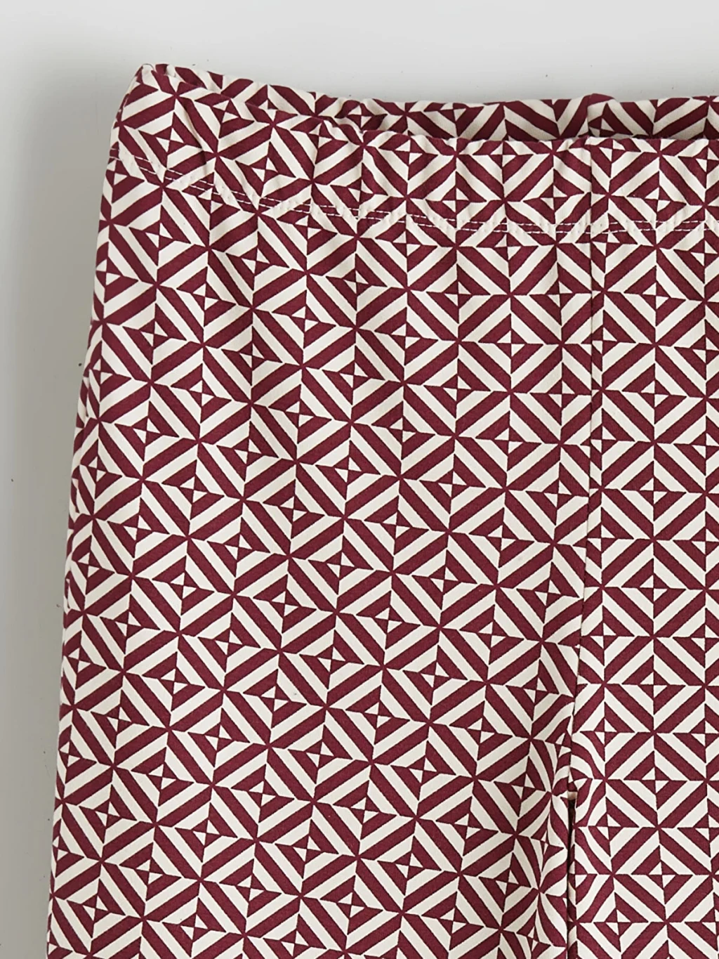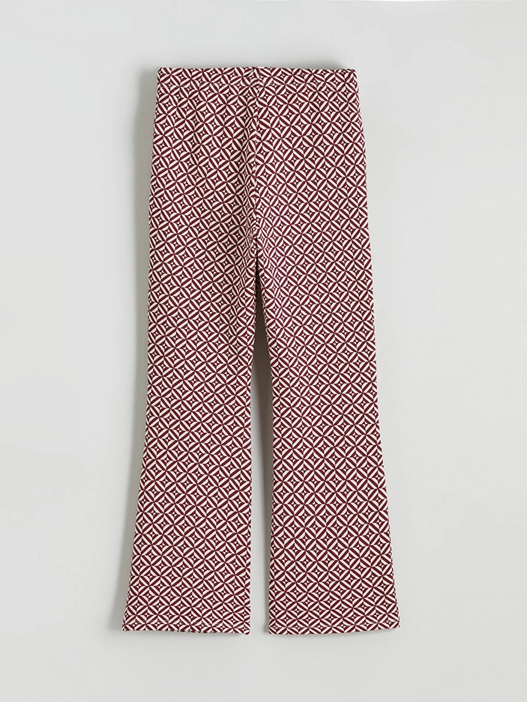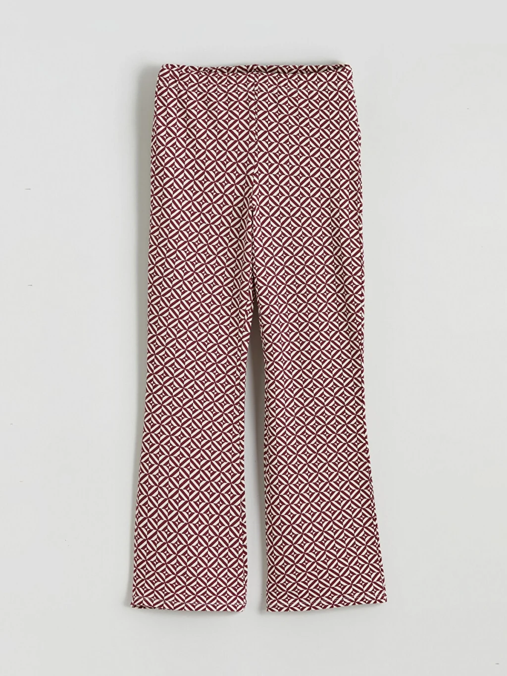 Yüksek pamuk içerikli 2 iplik kumaştan üretilen, geometrik desenli kız çocuk tayt, ispanyol paça kesime ve lastikli bele sahiptir.