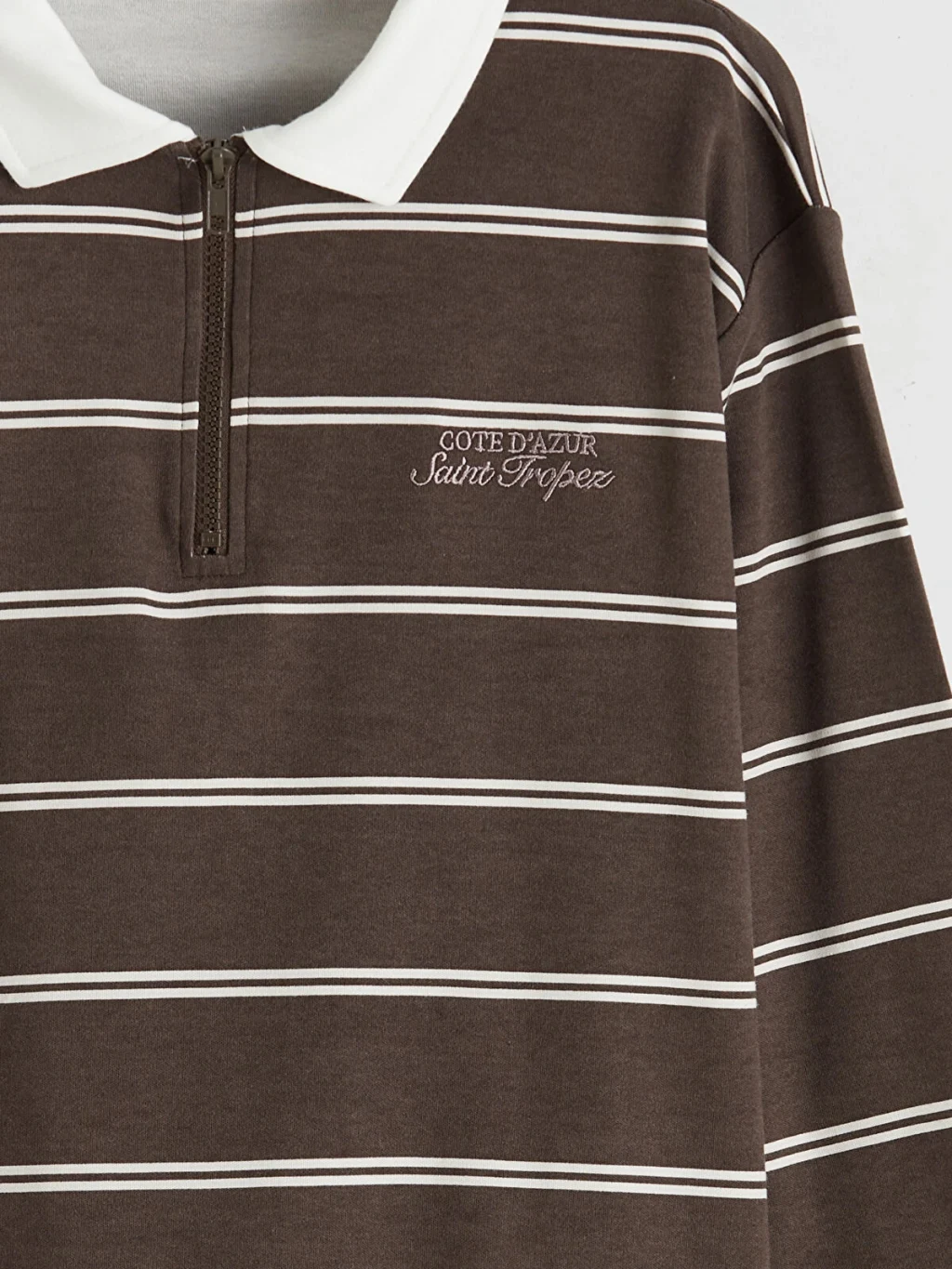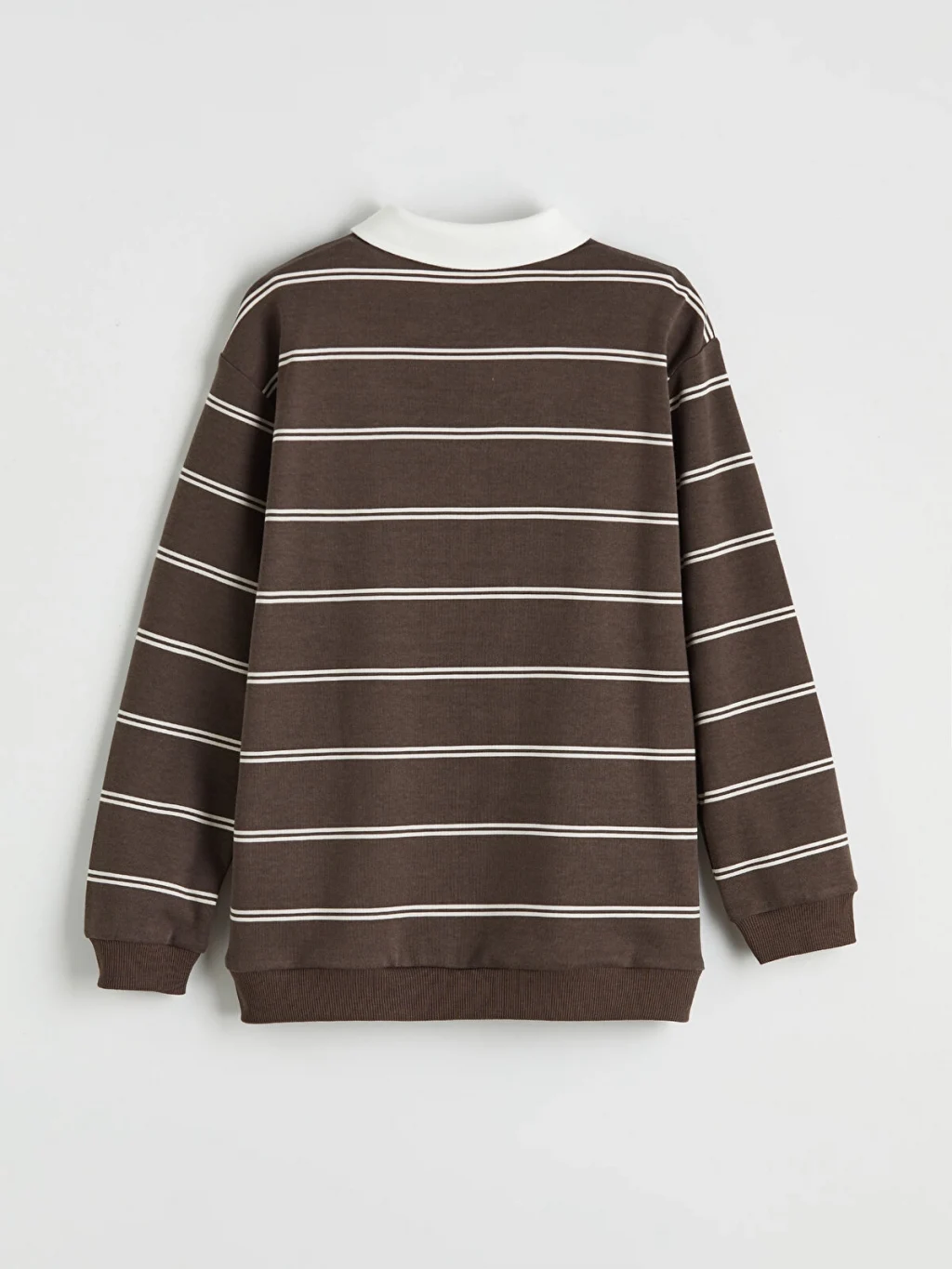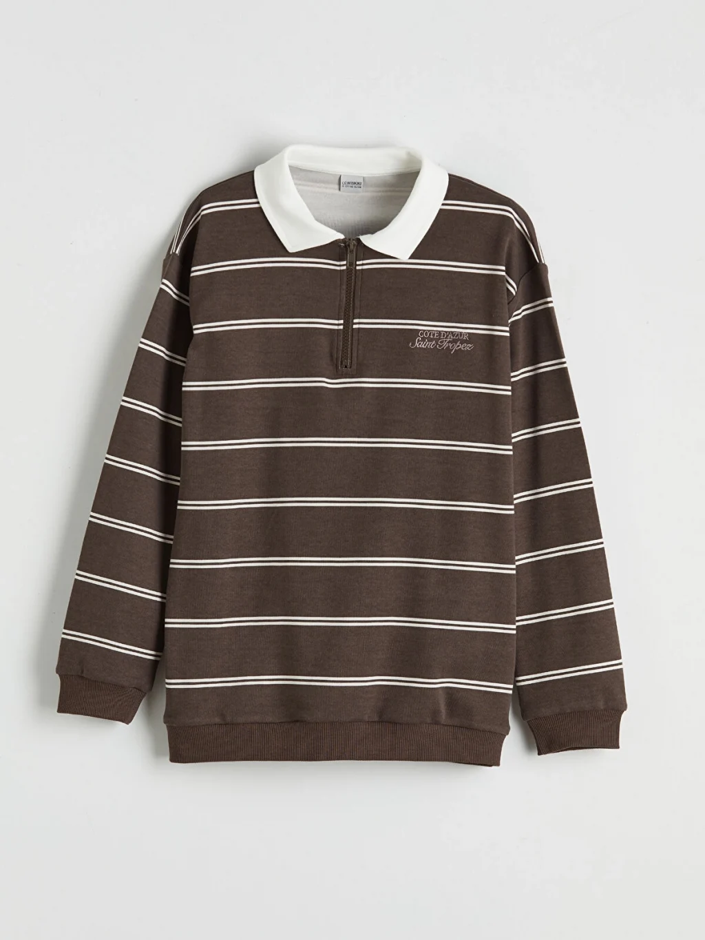 Polo yakalı, uzun kollu ve çizgili erkek çocuk tişört, %100 pamuk içerikli interlok kumaştan üretilmiştir. Yarım fermuar kapamalıdır.