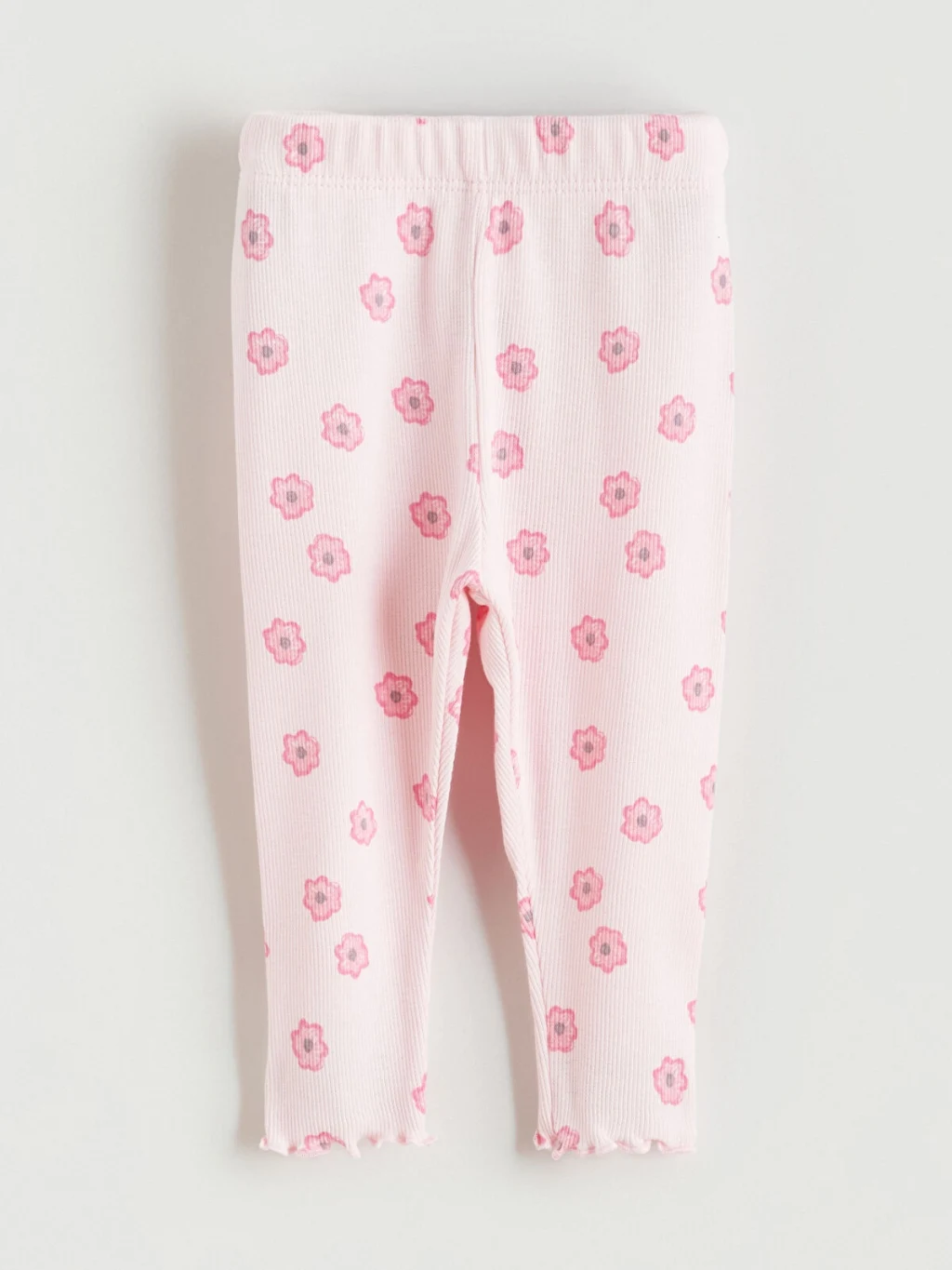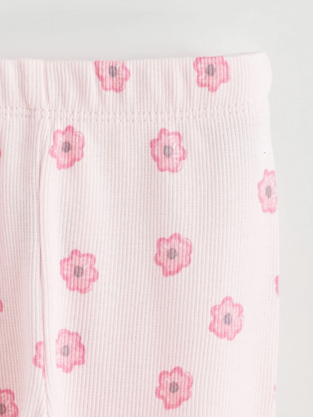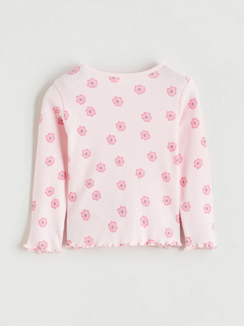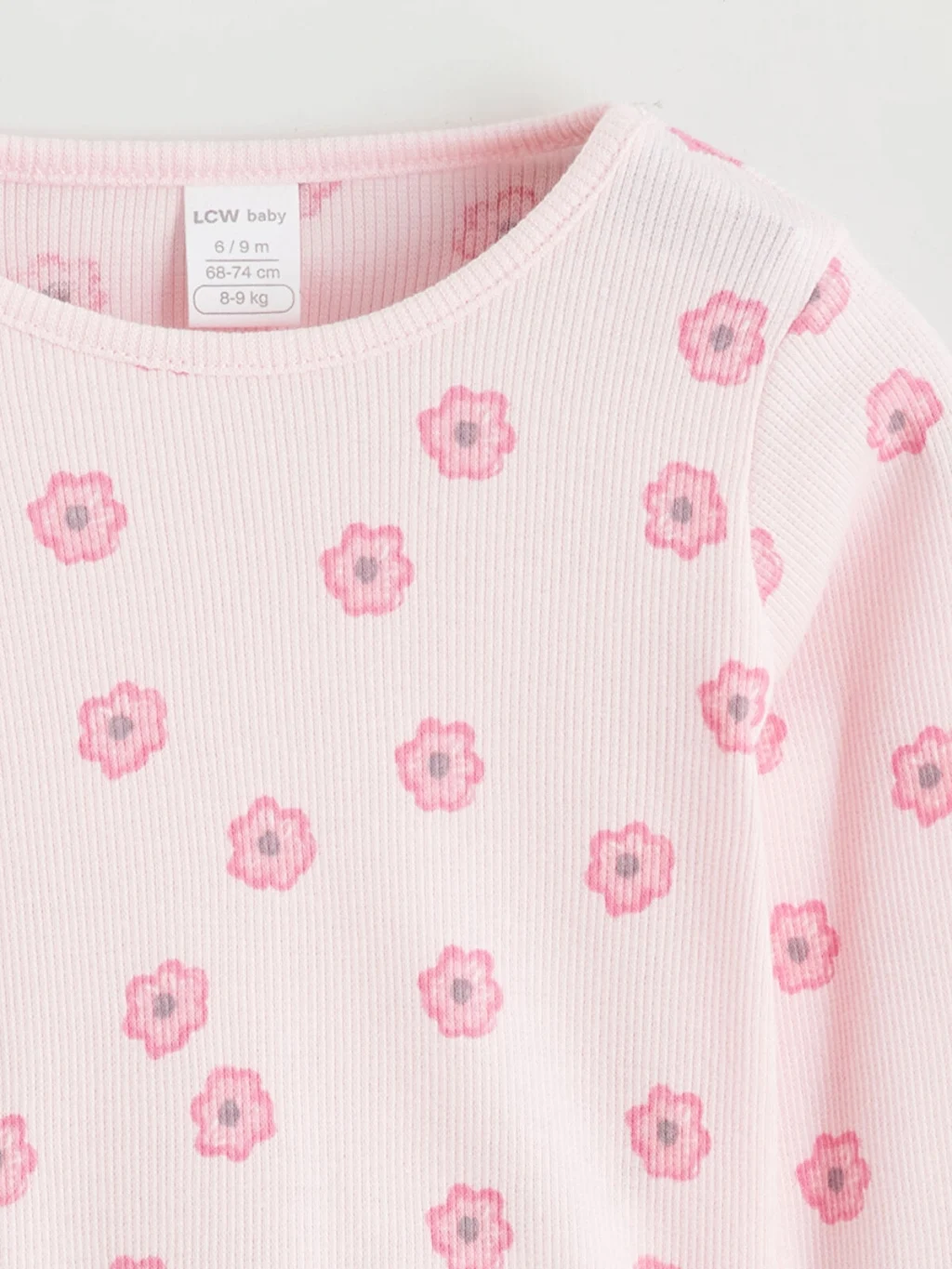 Kız bebek pijama takımı, bisiklet yaka, uzun kollu, çiçek desenli üst ve uzun paçalı alttan oluşur; kol, paça ve etek ucu fırfırlıdır.