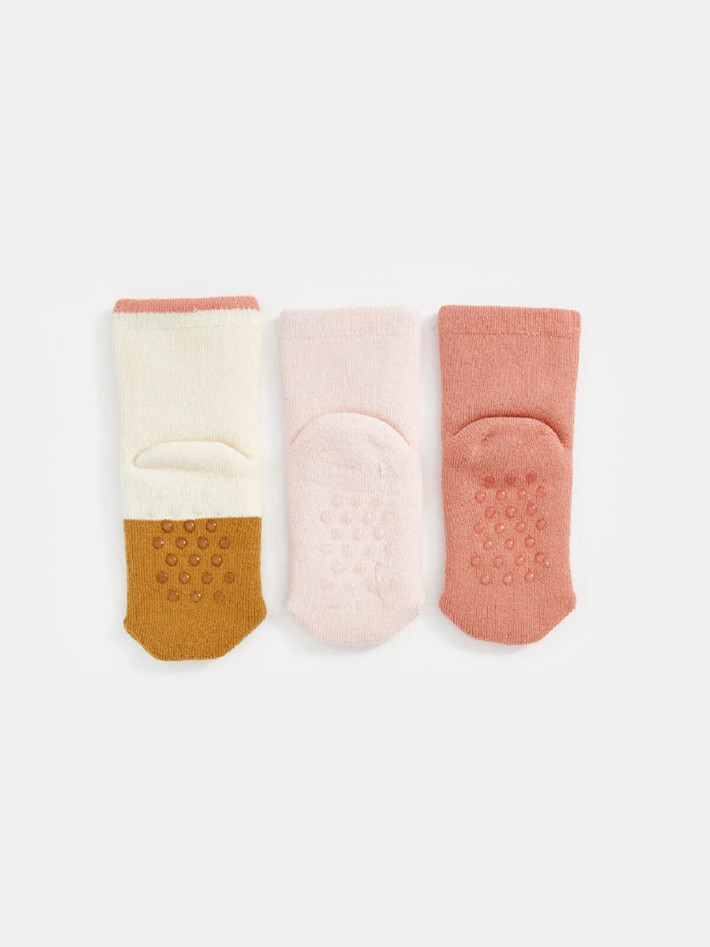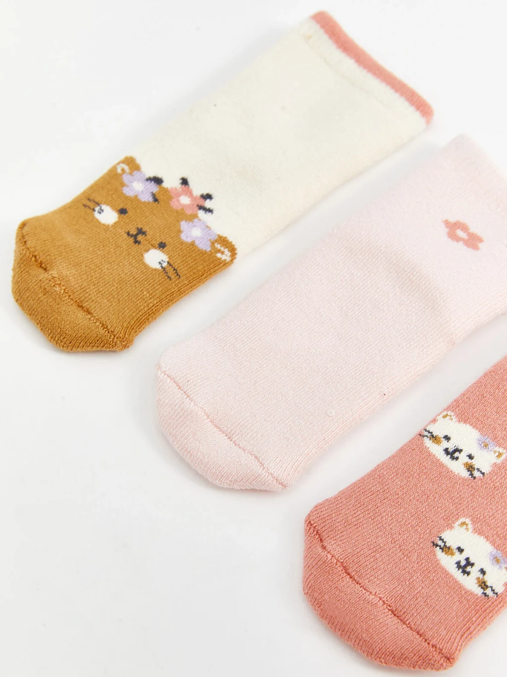 Kedi ve çiçek desenli farklı tasarımlara sahip kız bebek soket çorap seti, üç çiftten oluşur.