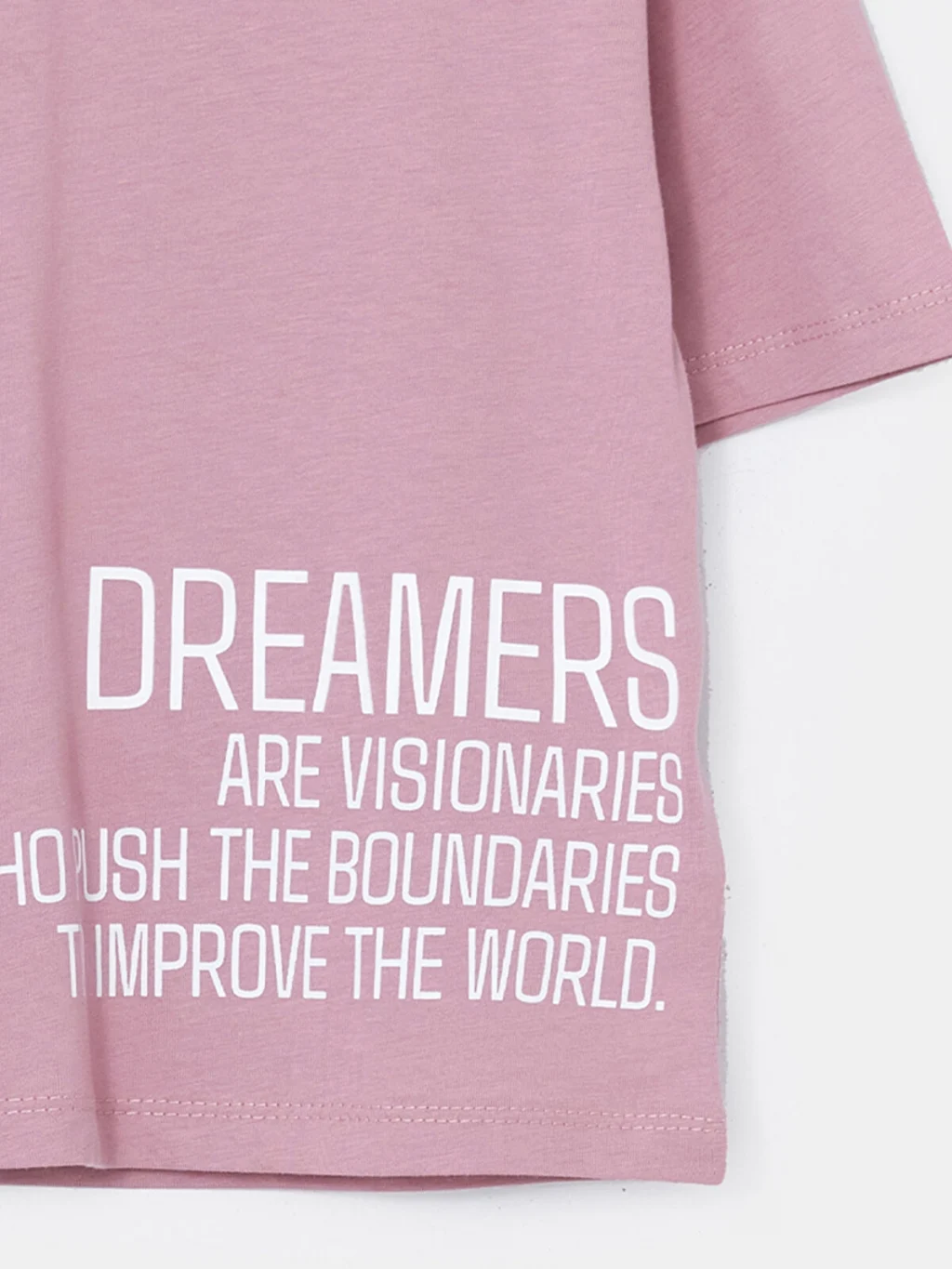 Bisiklet yaka, kısa kollu kız çocuk tişört, %100 pamuklu penye kumaştan üretilmiştir. Bol kalıplı ürünün ön yüzünde yazı baskısı bulunur.