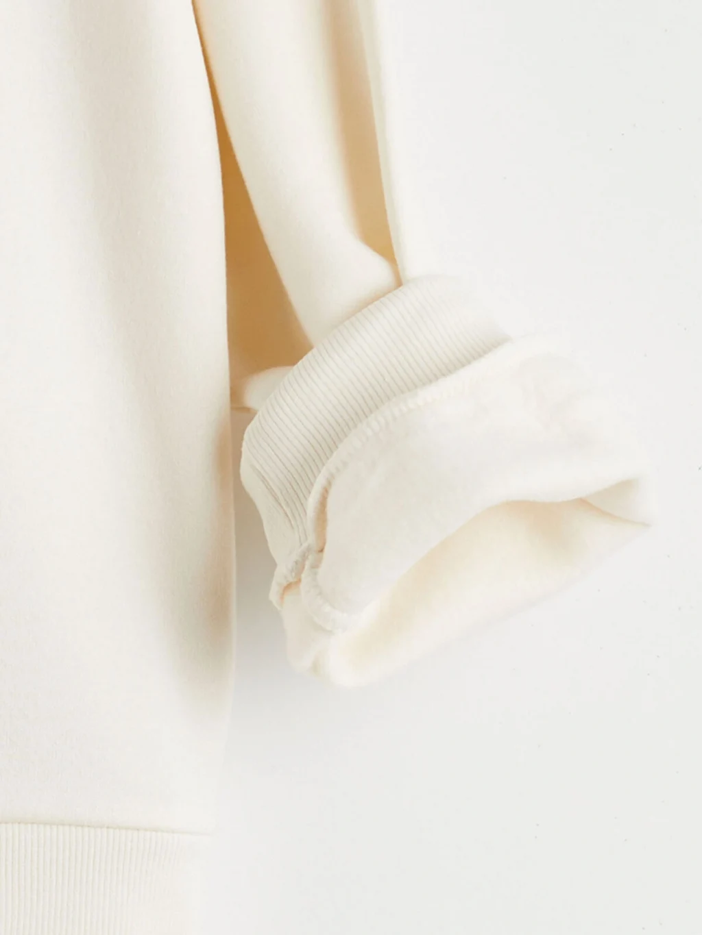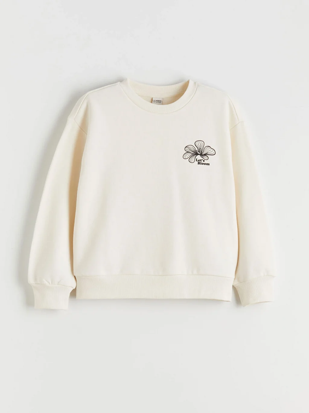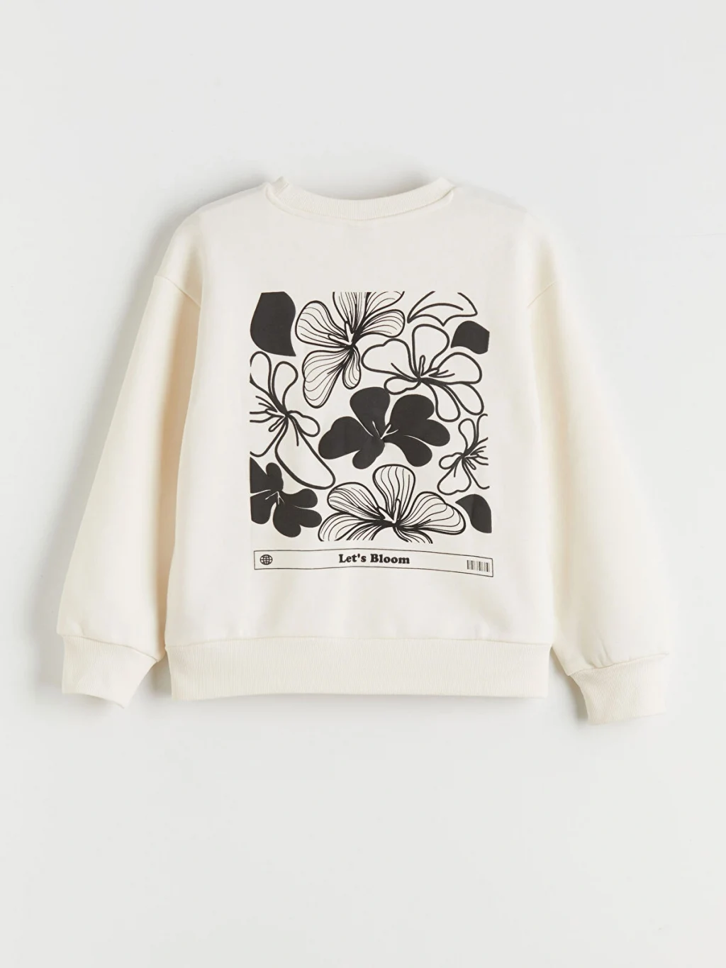 Bisiklet yakalı, düşük omuzlu kız çocuk sweatshirt, kalın 3 iplik şardonlu kumaştan üretilmiştir. Uzun kollu olup, göğsünde çiçek ve yazı baskısı bulunur.