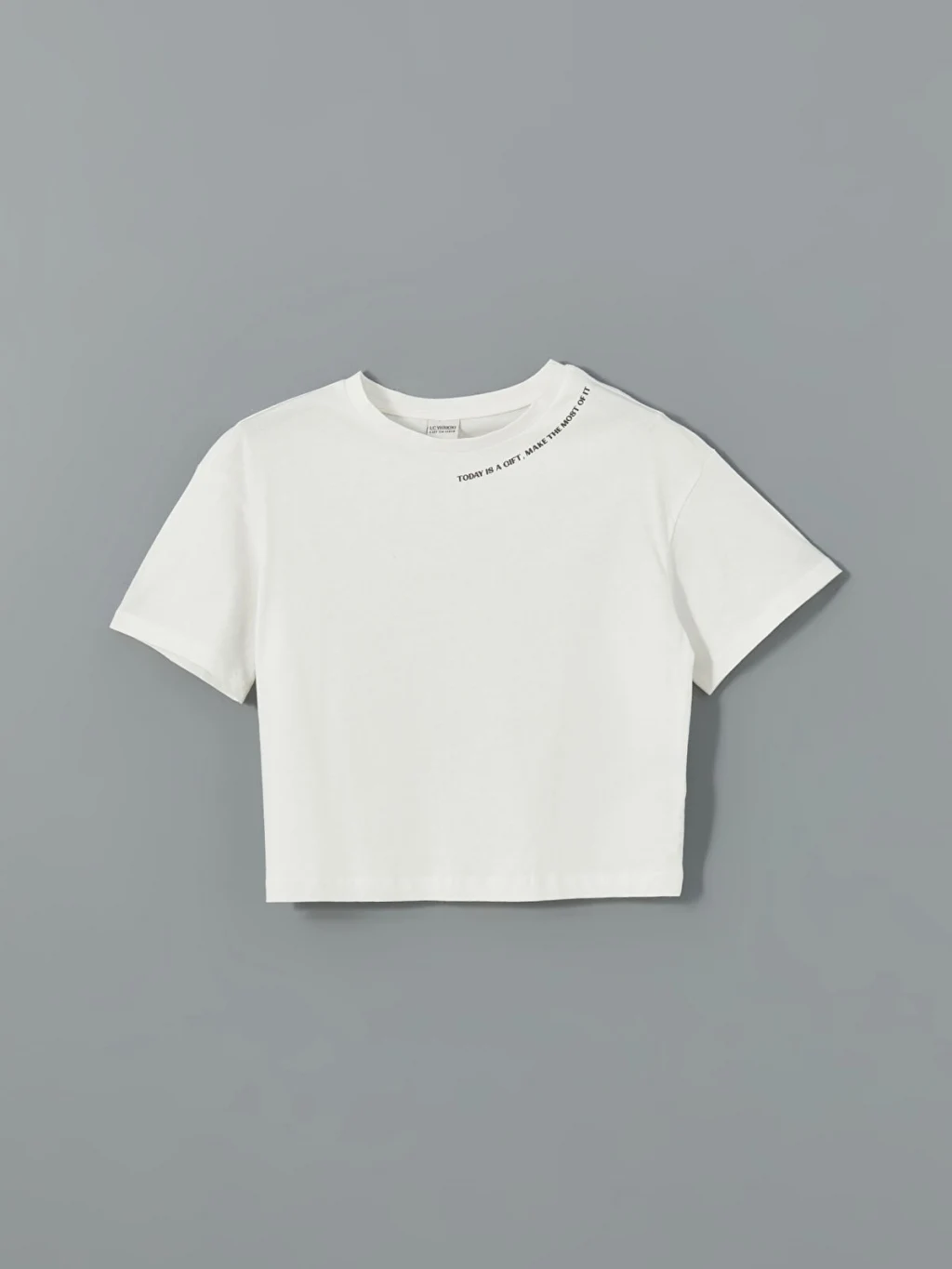 Bisiklet yaka, kısa kollu ve bol kalıplı kız çocuk tişört, %100 pamuklu penye kumaştan üretilmiştir. Yaka kısmında yazı baskısı detayı bulunur.