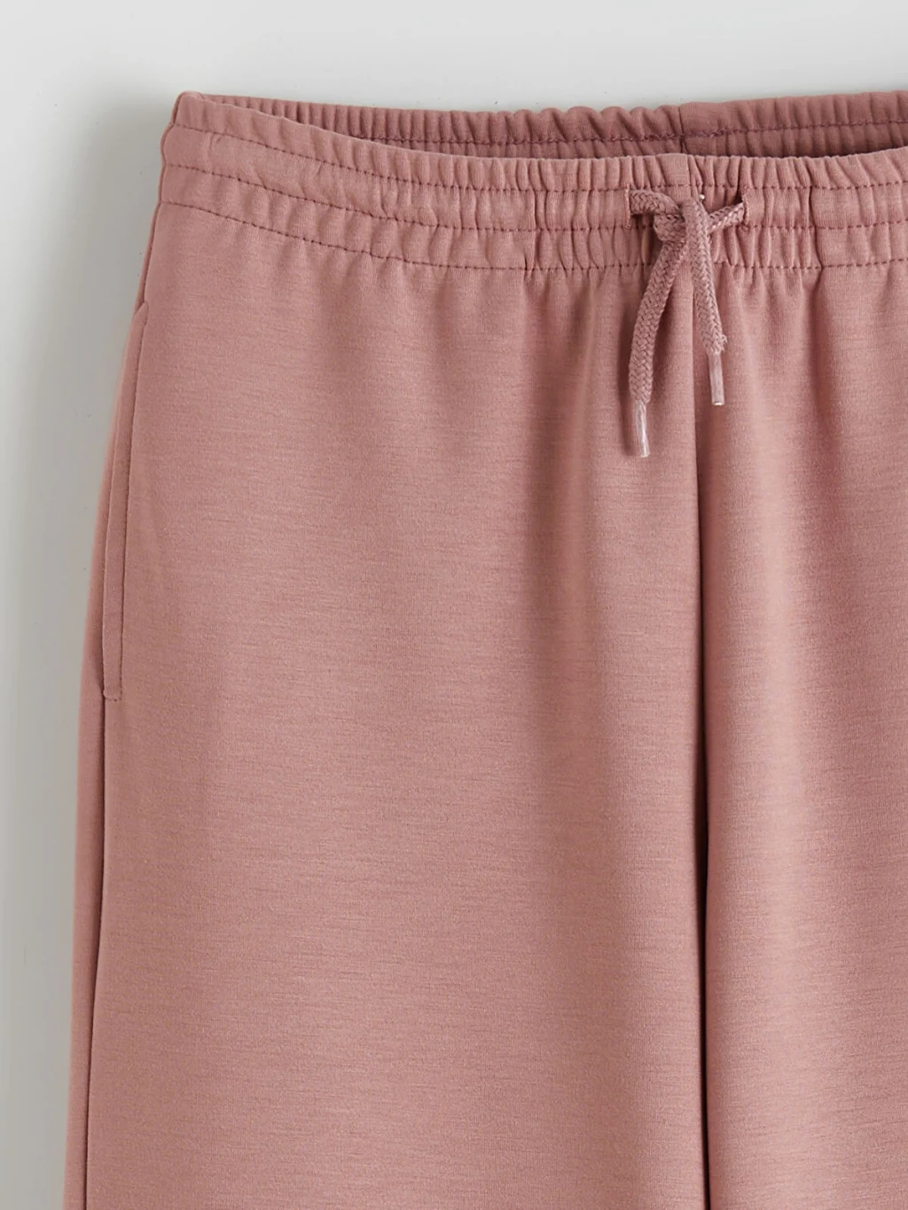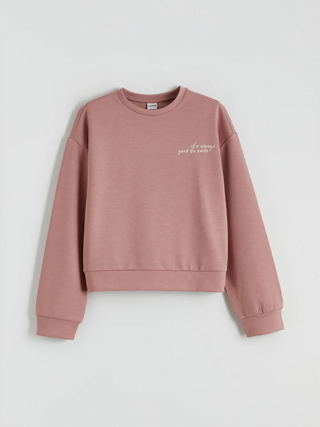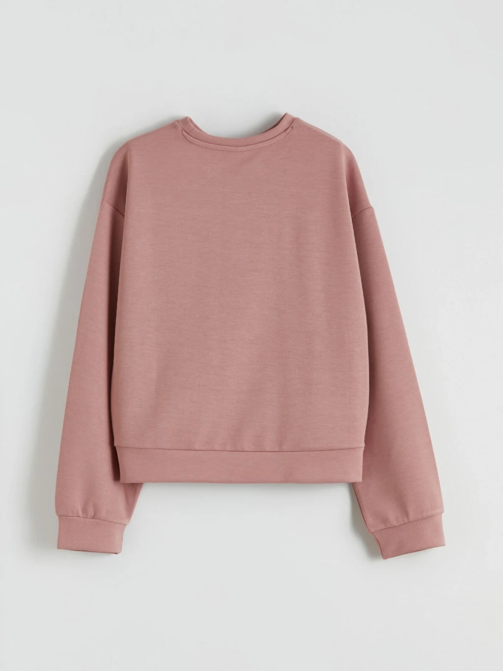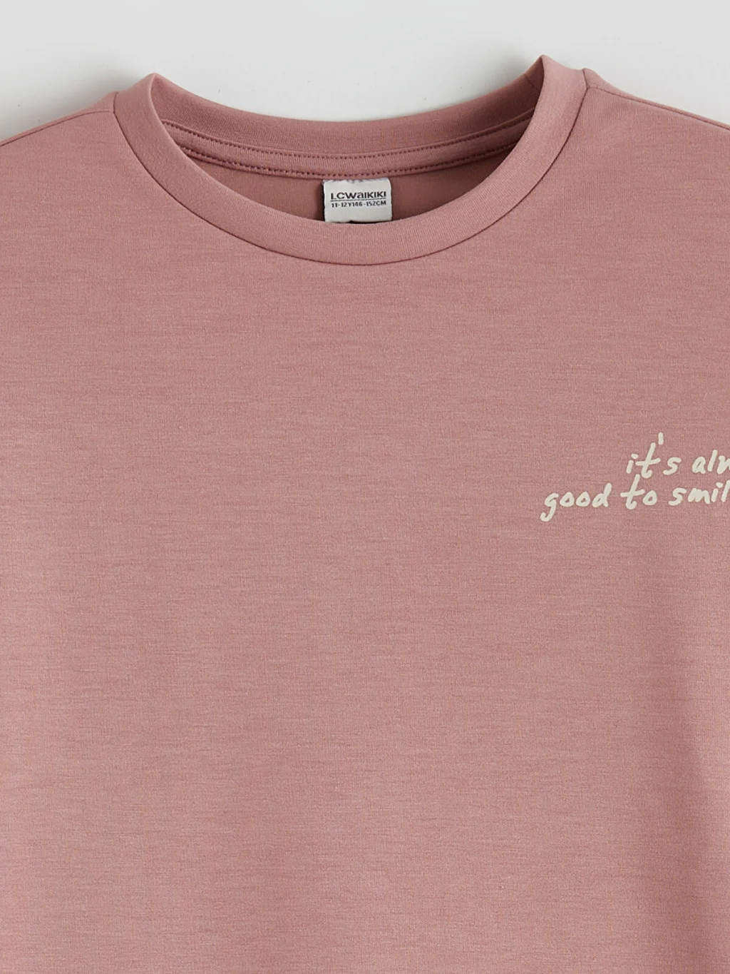 İnterlok kumaştan üretilen kız çocuk takım, bisiklet yaka, uzun kollu, yazı işlemeli sweatshirt ve geniş paça pantolondan oluşur.