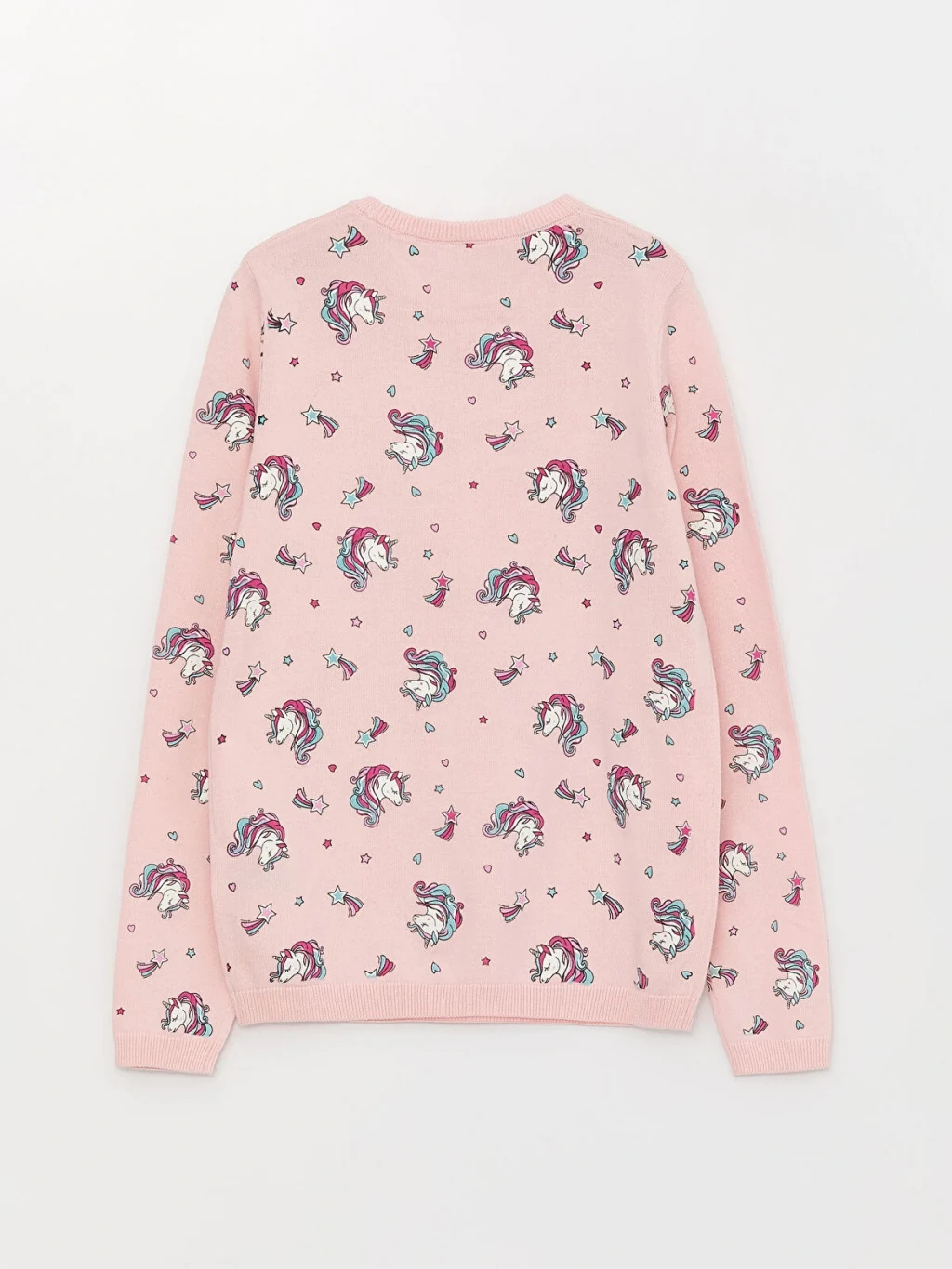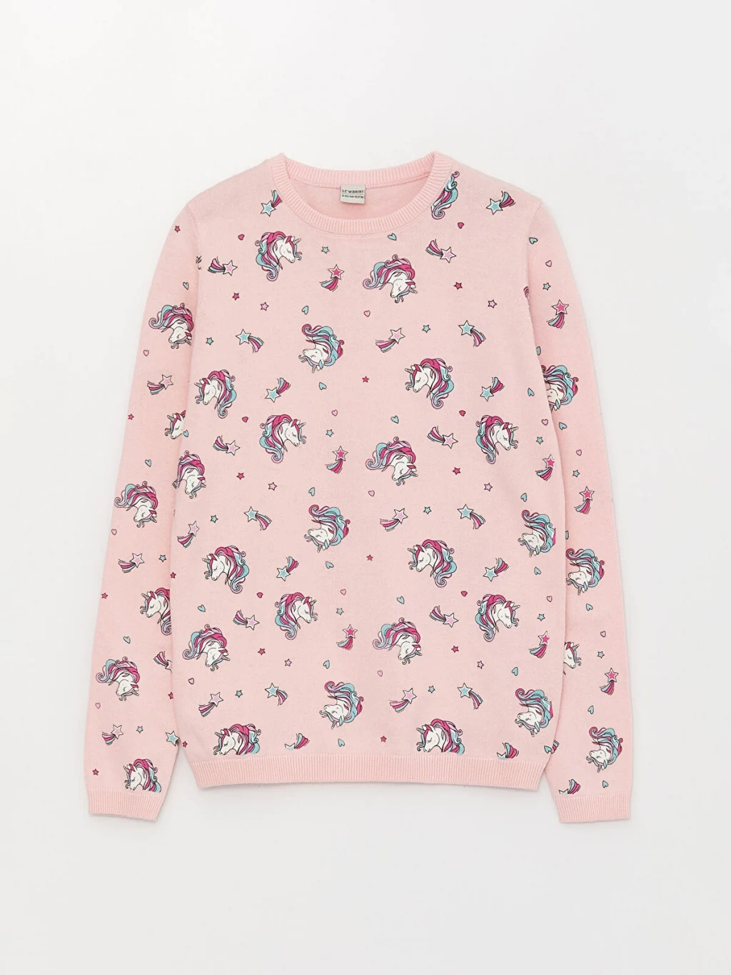 LCW Kids Pembe Bisiklet Yaka Baskılı Uzun Kollu Kız Çocuk Triko Kazak
