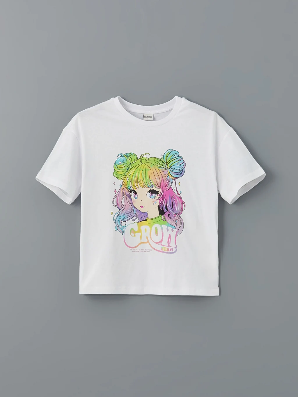 Bol kalıplı kız çocuk tişört, %100 pamuklu penye kumaştan üretilmiştir. Bisiklet yaka, kısa kollu ve önü baskılıdır.