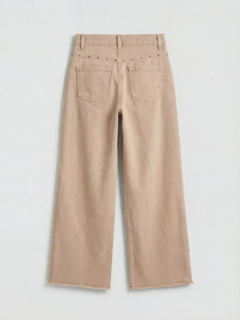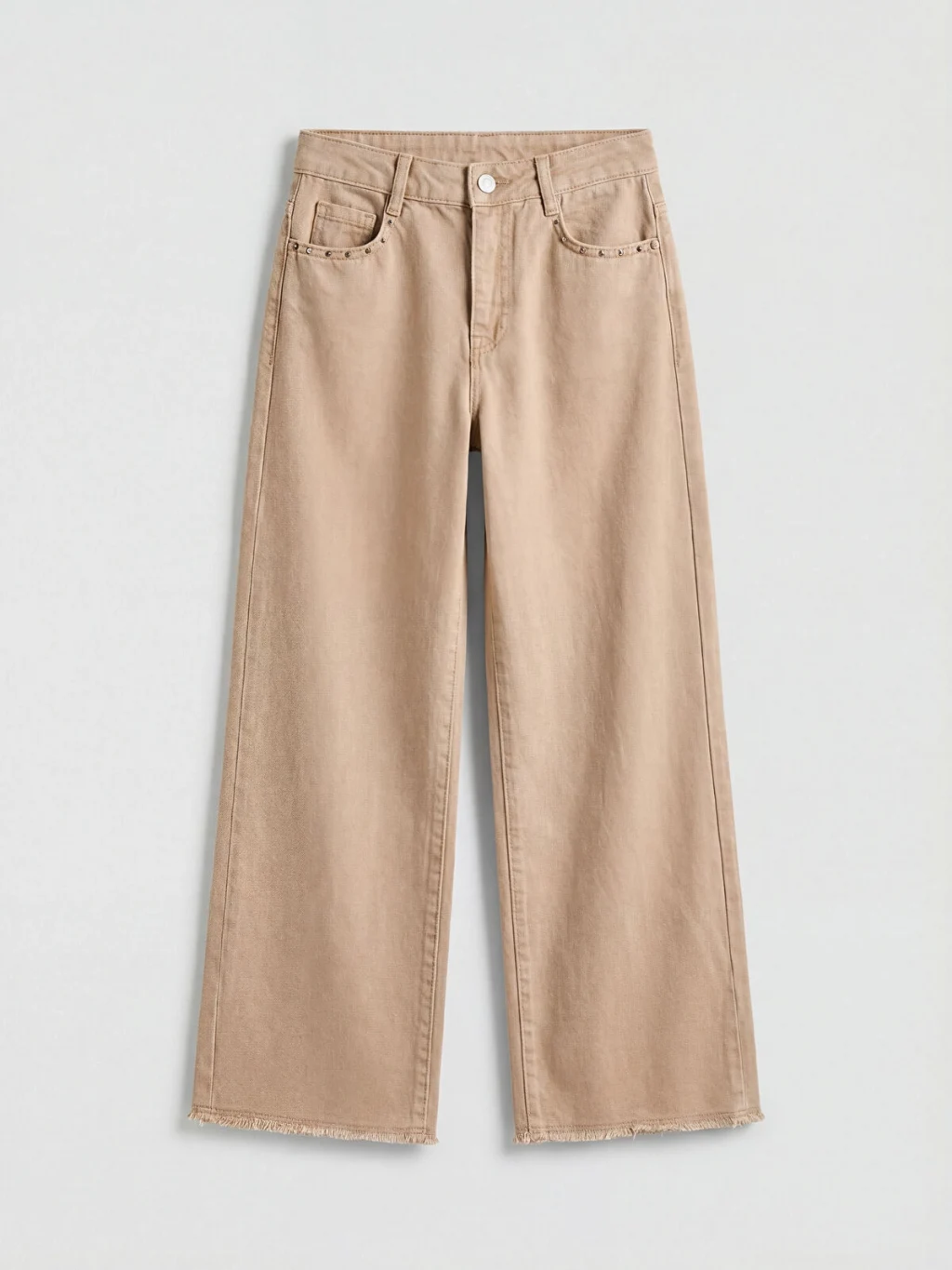 Geniş paçalı, beş cepli, fermuar ve düğme kapamalı kız çocuk jean pantolon, %100 pamuklu denim kumaştan üretilmiştir.