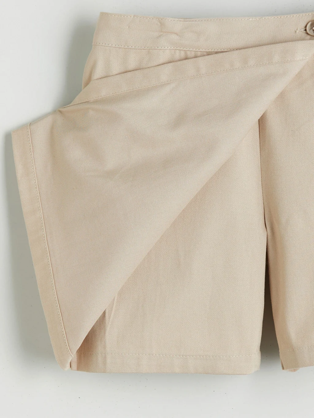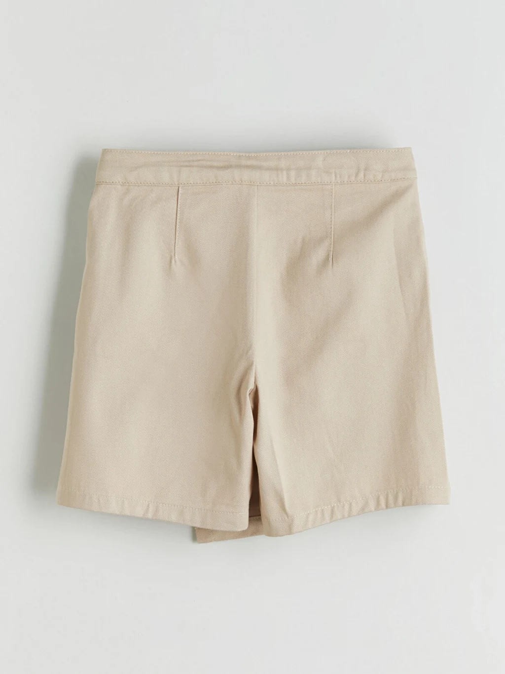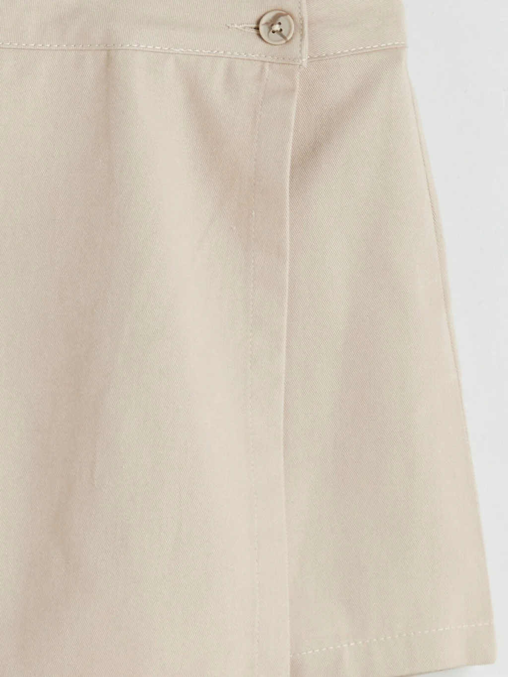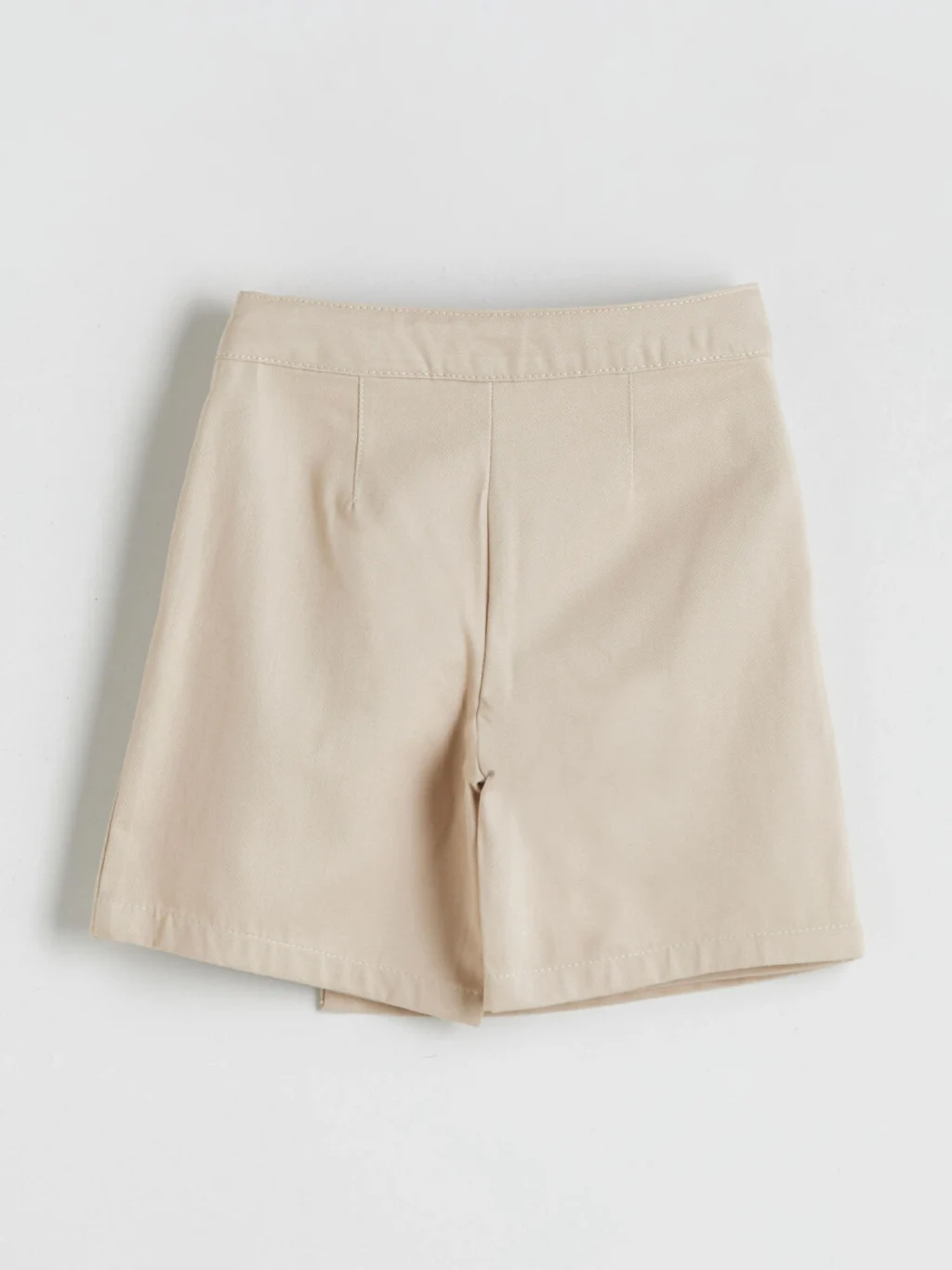 Anvelop kesimli ve düğme kapamalı kız çocuk şort etek, gabardin kumaştan üretilmiş olup kısa boyludur.