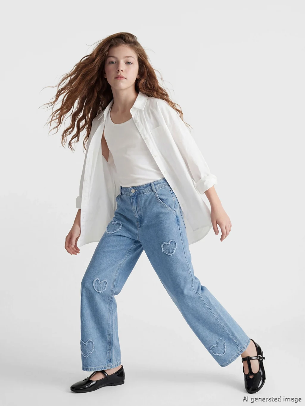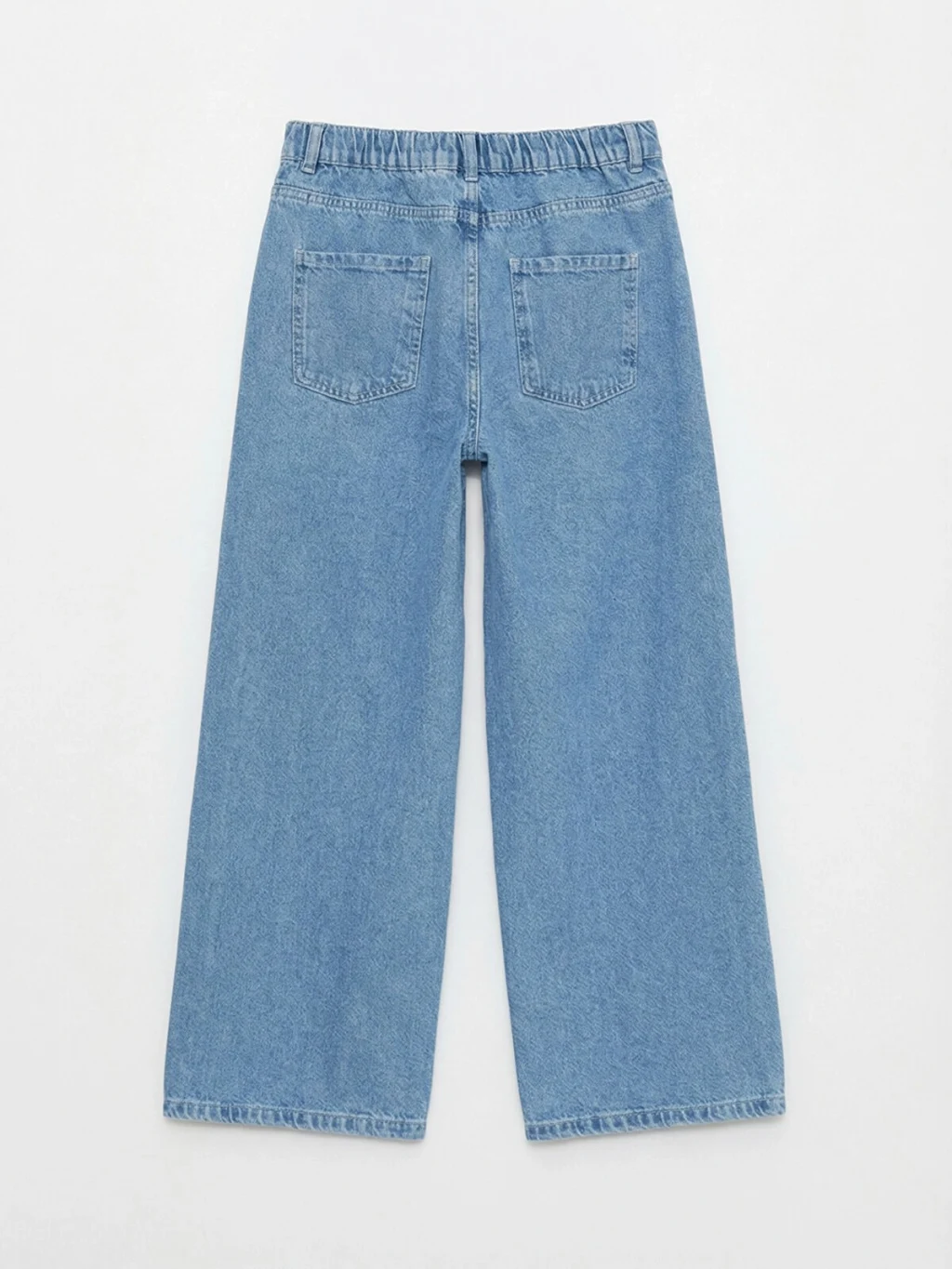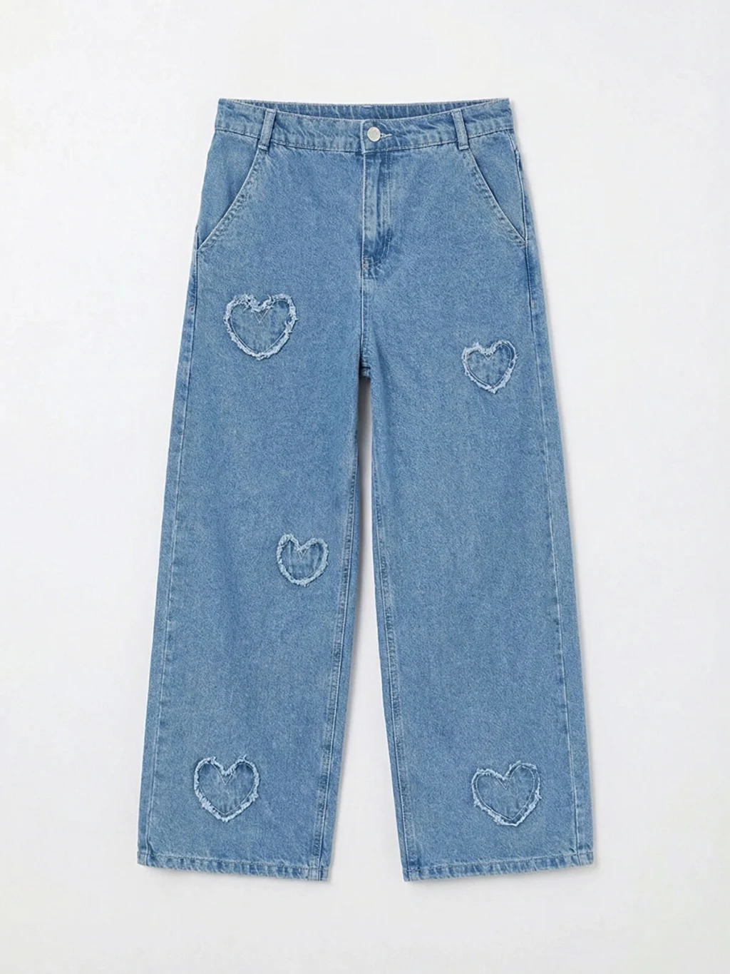 Wideleg kız çocuk jean pantolon, pamuklu denim kumaştan üretilmiştir. Kalp desenli nakış detaylıdır, fermuar ve düğme kapamalıdır.