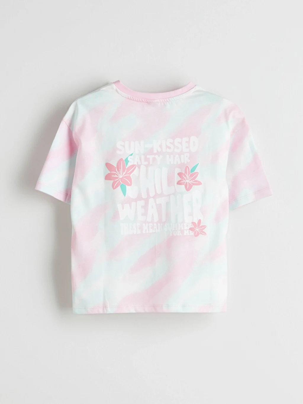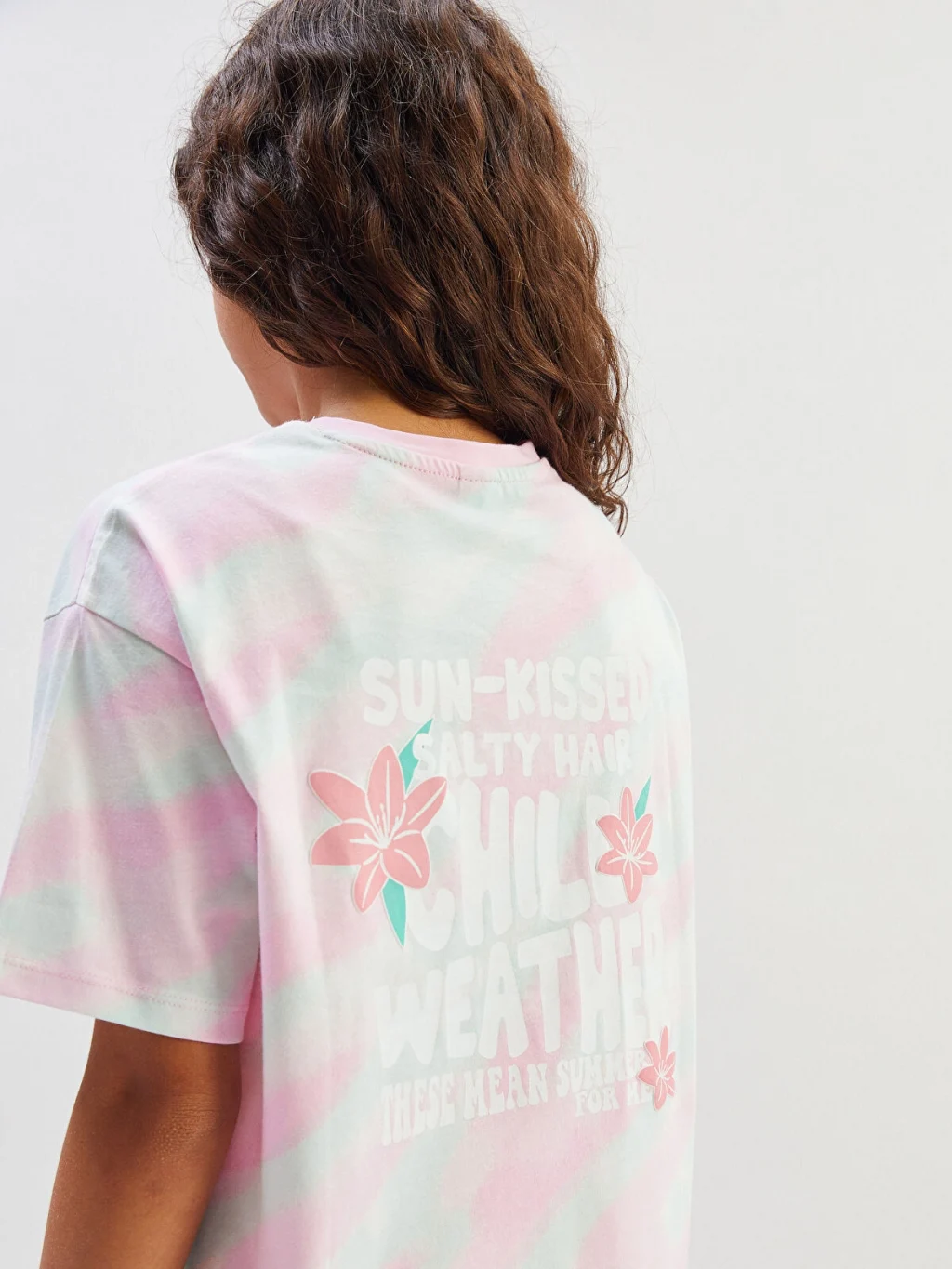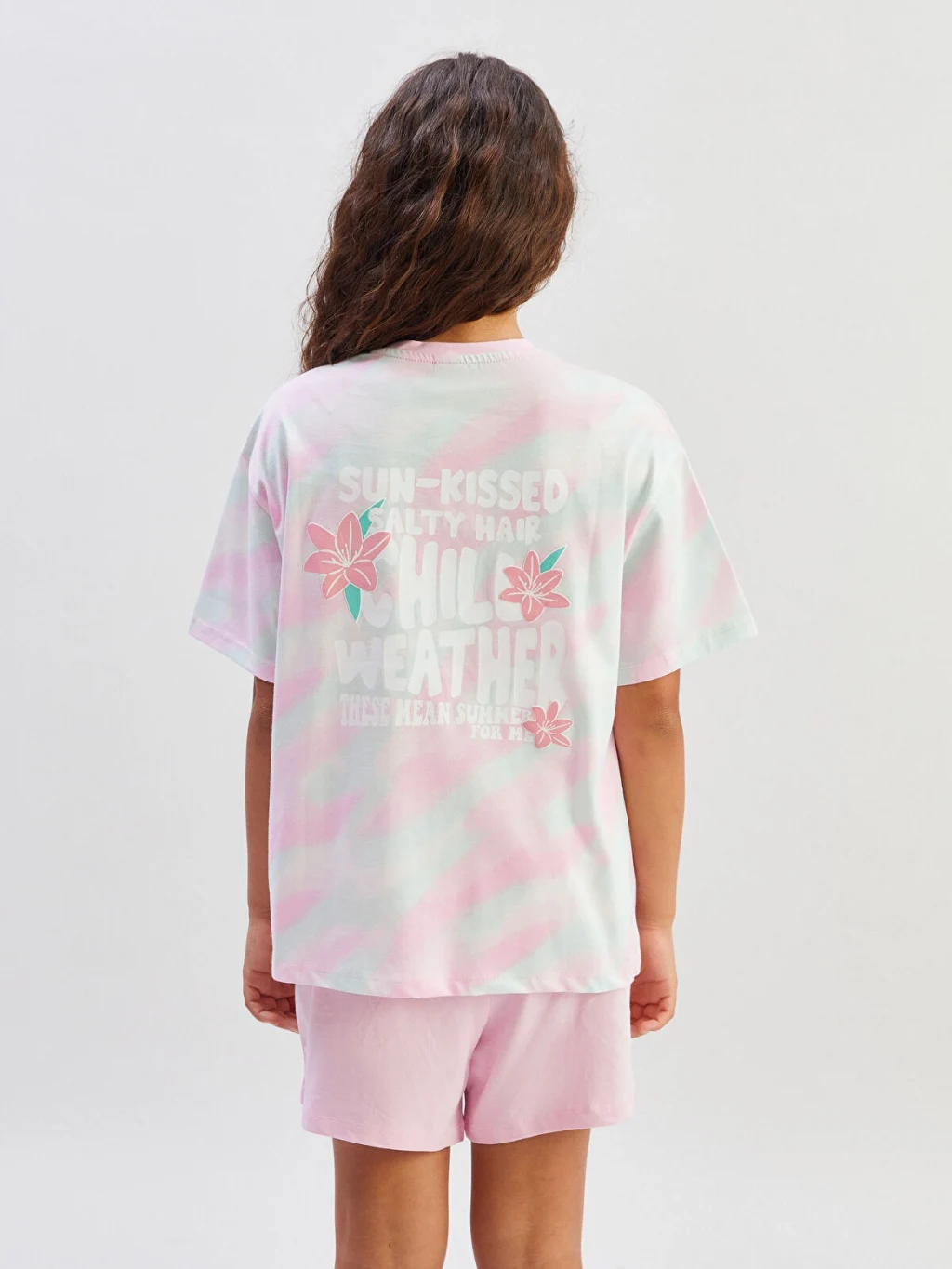 Pamuklu kumaştan üretilmiş, kısa kollu tişört önde ve sırtında baskılı tasarıma sahiptir.