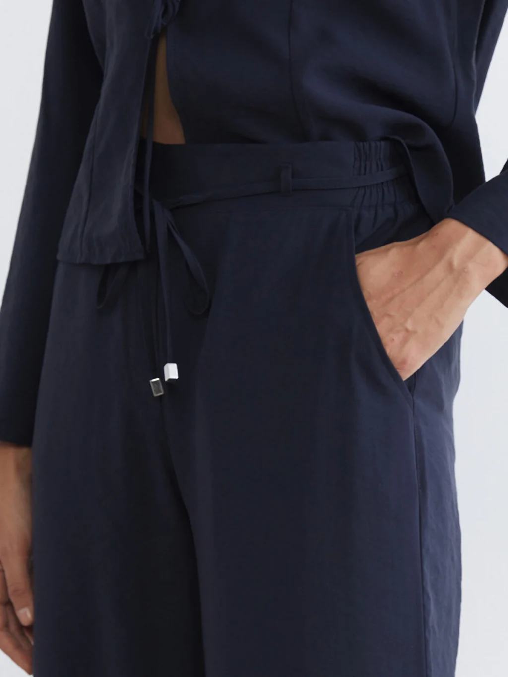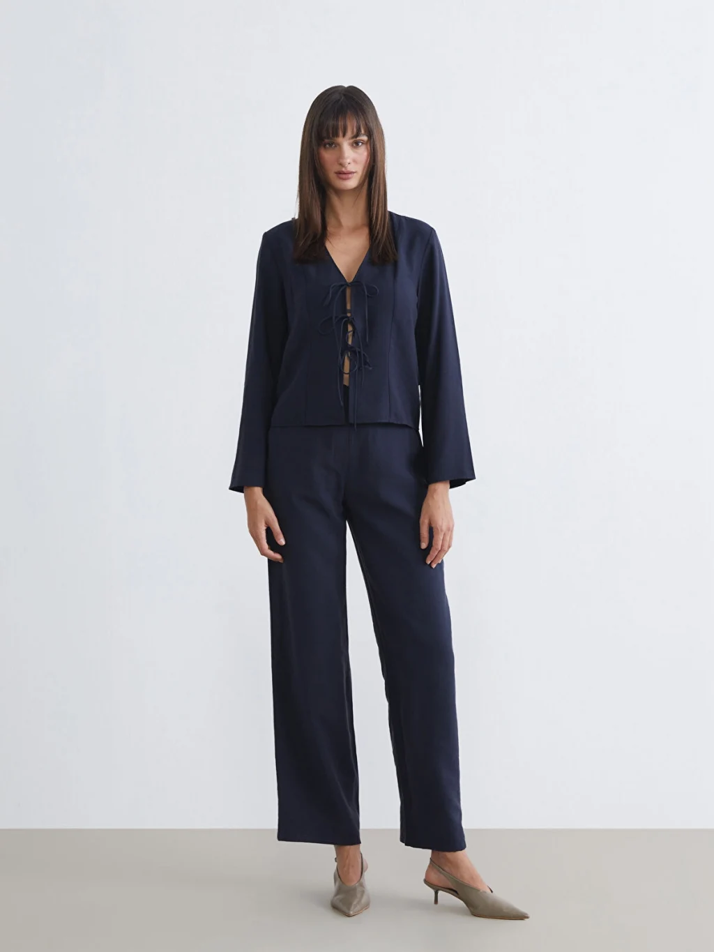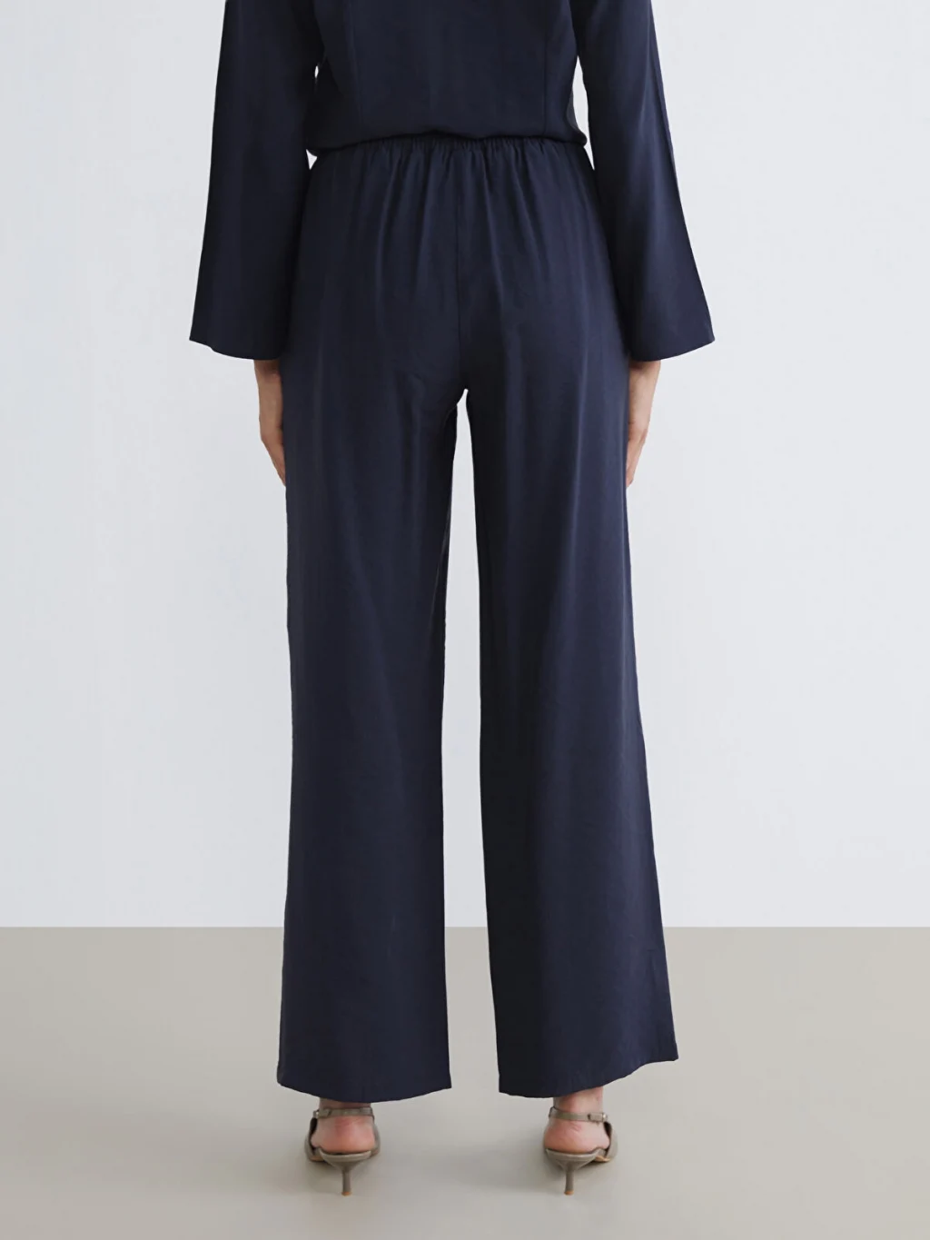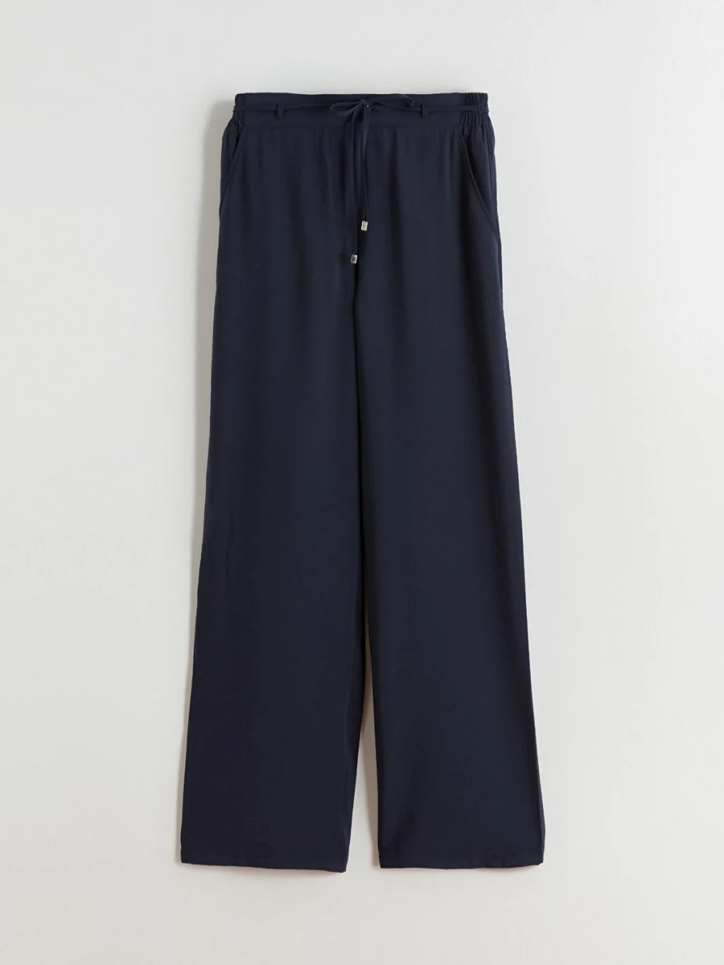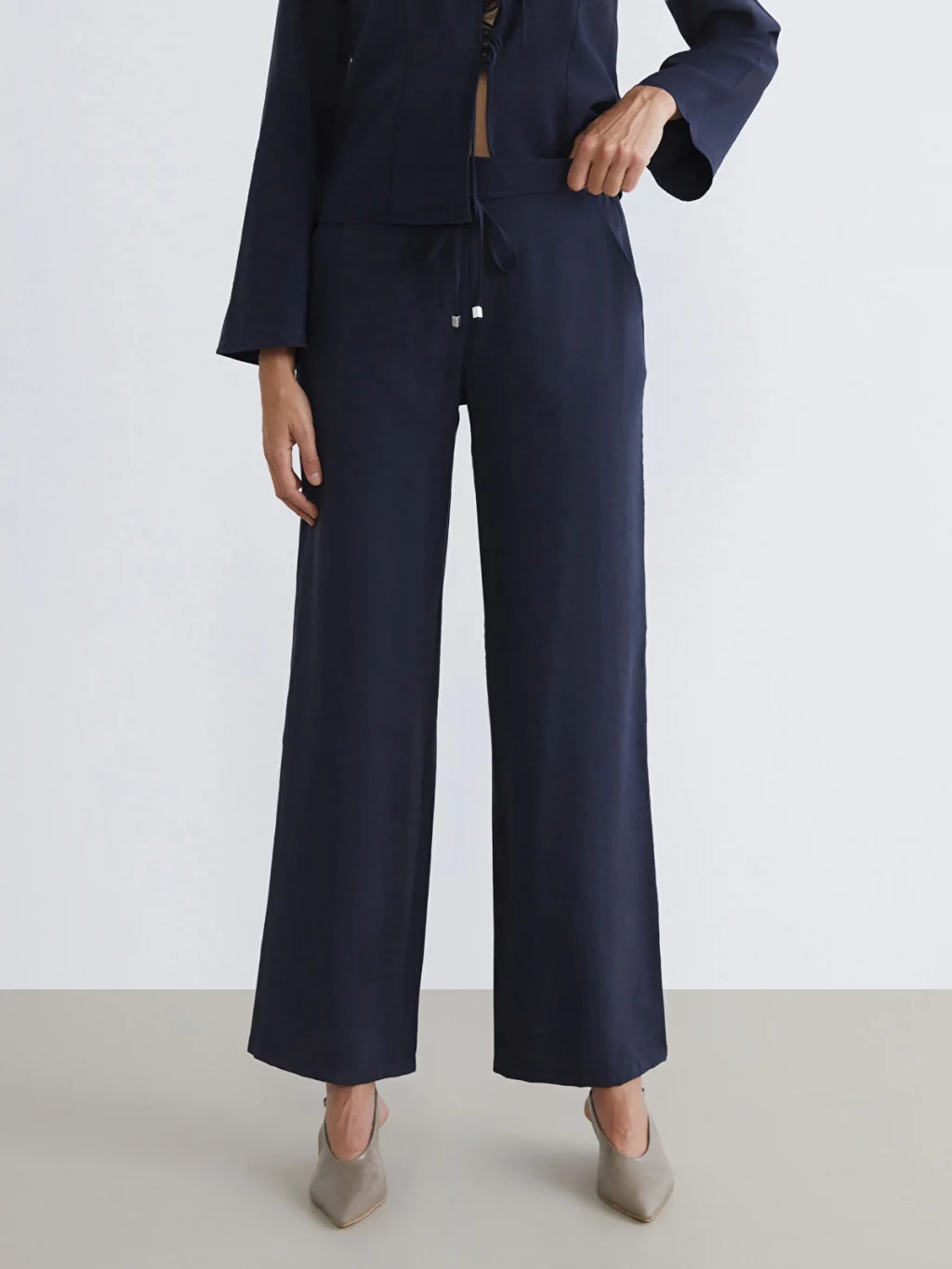 Bol kalıplı kadın pantolon, beli lastikli ve ayarlanabilir bağcıklıdır. Geniş paçalı tasarıma ve yan ceplere sahiptir.