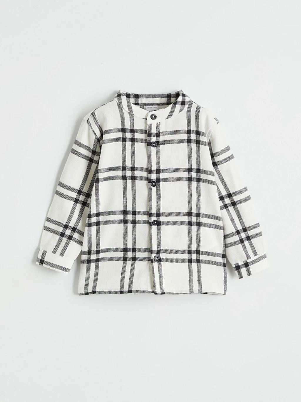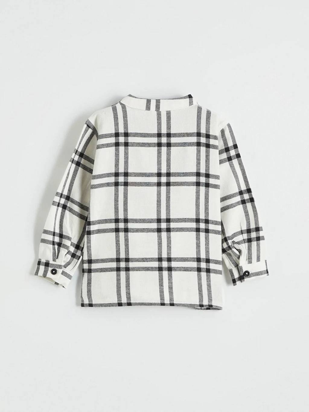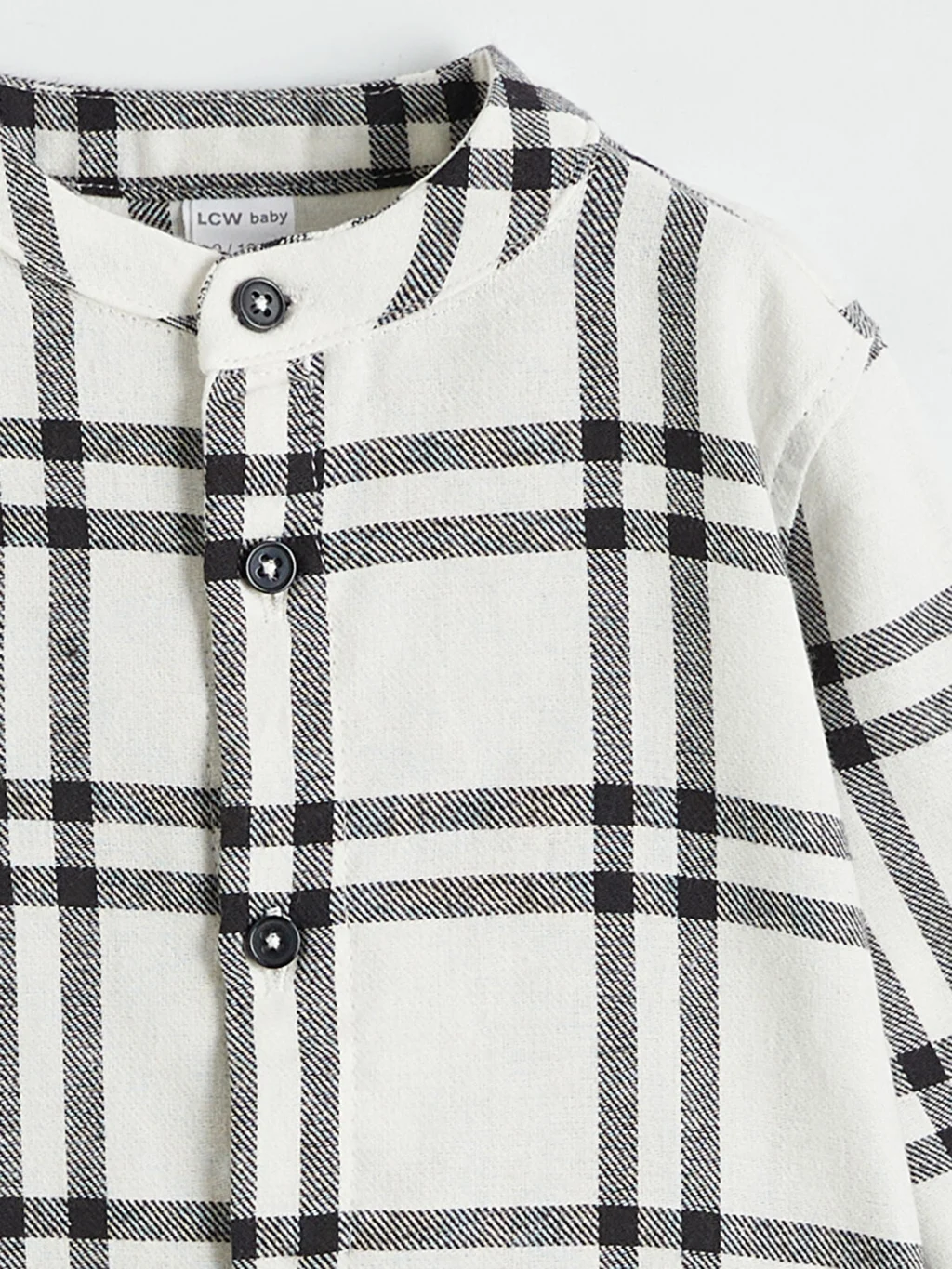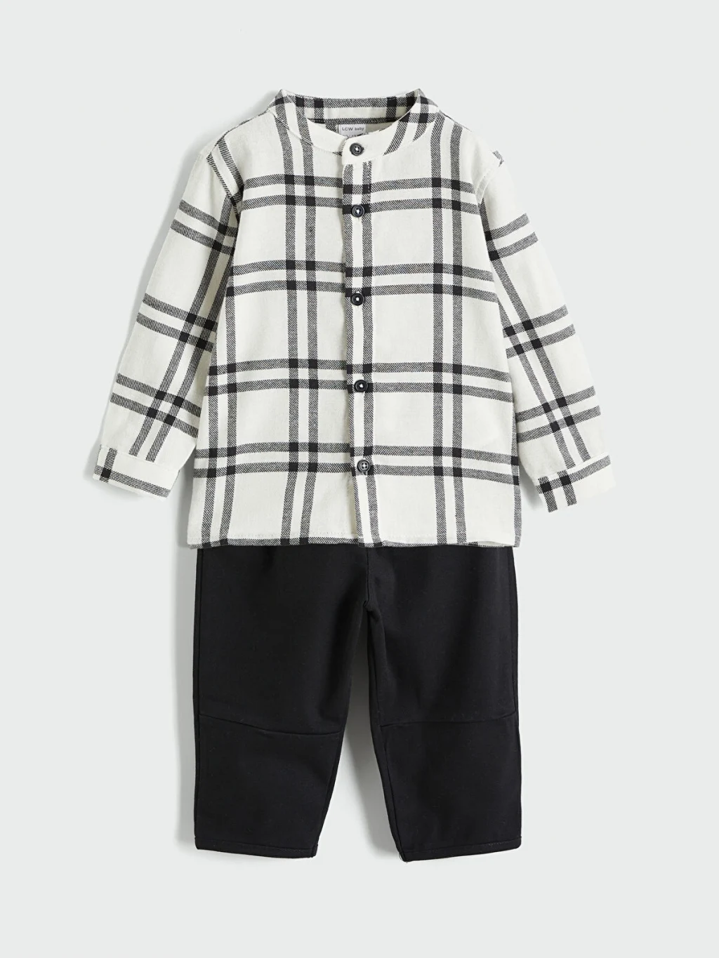 Erkek bebek takım, hakim yakalı, uzun kollu, ekose desenli gömlek ve pantolondan oluşur. Gömlek önden düğme kapamalıdır.